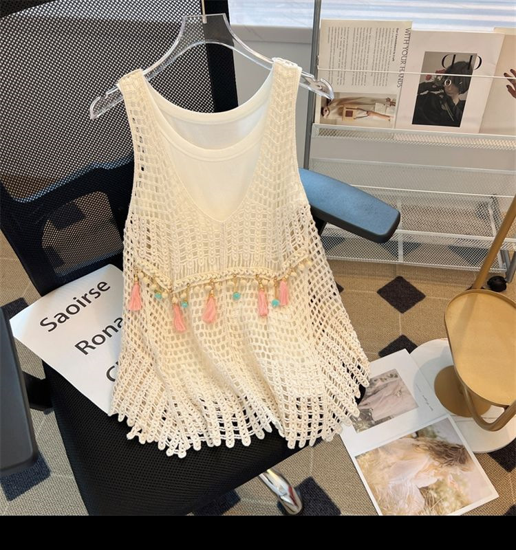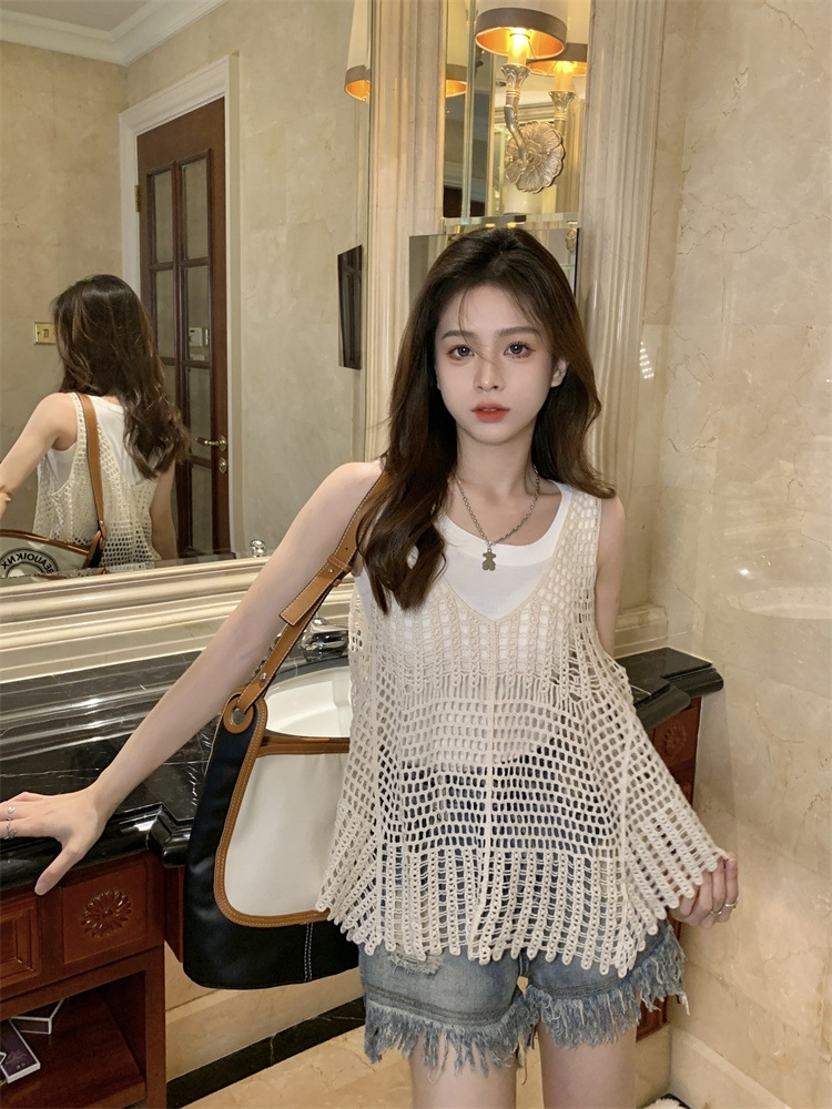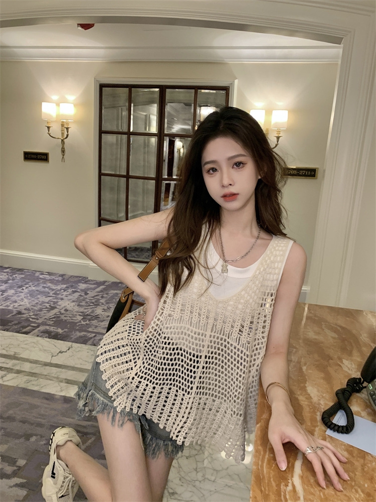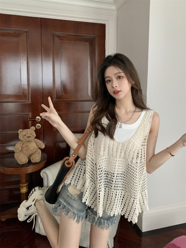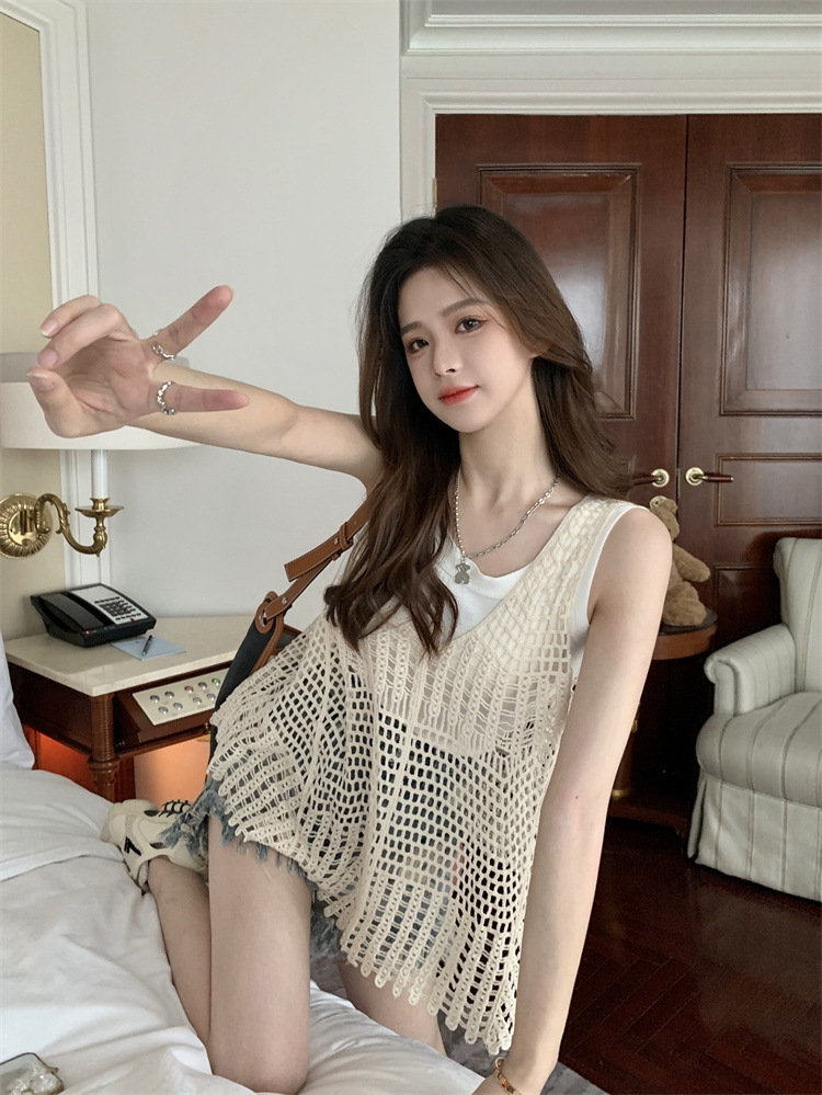 Вязаный крючком полый вязаный жилет женский топ, винтажная Свободная блузка без рукавов, летний крутой стиль