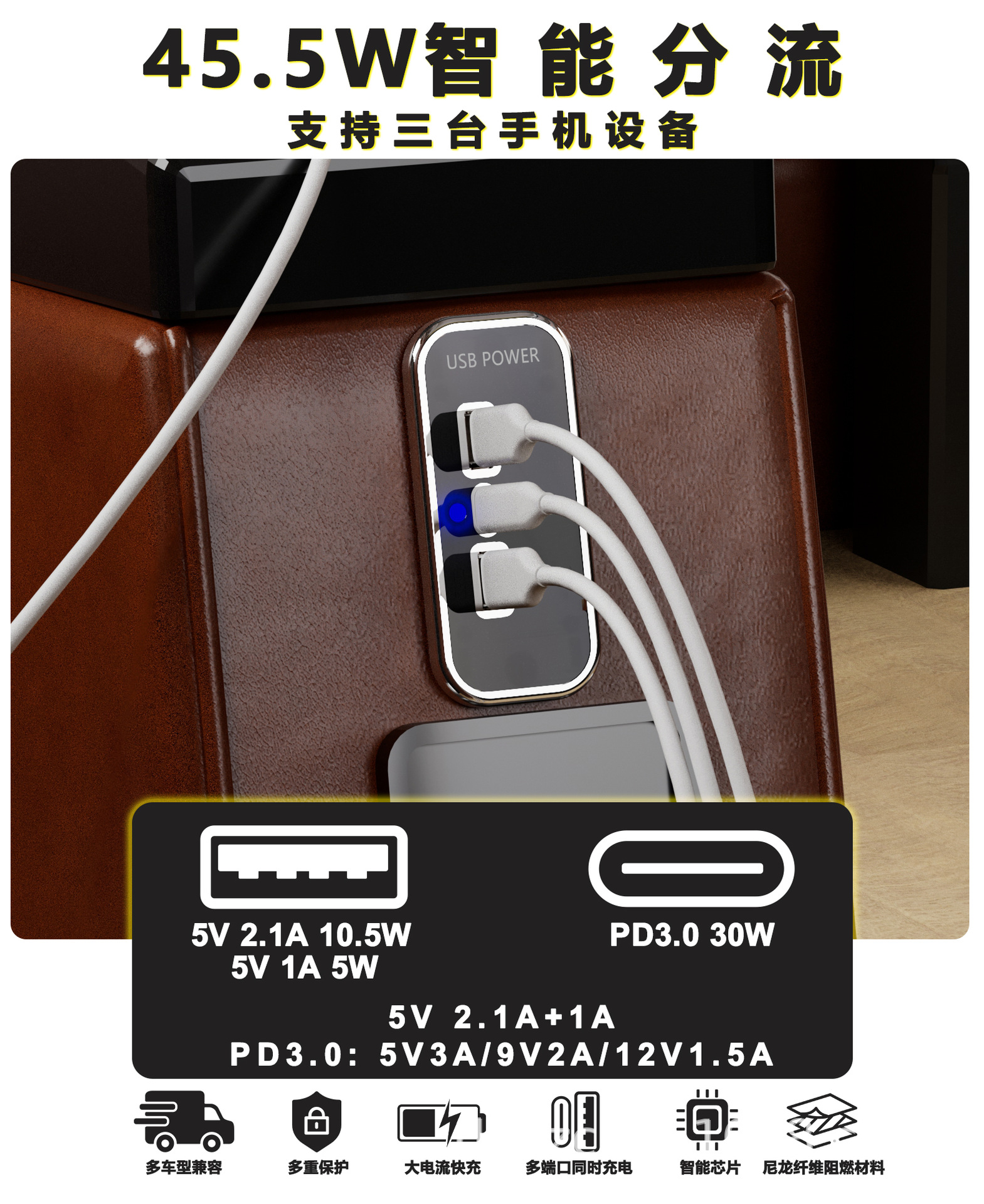 Три порта зарядки Type-CPD3.0 + двойной USB5V3.1A; Быстрая зарядка, двойной порт USB QC3.0+ Type-C PD3.0; Двухпортовый USB 5 В 3,1 А; Двойной порт, двойной Type-C 5В 4.8А; Двухсторонний разъем, три порта для зарядки: Type-C PD3.0 + двойной USB 5V3.1A; Двухсторонний разъем, быстрая зарядка с двумя портами USB QC3.0 + Type-C PD3.0; Быстрая зарядка, три порта для зарядки Type-CPD3.0+ USBQC3.0+ USB5V2.4A; Двойной порт Type-C+ USB 5 В 4,8 А; Двойной порт, двойной USB 5 В, 4,8 А; 2USB-A+Type-c