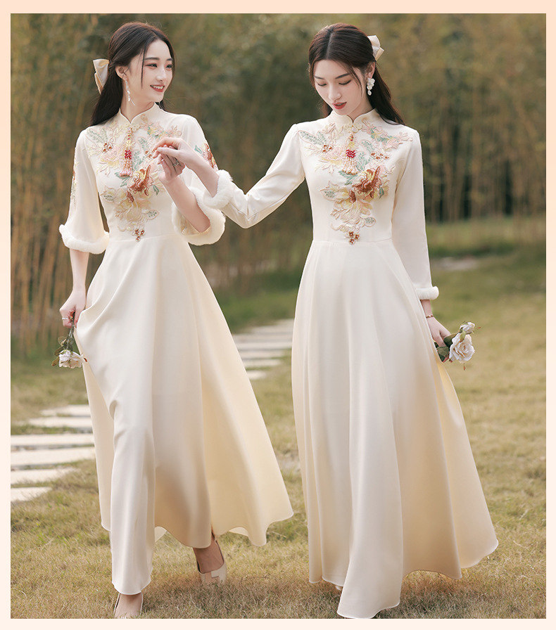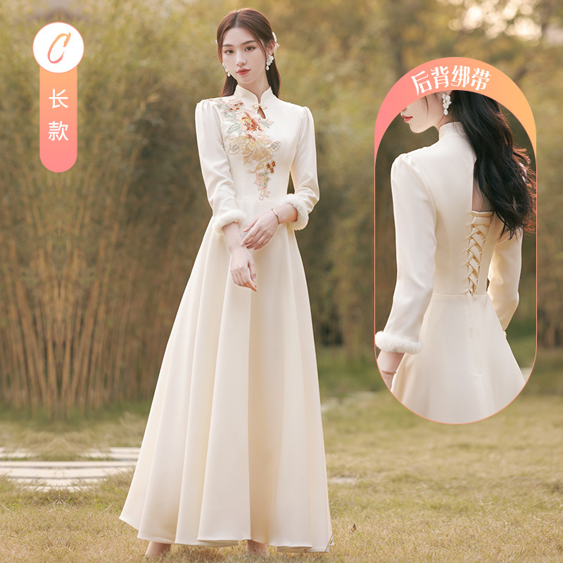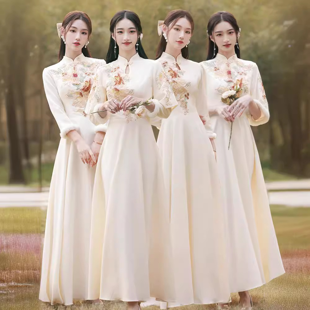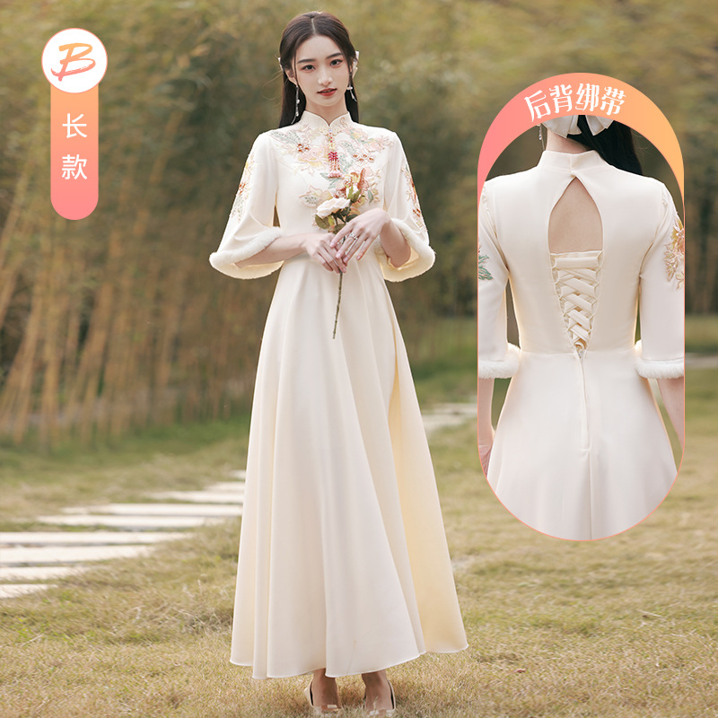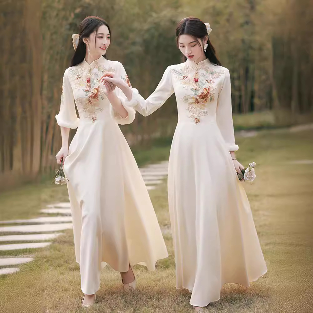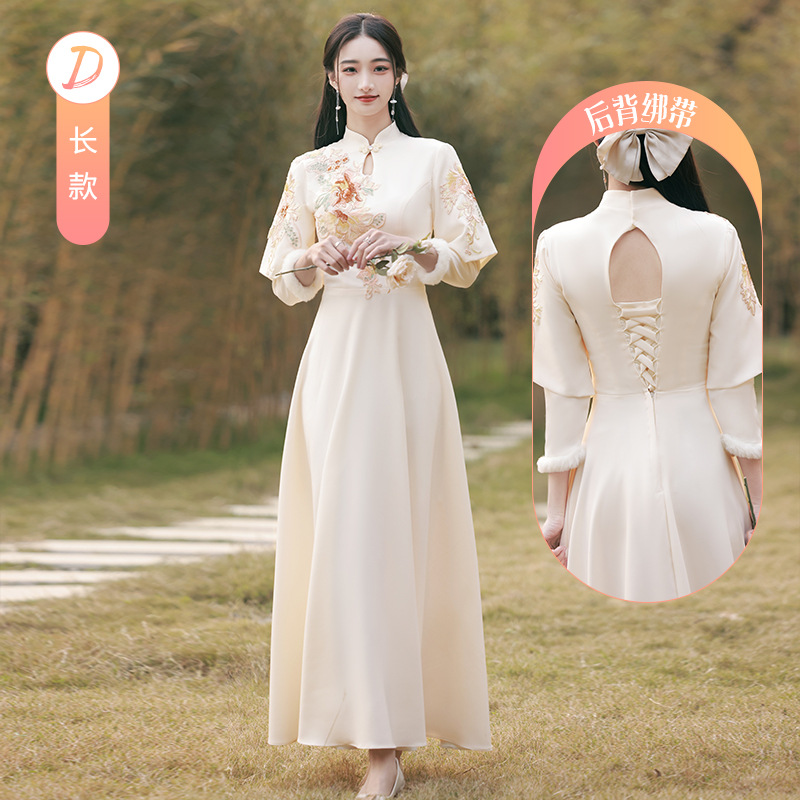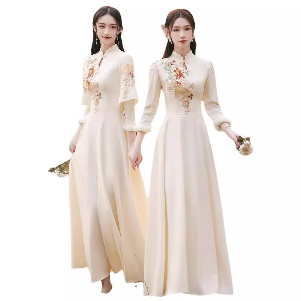 Шампанское цвет одежды для невесты летний китайский стиль чонсам 2024 новый сестринский темперамент платье женский утолщенный теплый длинный рукав