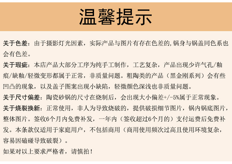 重要提示:请勿在电磁炉上,电炉或电陶炉上进行空烧,干烧,煎炒炸或任何需要收汁的做法,这些或类似的使用方法行为不在售后范围内!拍下即默认已知晓本店的条款!