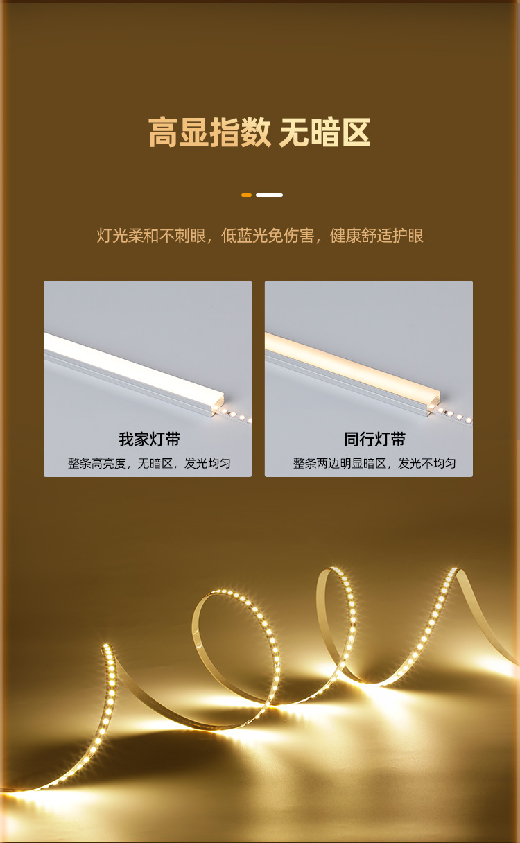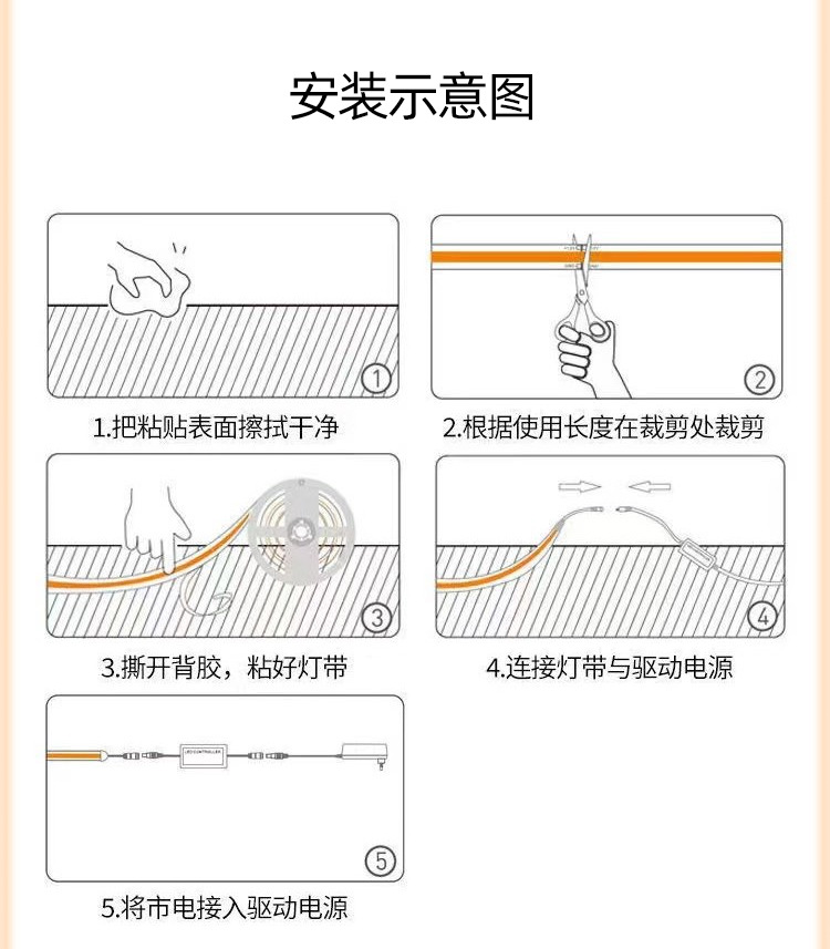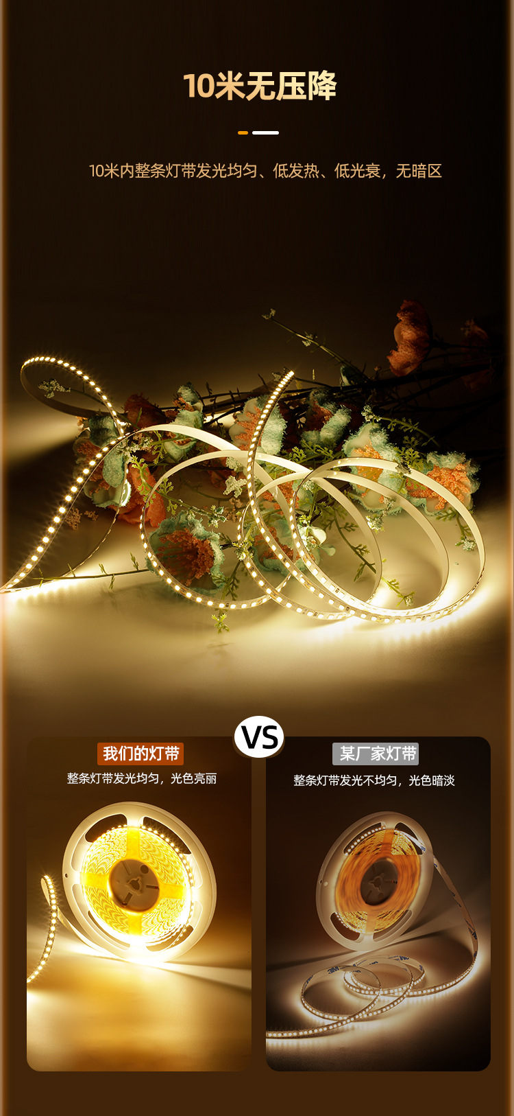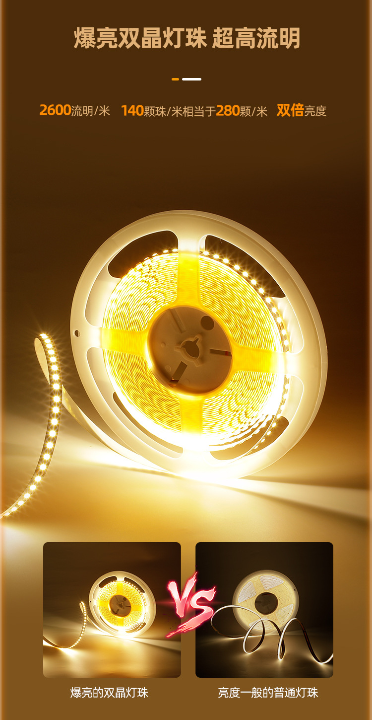 特别注意:整卷试亮时,不要亮太长时间,因为盘在一起,灯带不散热,容易过热损坏灯带。散开后是不会有问题的。cob灯