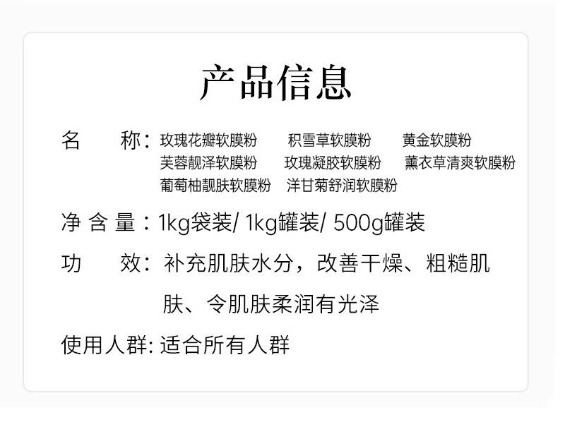 Мягкая маска-пудра с розой 200г; Цзы Цзы порошок 150г; Цзы Цзы порошок 500г; Цзы Цзы порошок 900г; Эссенция гиалуроновой кислоты + инструмент для корректировки маски; Золотая мягкая маска-пудра 900г; Мягкая маска-пудра из центеллы азиатской 900г; Мягкая маска-пудра Rose Beauty 900г; Успокаивающая маска-порошок с ромашкой 900г; Мягкая маска-порошок из полыни 900г; Мягкая маска-пудра из бамбукового угля и вулканической грязи, 900 г; Мягкая маска-пудра Мята 900г; Мягкая увлажняющая маска с гиалуроновой кислотой, порошок 900г; Увлажняющая и украшающая ледяная маска-пудра 900г.; Мягкая маска-пудра Лаванда 900г; Qizi травяная мягкая маска-порошок 900г; Золотая мягкая маска-пудра 900г (в комплекте эссенция + инструмент для регулировки маски); Мягкая маска-пудра Centella asiatica 900г (в комплекте эссенция + инструмент для регулировки маски); Rose Beauty Soft Mask Powder 900 г (в комплект входит эссенция + инструмент для регулировки маски); Мягкая маска-порошок «Ромашка» 900г (в комплекте эссенция + инструмент для регулировки маски); Мягкая маска-порошок из бамбукового угля и вулканической грязи, 900 г (в комплект входит эссенция + инструмент для регулировки маски); Мягкая маска-пудра Mint 900 г (в комплект входит эссенция + инструмент для регулировки маски); Увлажняющая мягкая маска-пудра с гиалуроновой кислотой 900 г (в комплекте эссенция + инструмент для регулировки маски); Увлажняющая и украшающая пудра для ледяной маски 900 г (в комплекте эссенция + инструмент для регулировки маски)