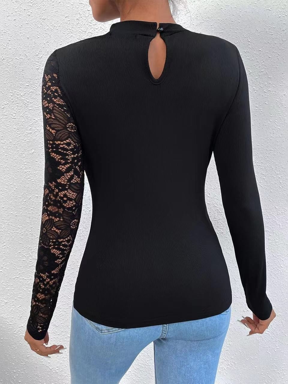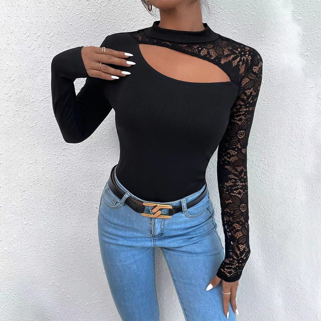Весна и осень 2023 Кружевная футболка с длинным рукавом Amazon с высоким воротником, Женская Сексуальная футболка