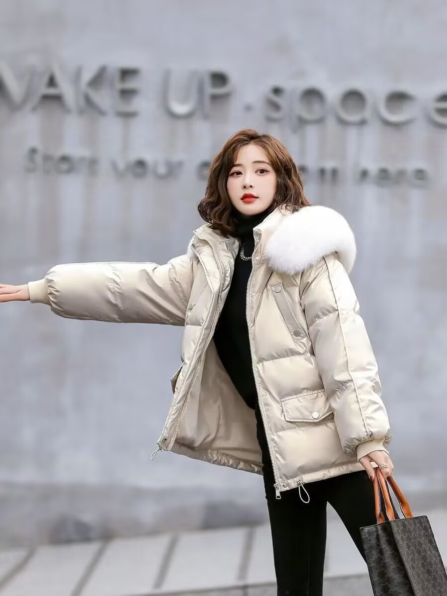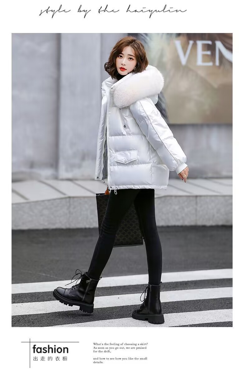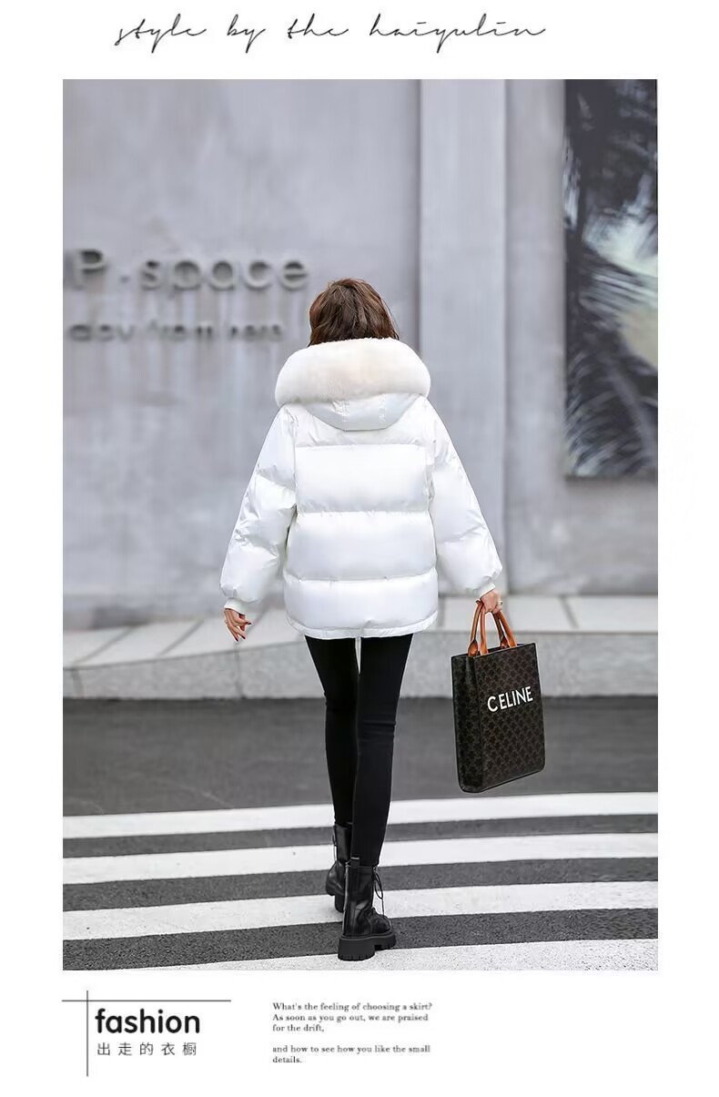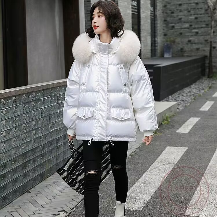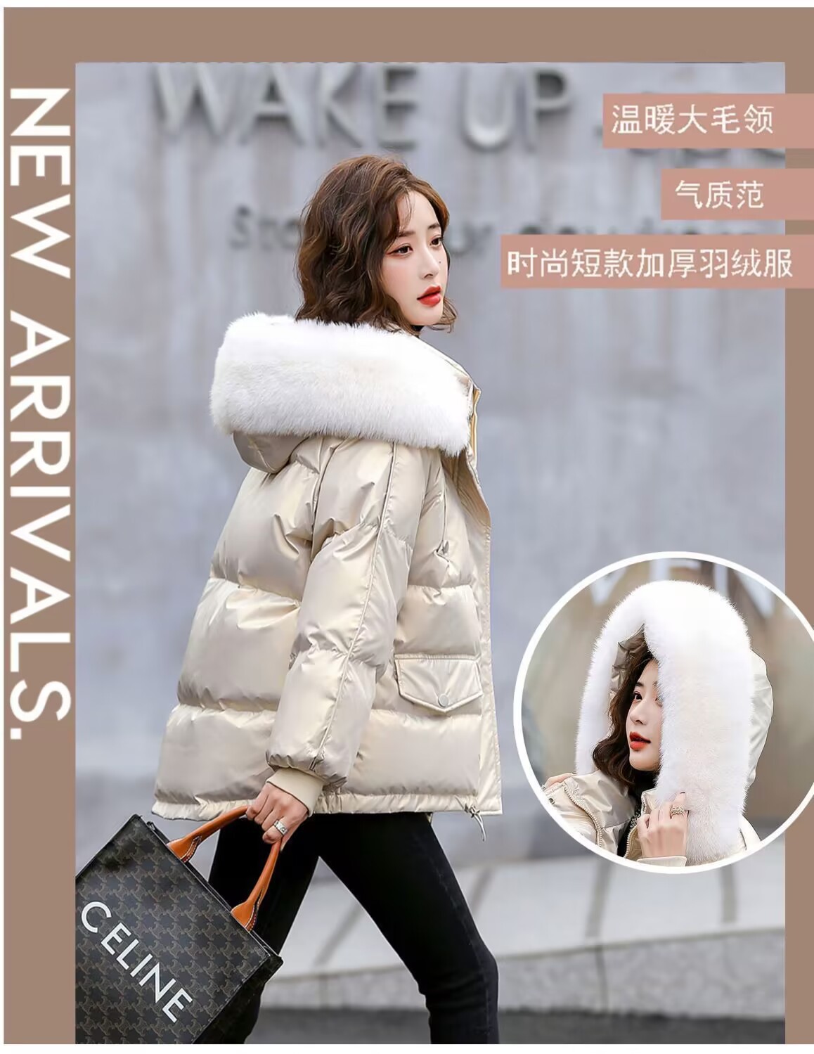Пуховик яркий женский короткий корейский модный большой меховой воротник без стирки, свободная одежда для хлеба, взрыв, белое толстое пальто на утином пуху