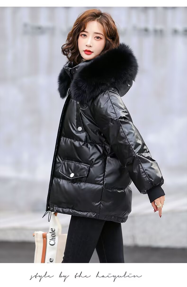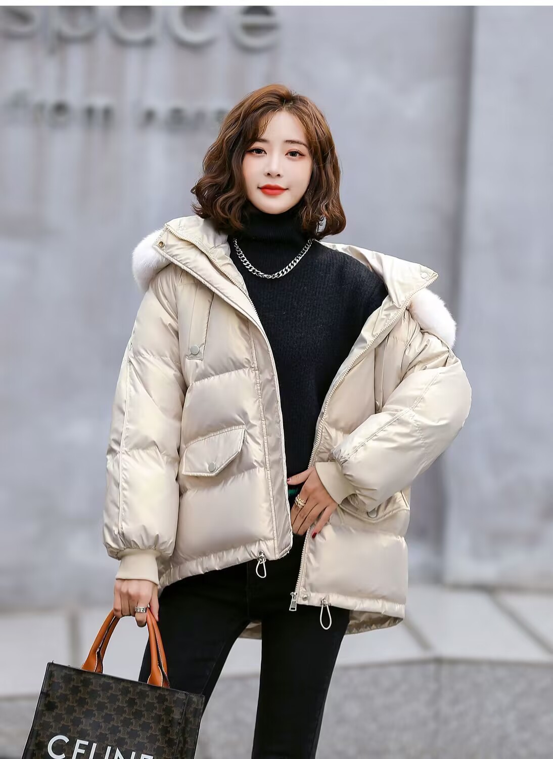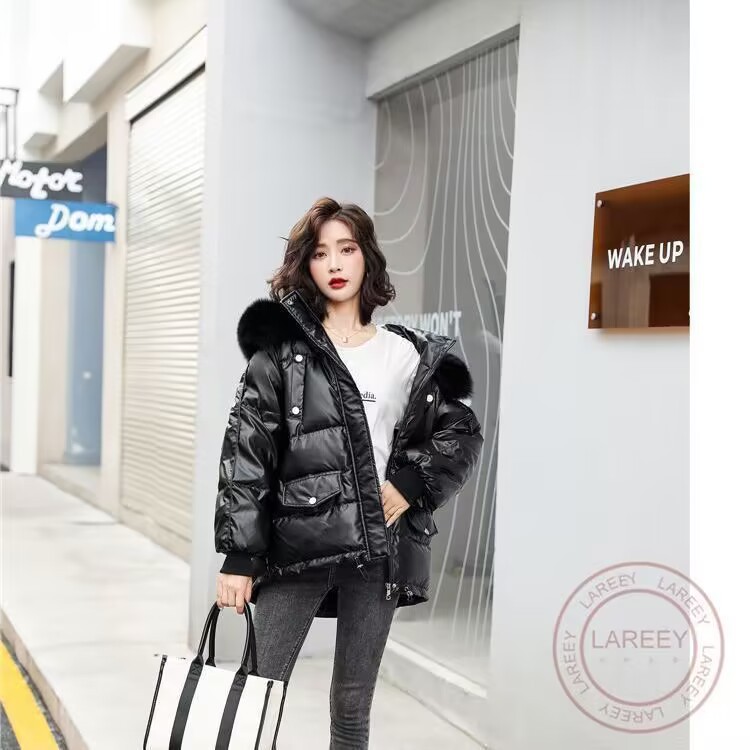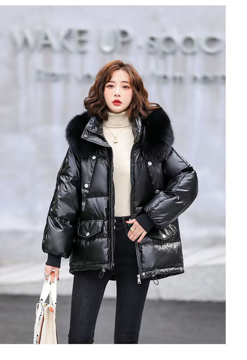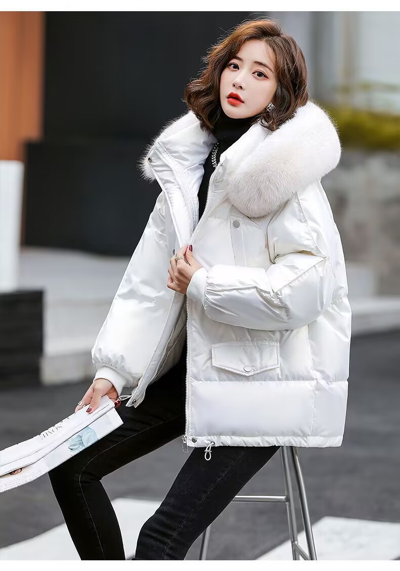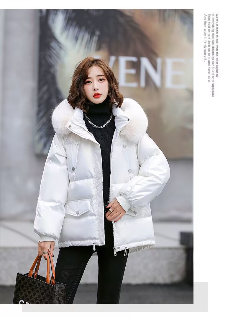 Пуховик яркий женский короткий корейский модный большой меховой воротник без стирки, свободная одежда для хлеба, взрыв, белое толстое пальто на утином пуху