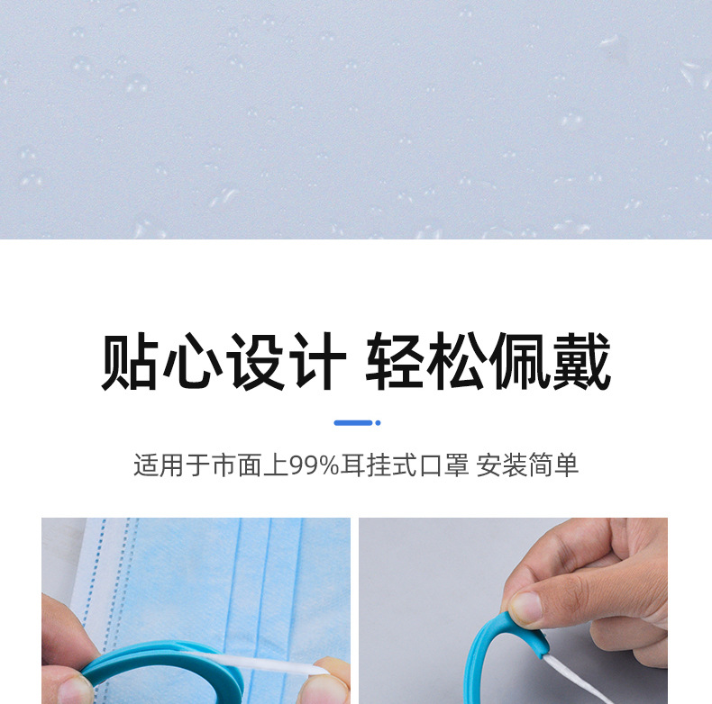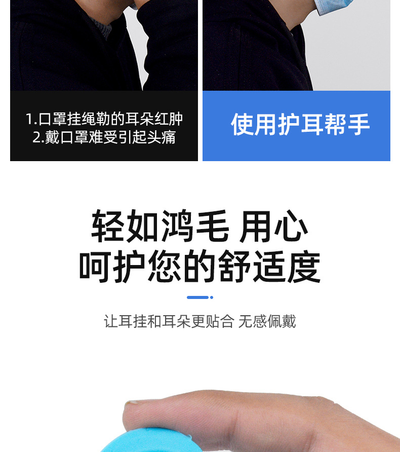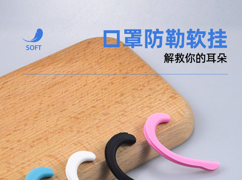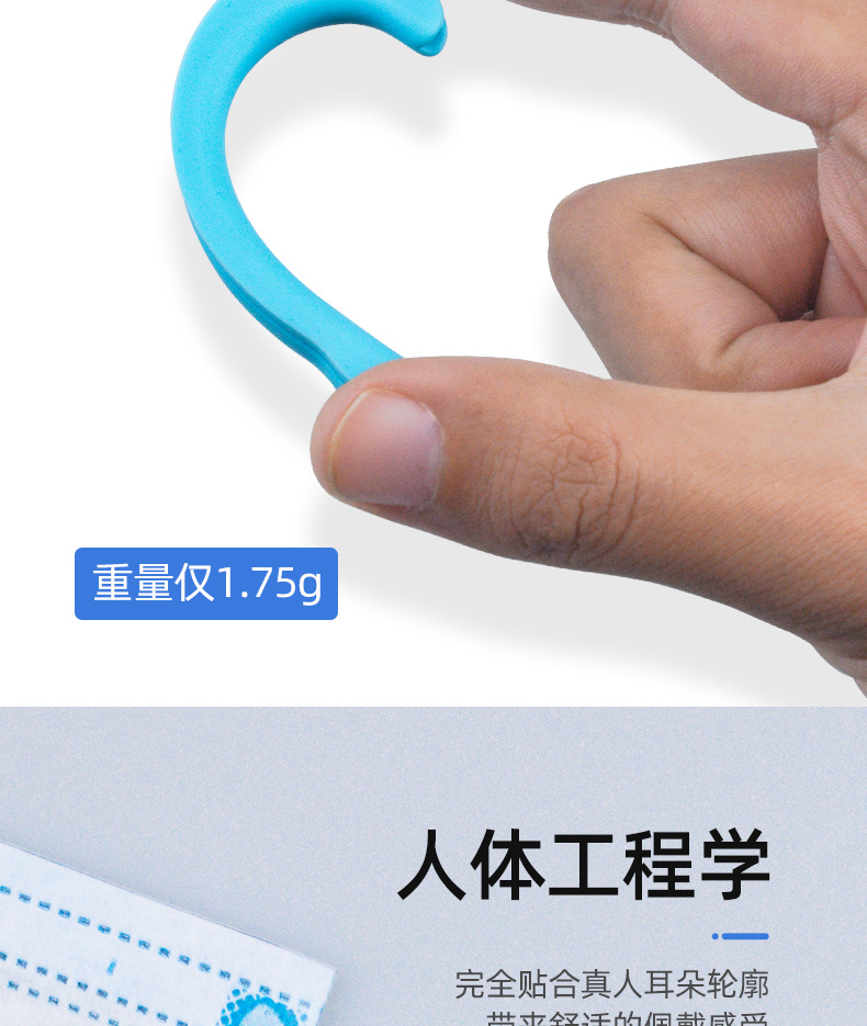 6、这次我们的耳挂却改变着一现状:首先考虑了耳廓,加长了耳挂的长度,可以使得在大多时候,都不会轻易掉落,采用特制硅胶,软硬度非常适中,表皮特殊处理,极少毛刺或者尖锐地方,不会伤害到耳朵和手指,根据耳形的生理构造,是一款符合耳朵形状设计的一款耳挂,
