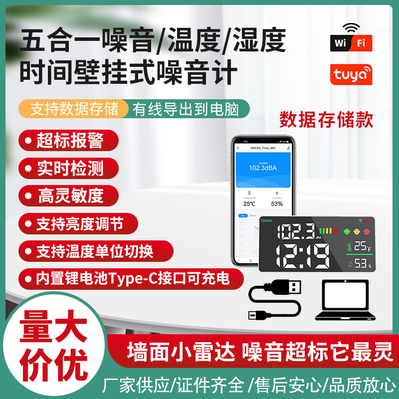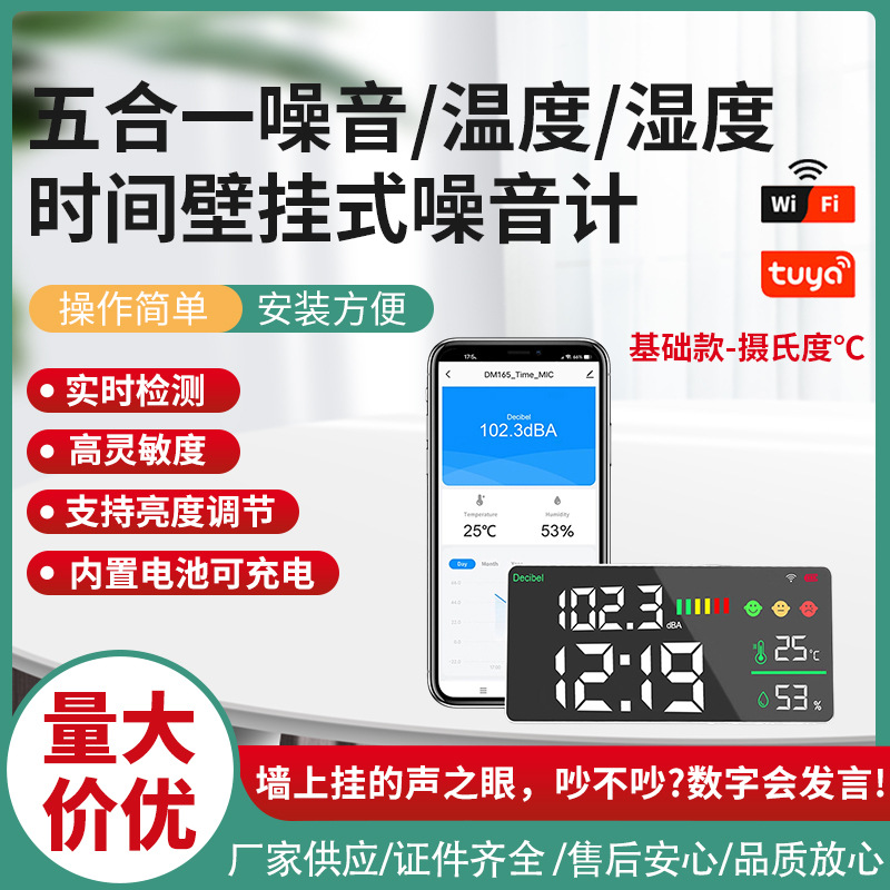 This product is a sound level decibel noise meter 5 in One . It adopts advanced acoustic sensors and precise measurement technology,real-time display noise, time ,temperature and humidity on its LED screen . It is with the 3-color emoji and bar symbols, which visualizes the noise level.It doesn't take up space and can be easily hung on the wall. It not only measures datas in real time, but also supports intelligent connection and convenient operation through Tuya WiFi,After connecting your phone, you can view real-time data anytime and anywhere.It allows you to have a clear understanding of the noise level in order to take effective noise reduction measures,it creates a peaceful and comfortable environment for you, safeguarding your living and working space.