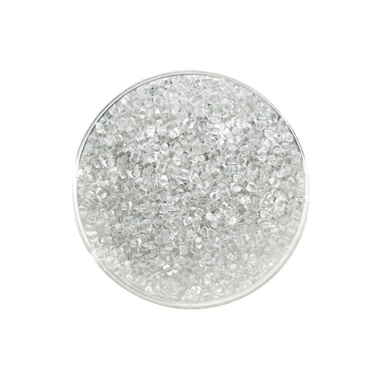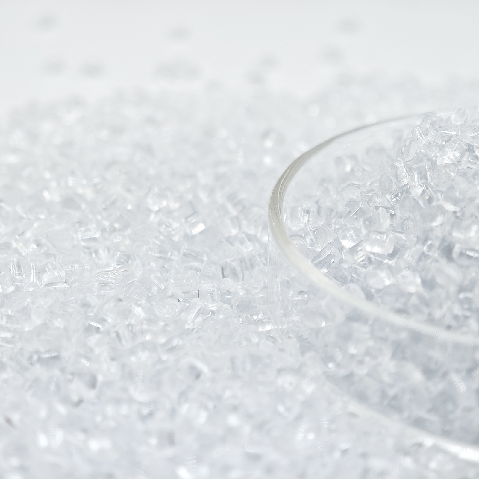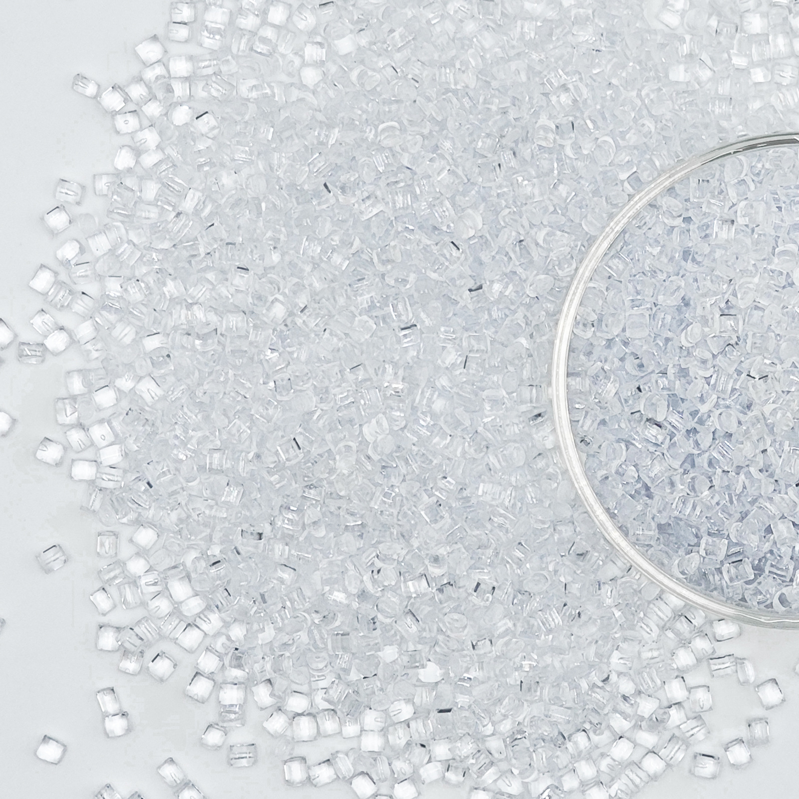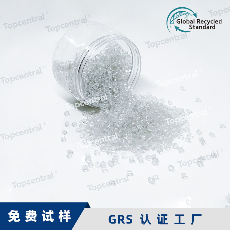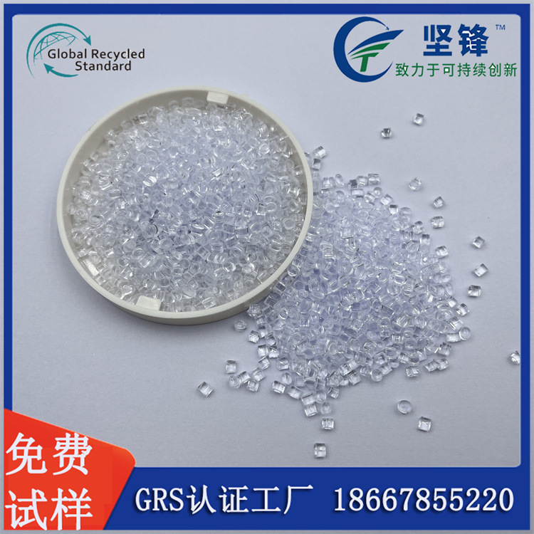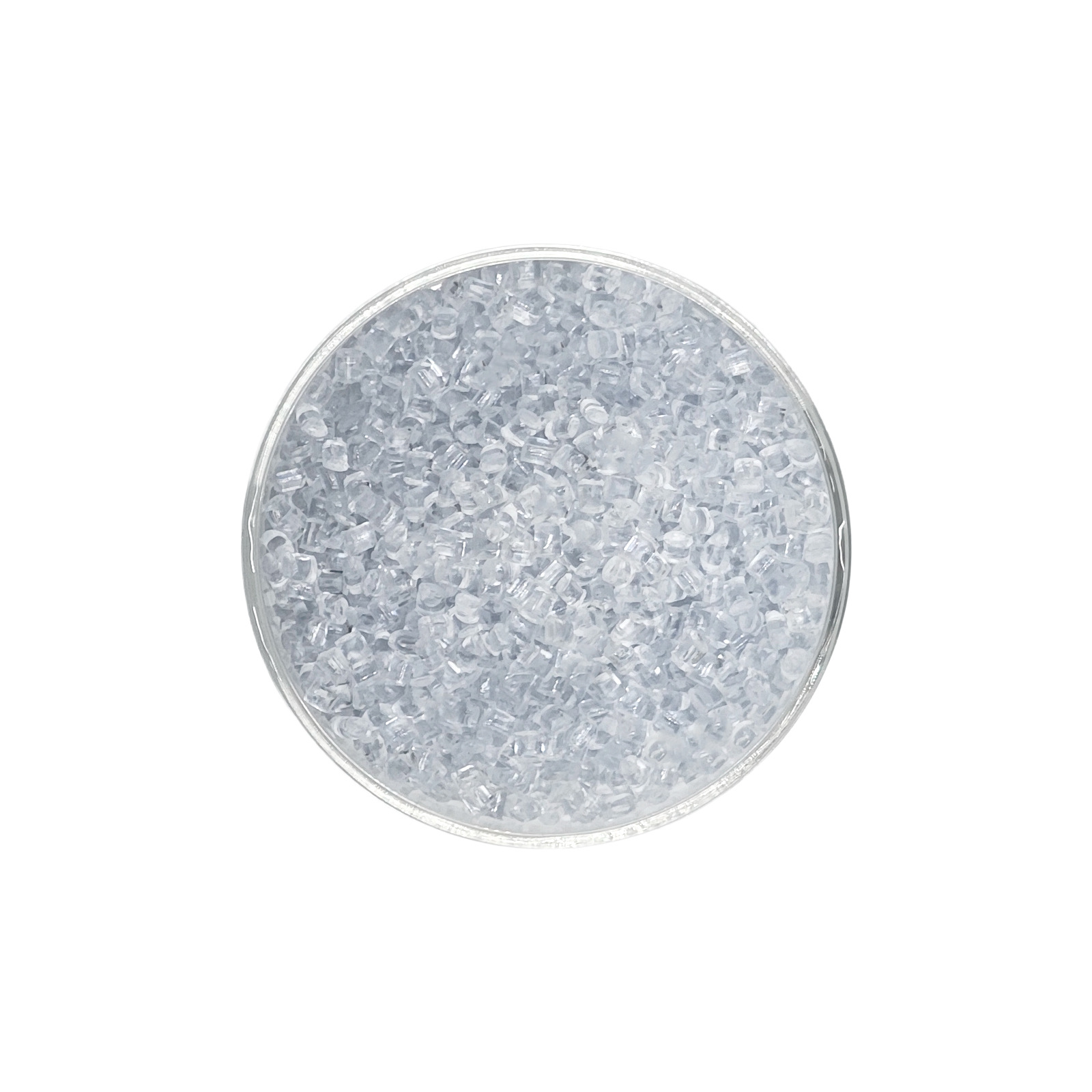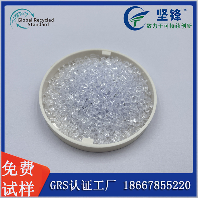Сертифицированные GRS гранулы из 100% переработанного модифицированного пластика PCR, прозрачные белые, светонепроницаемые, из переработанного поликарбоната.