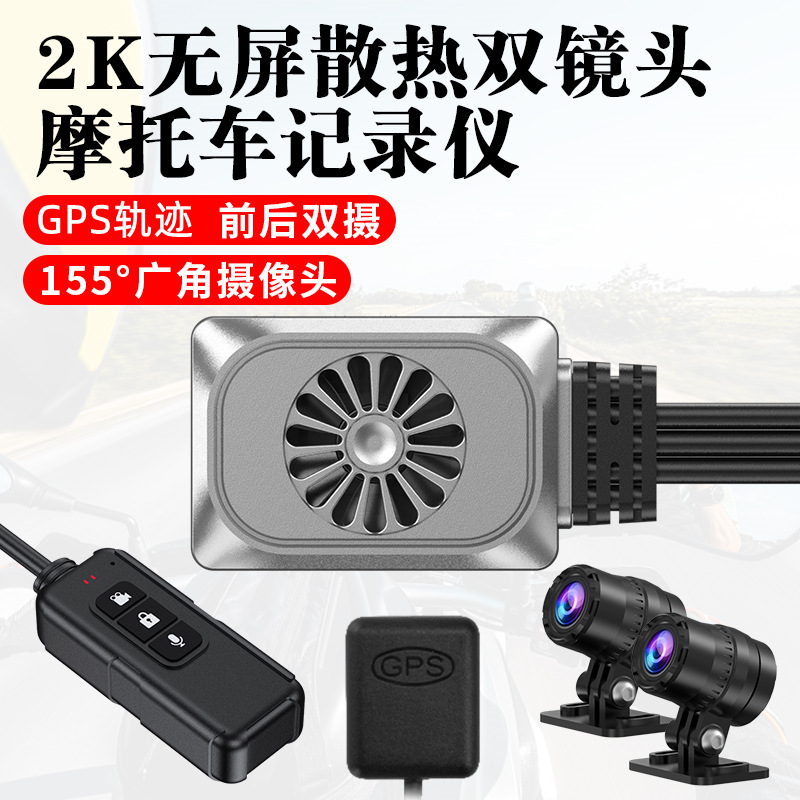 Мотоциклетный видеорегистратор без экрана, с двумя объективами 2K, с функцией охлаждения, GPS-трекингом, двойной записью спереди и сзади, проводным управлением и Wi-Fi.