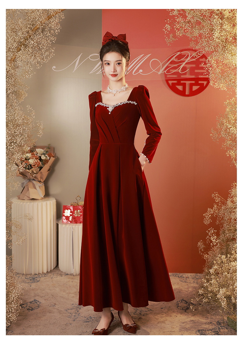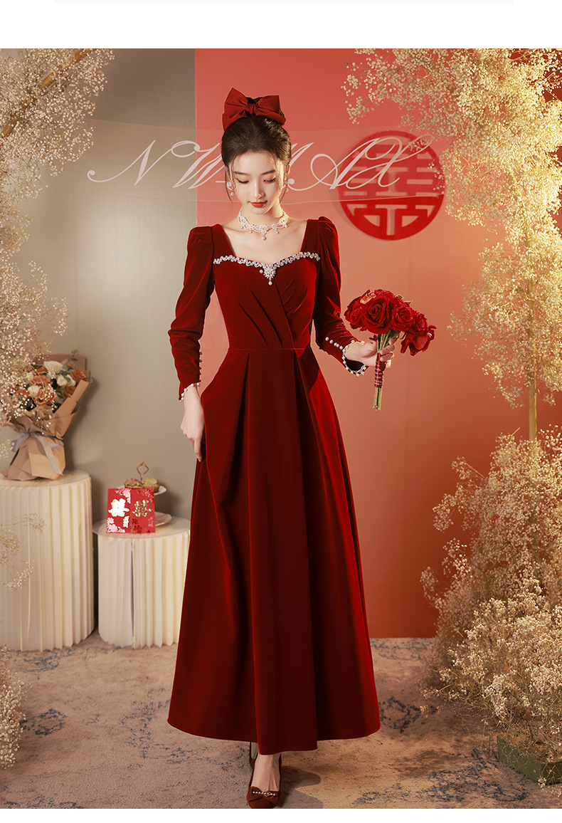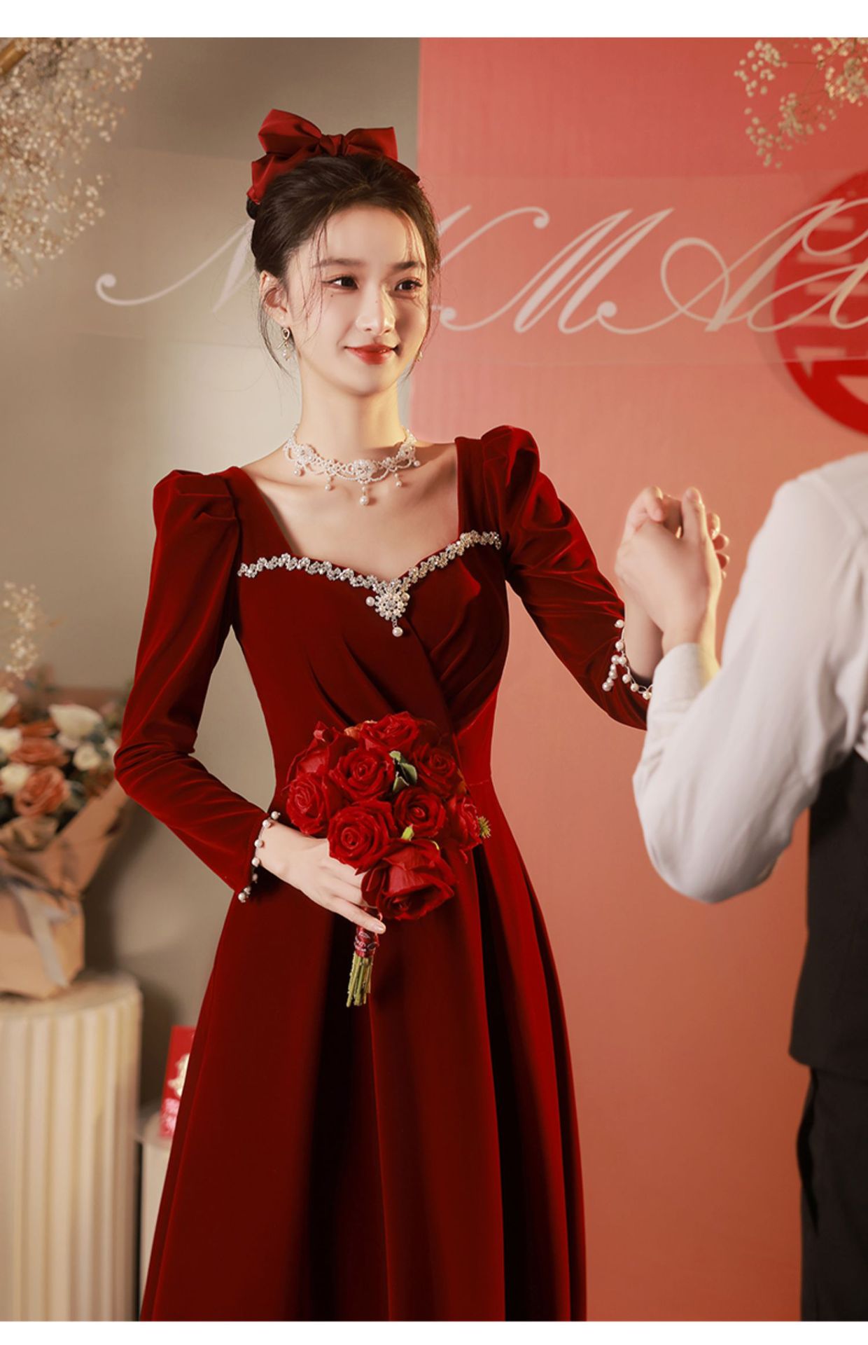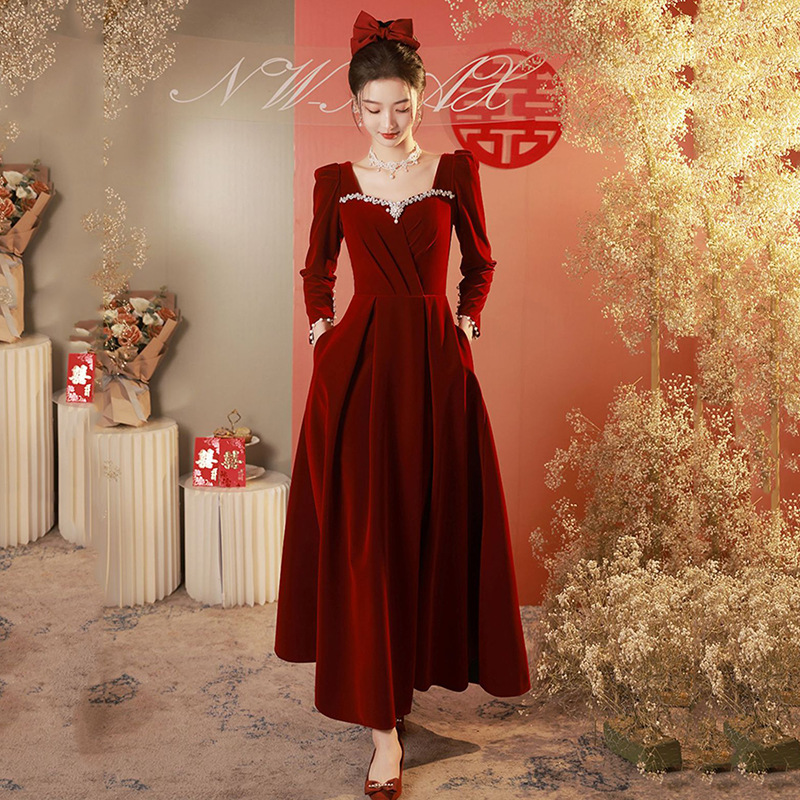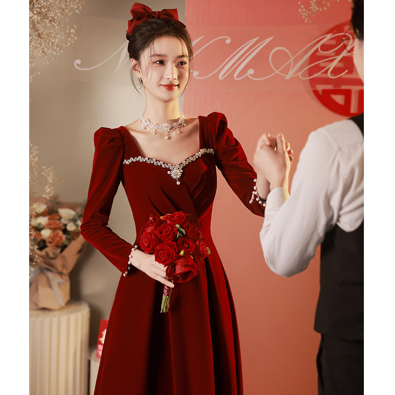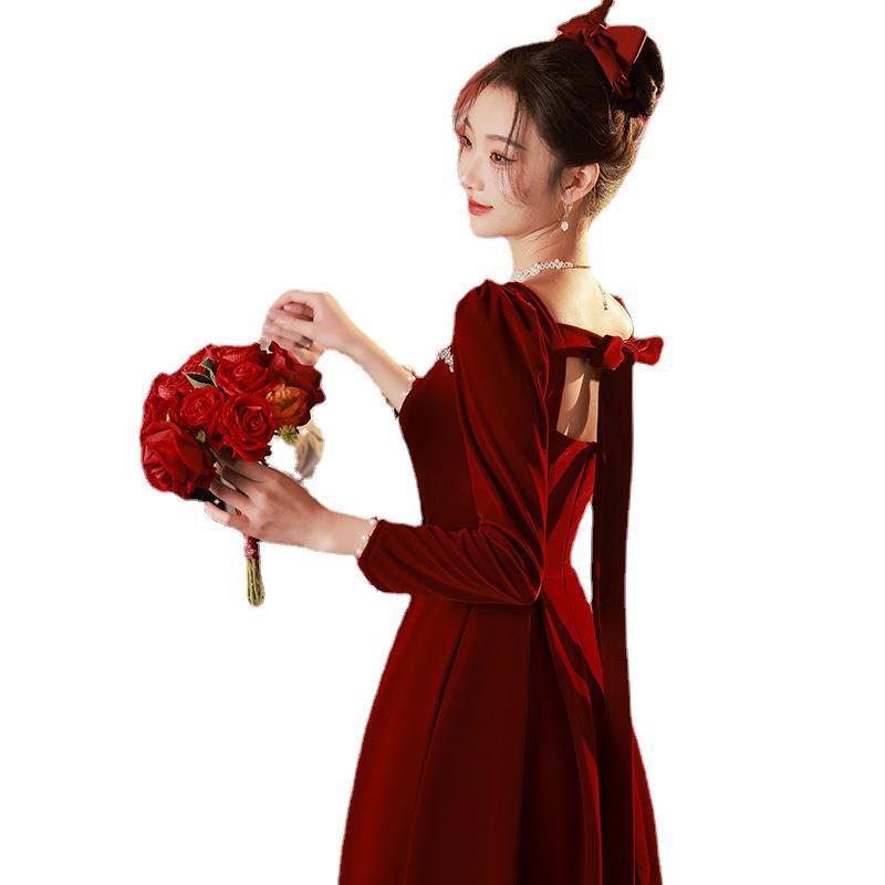 Одежда для тостов невесты, новинка 2025, бордовое обручальное платье на одно плечо, с длинным рукавом, бархатное свадебное привлекательное женское платье