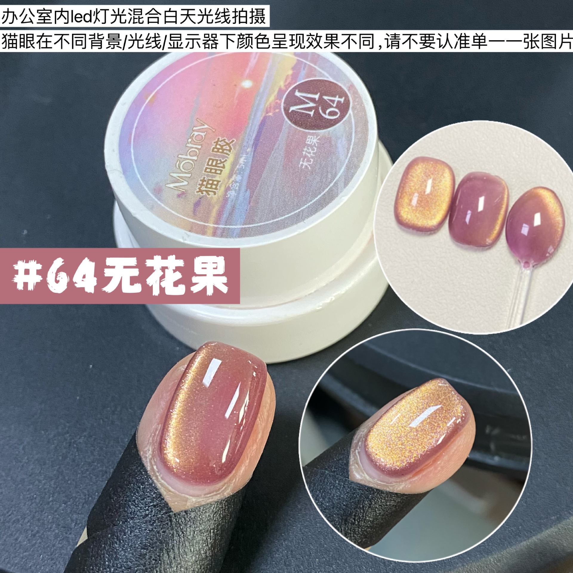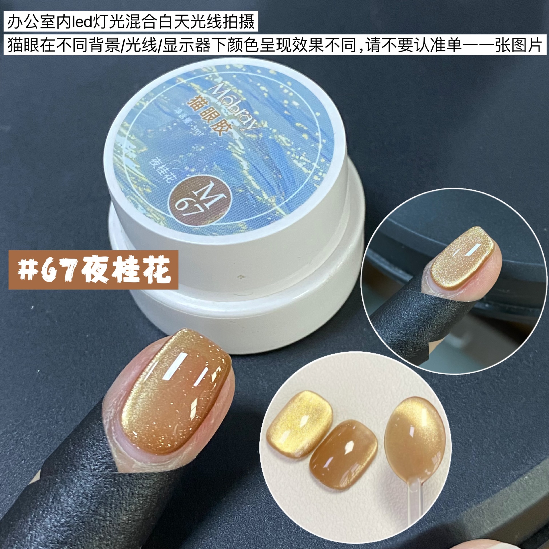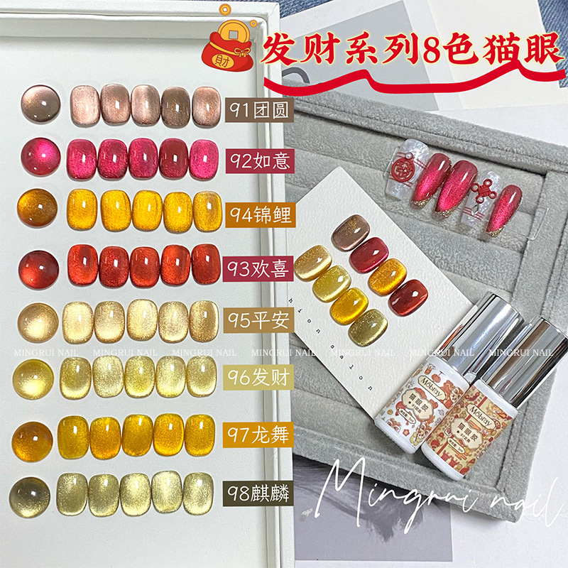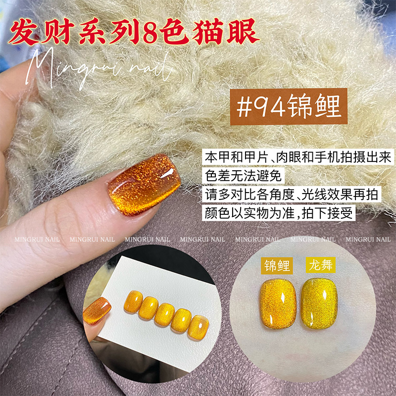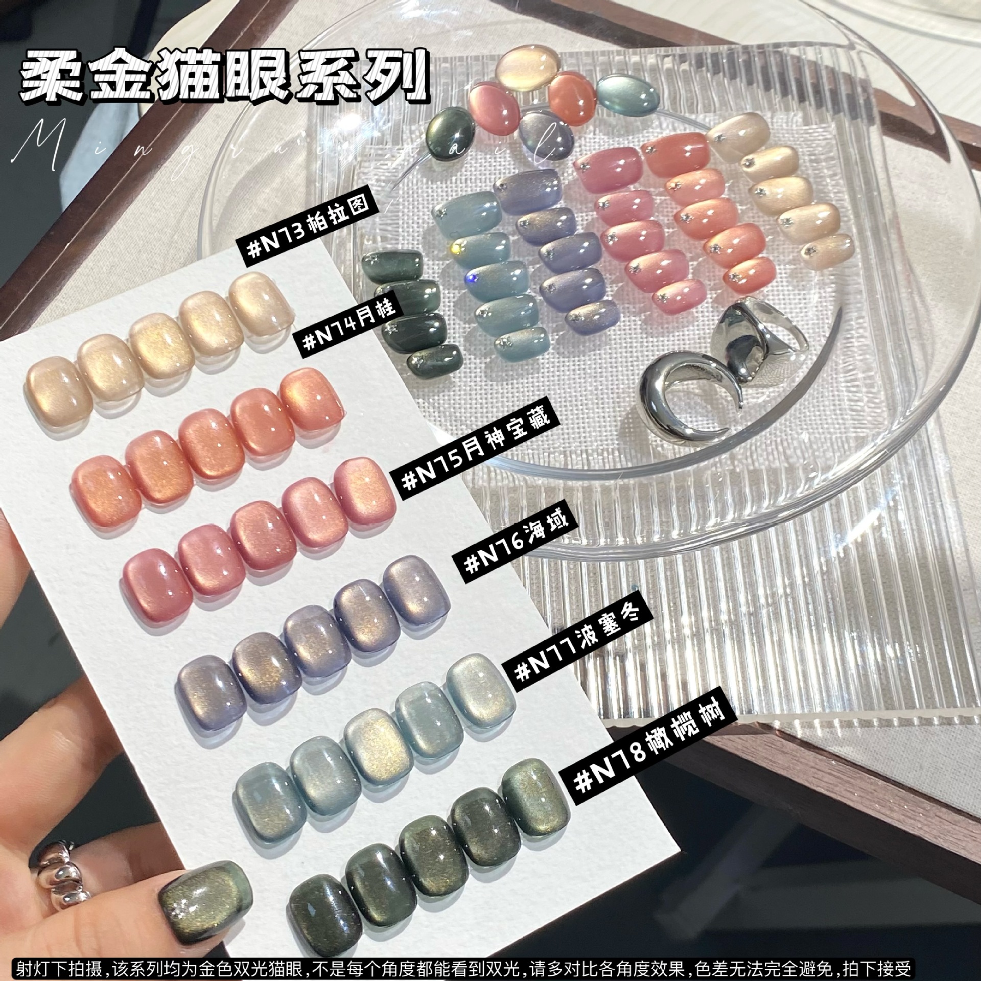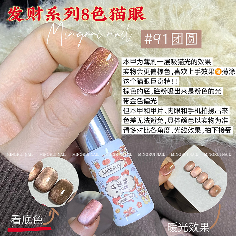 其中部分颜色M59桃夭、M73柔丽丝自带欧泊粉素材,仙气满满。M71日落限定是橙色偏光猫眼。M64无花果、M66焦茶、M67夜桂花、M68香槟为红茶棕色系猫眼,自带秋冬氛围感,磁粉不是单一的银色哦,跟市面上常规白光猫眼不一样,敬请品鉴。M60爱神之眼是很正的火龙果色猫眼,磁粉很细腻、M67野玫瑰、M62黛西磁粉粗细中等,搭配上亮片会很米。