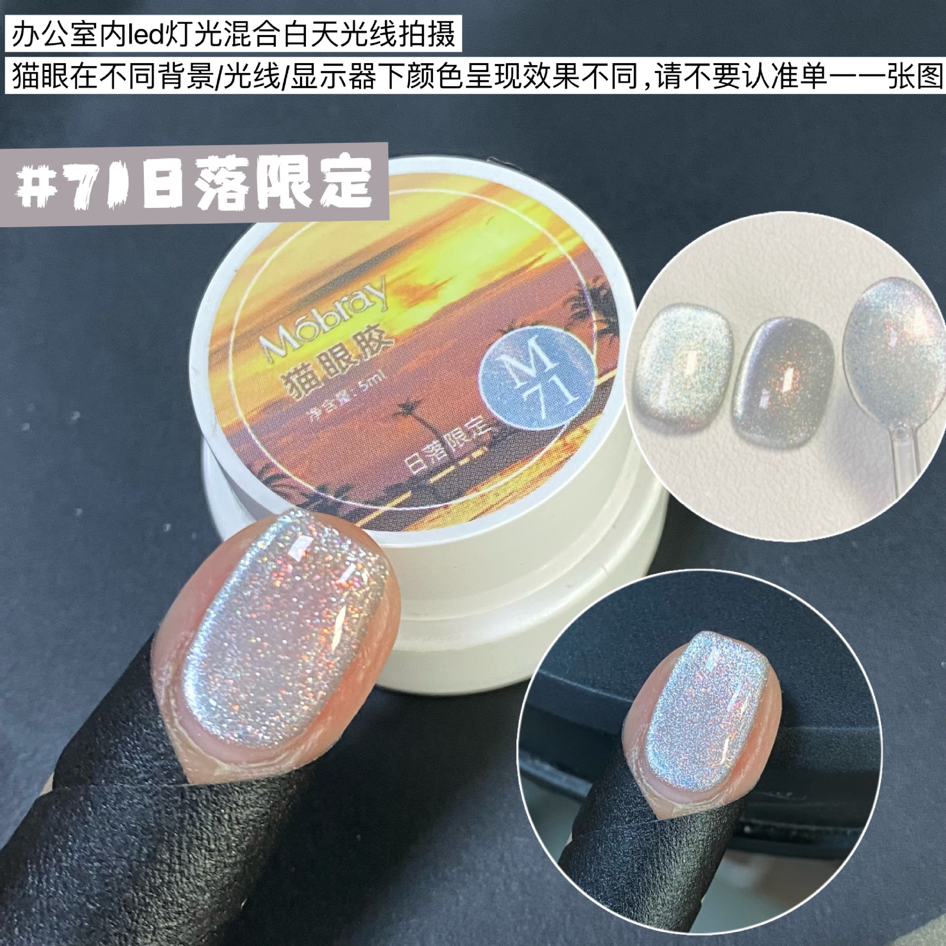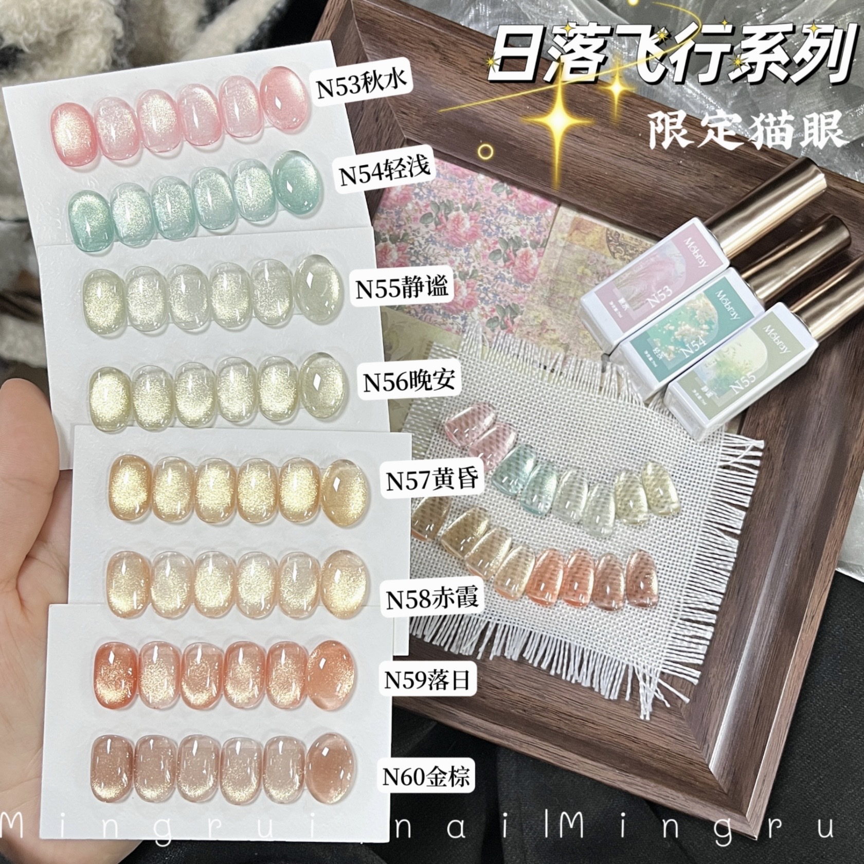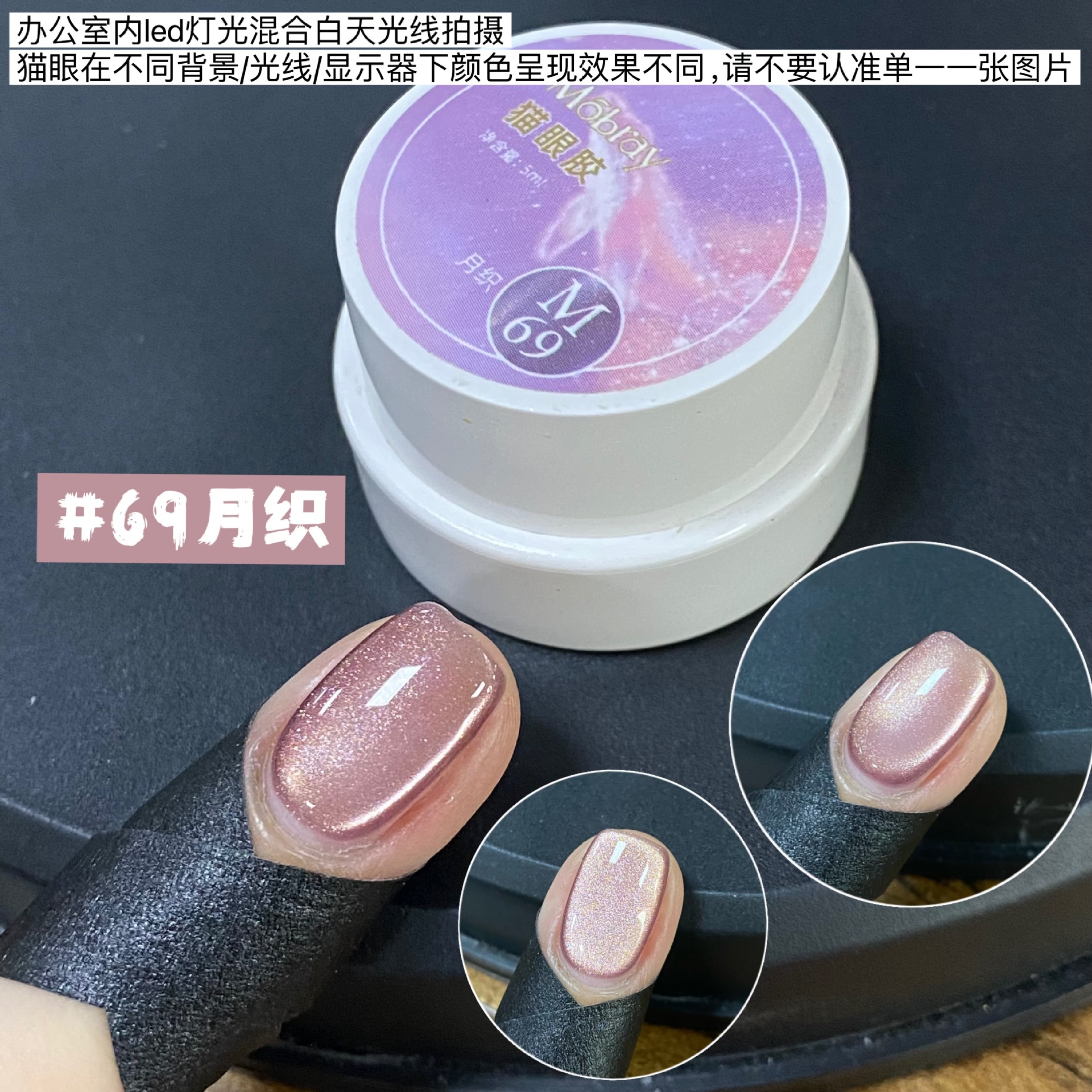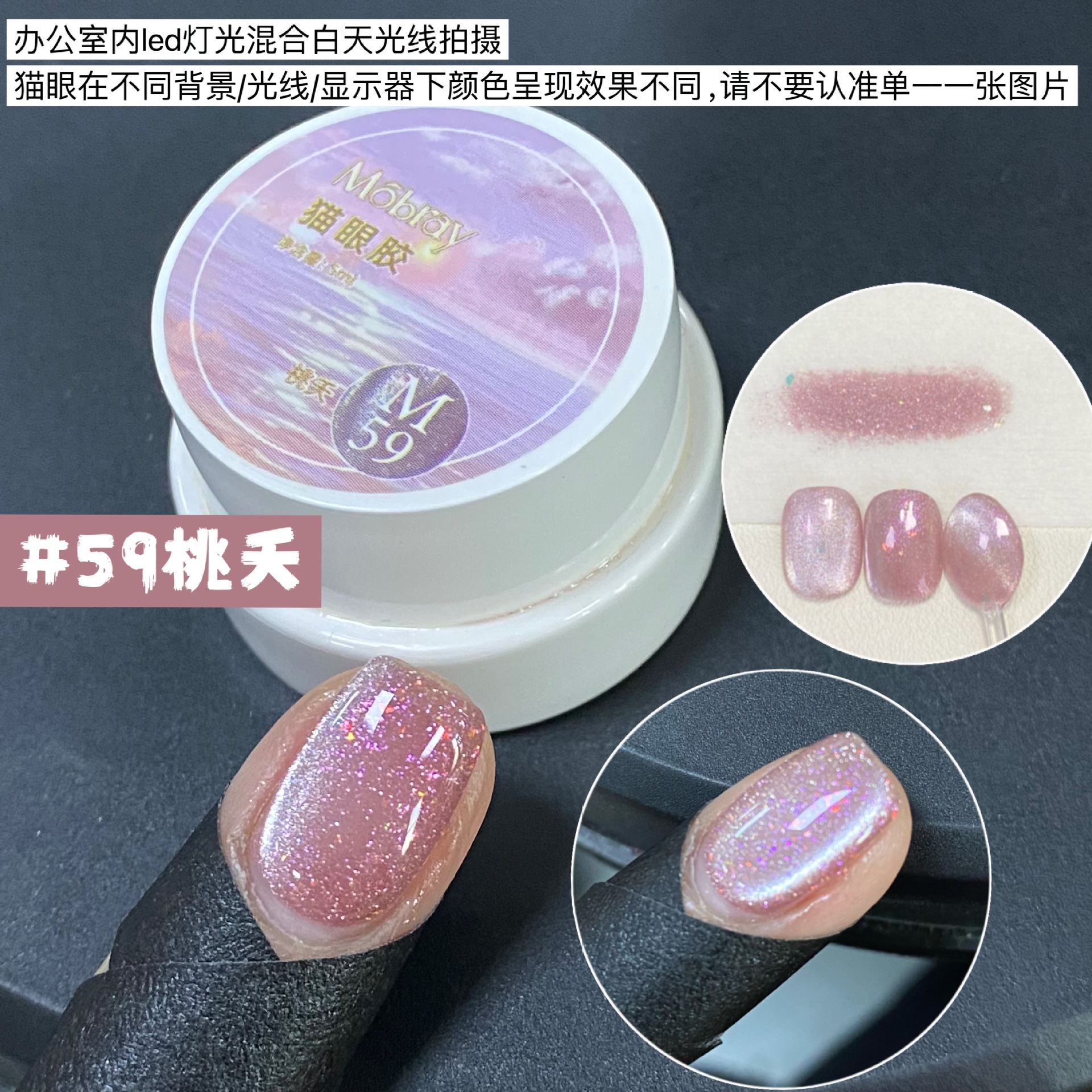 其中部分颜色M59桃夭、M73柔丽丝自带欧泊粉素材,仙气满满。M71日落限定是橙色偏光猫眼。M64无花果、M66焦茶、M67夜桂花、M68香槟为红茶棕色系猫眼,自带秋冬氛围感,磁粉不是单一的银色哦,跟市面上常规白光猫眼不一样,敬请品鉴。M60爱神之眼是很正的火龙果色猫眼,磁粉很细腻、M67野玫瑰、M62黛西磁粉粗细中等,搭配上亮片会很米。