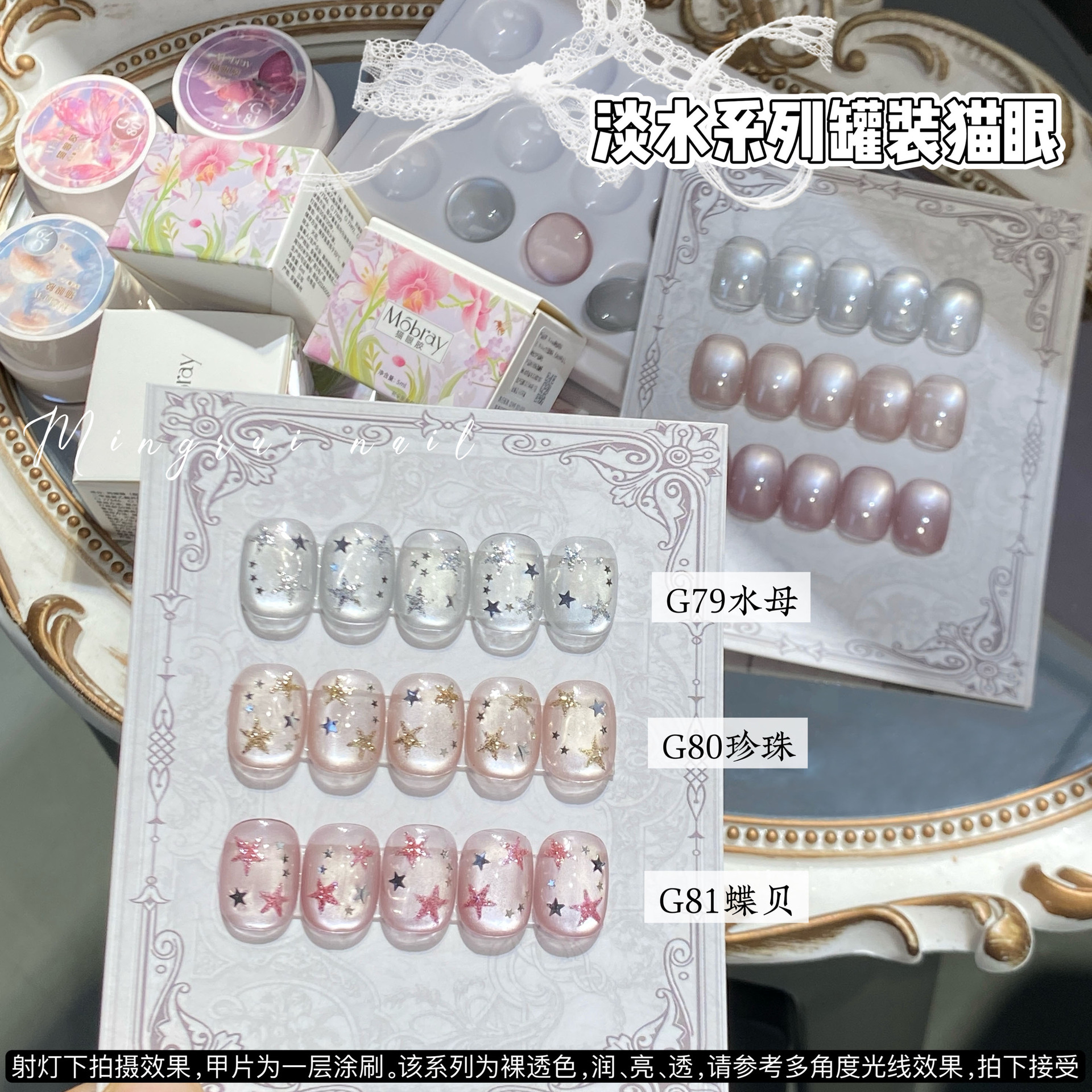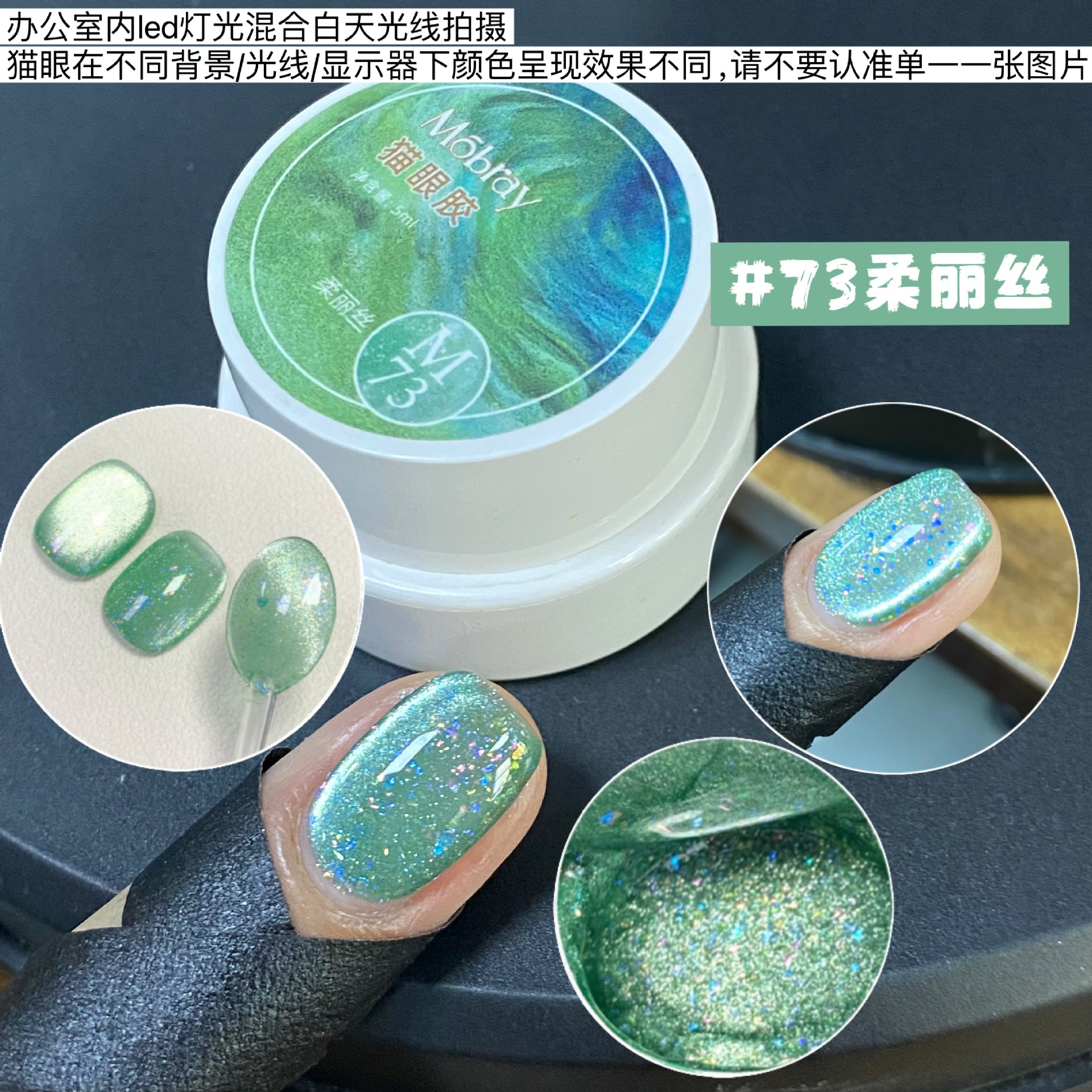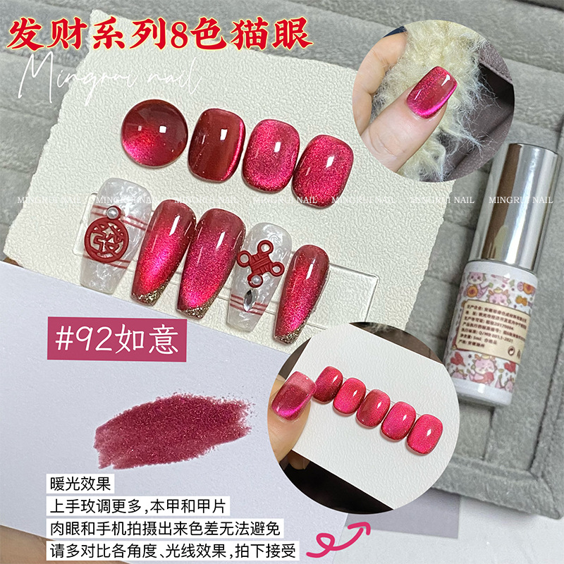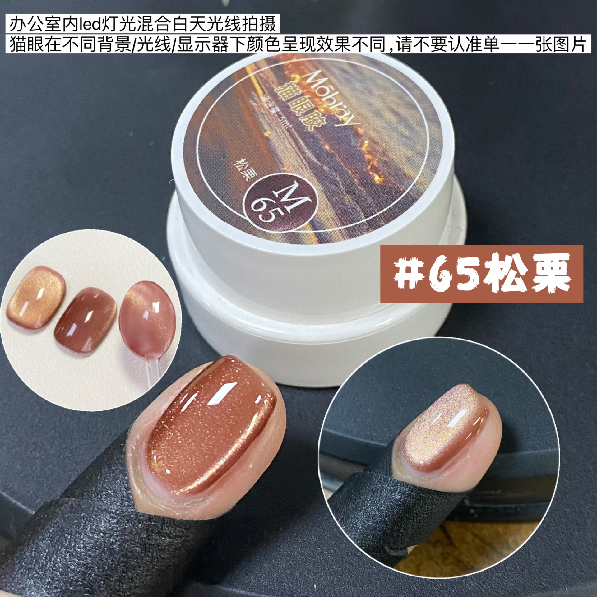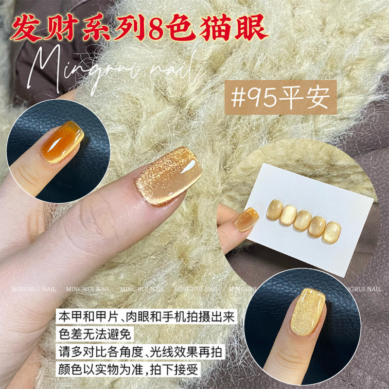 其中部分颜色M59桃夭、M73柔丽丝自带欧泊粉素材,仙气满满。M71日落限定是橙色偏光猫眼。M64无花果、M66焦茶、M67夜桂花、M68香槟为红茶棕色系猫眼,自带秋冬氛围感,磁粉不是单一的银色哦,跟市面上常规白光猫眼不一样,敬请品鉴。M60爱神之眼是很正的火龙果色猫眼,磁粉很细腻、M67野玫瑰、M62黛西磁粉粗细中等,搭配上亮片会很米。