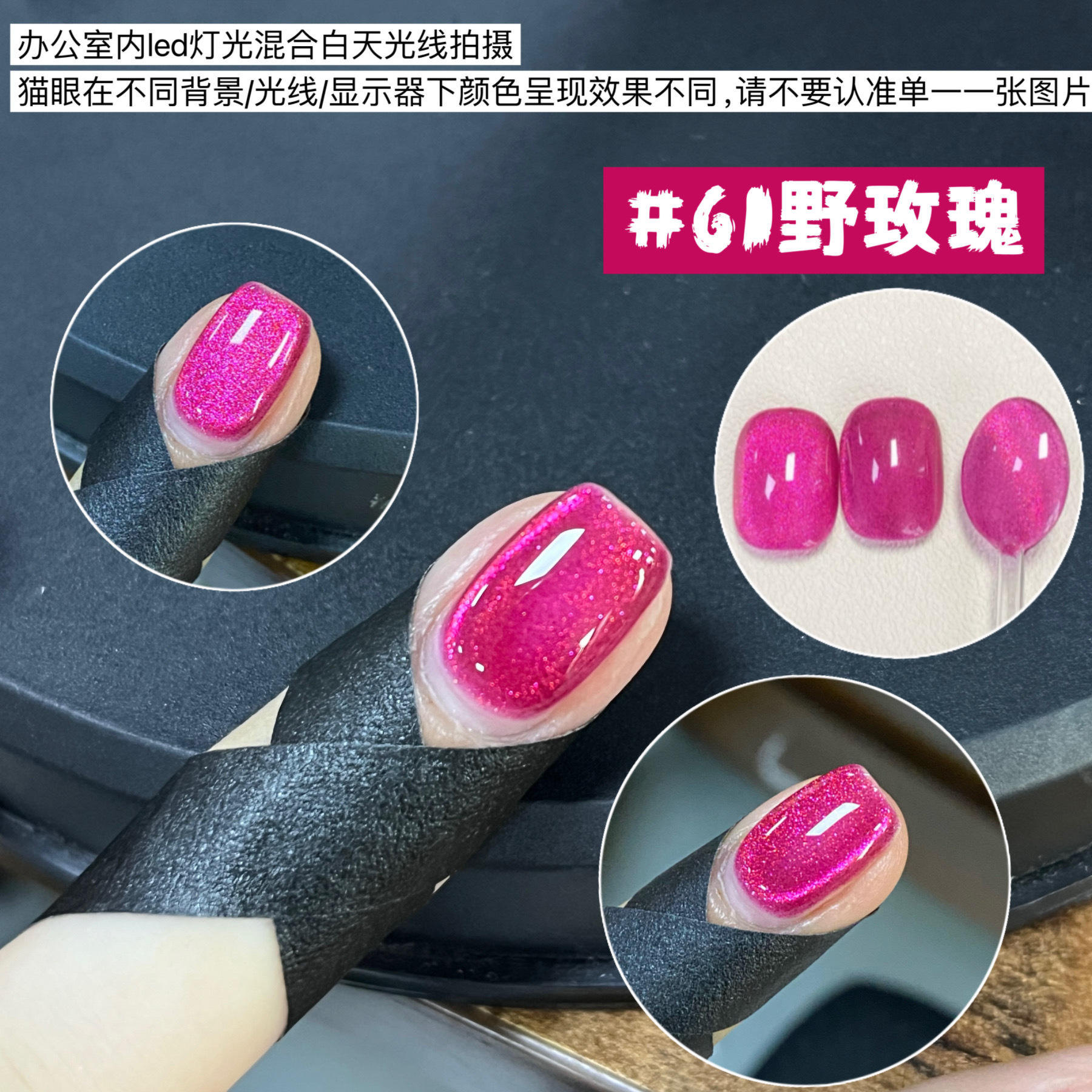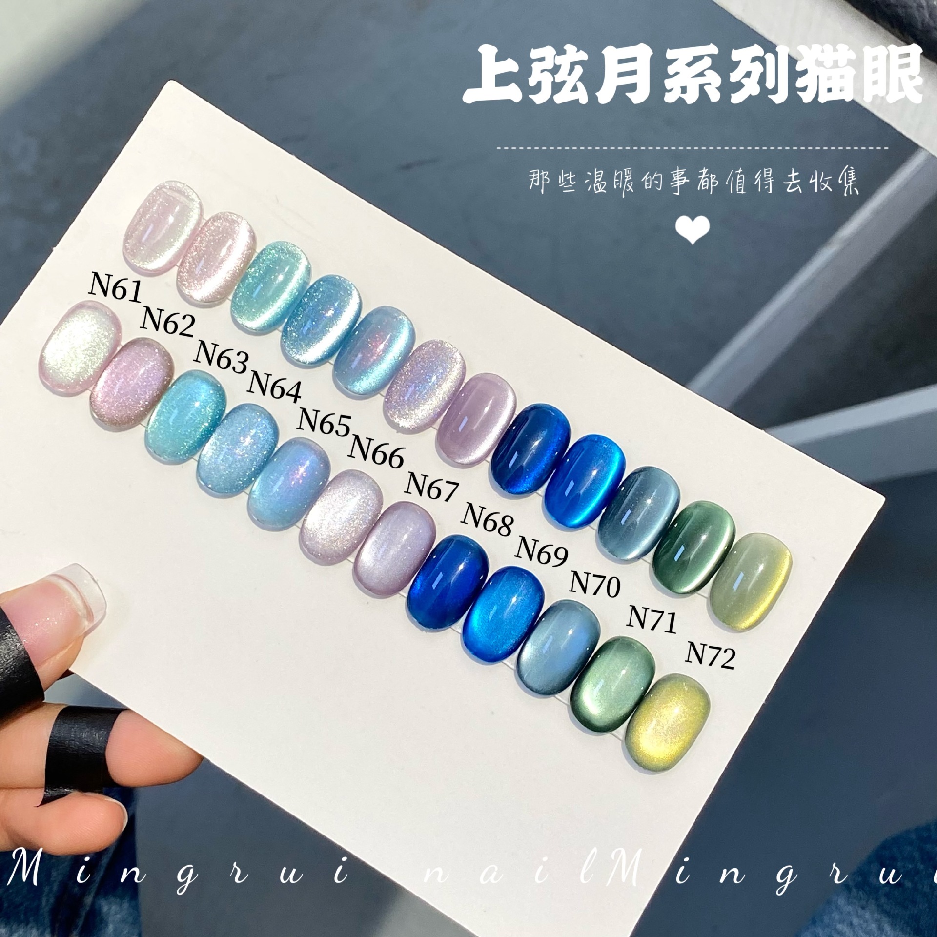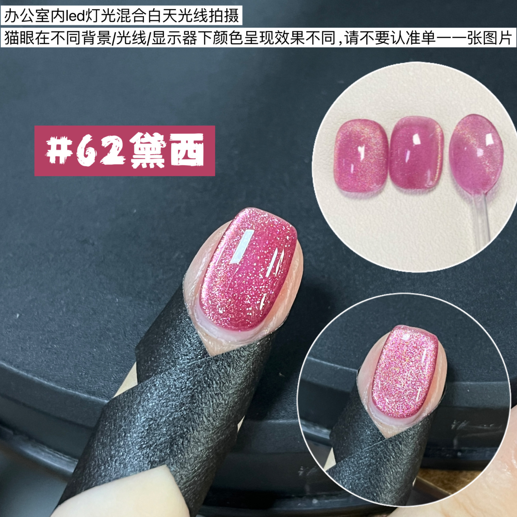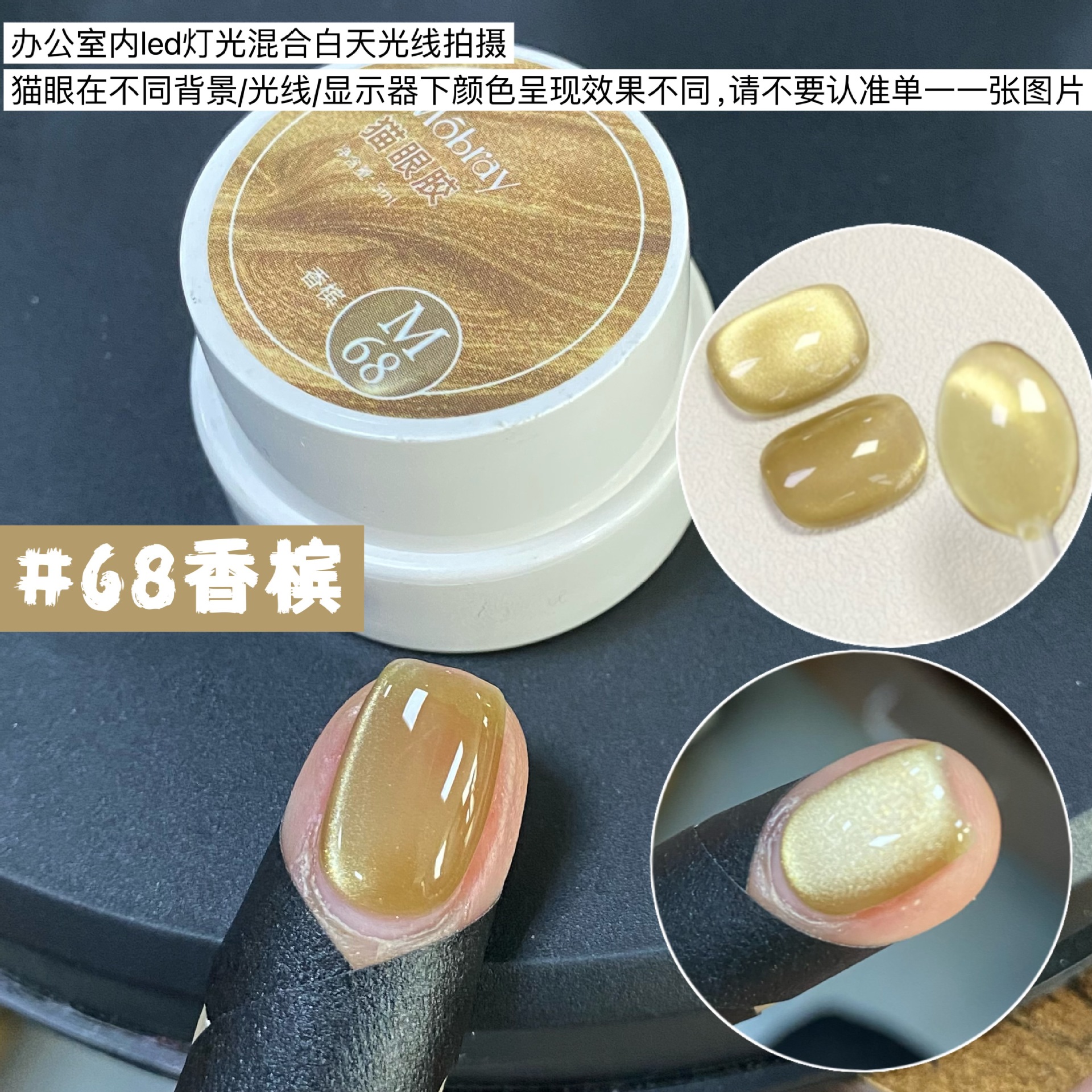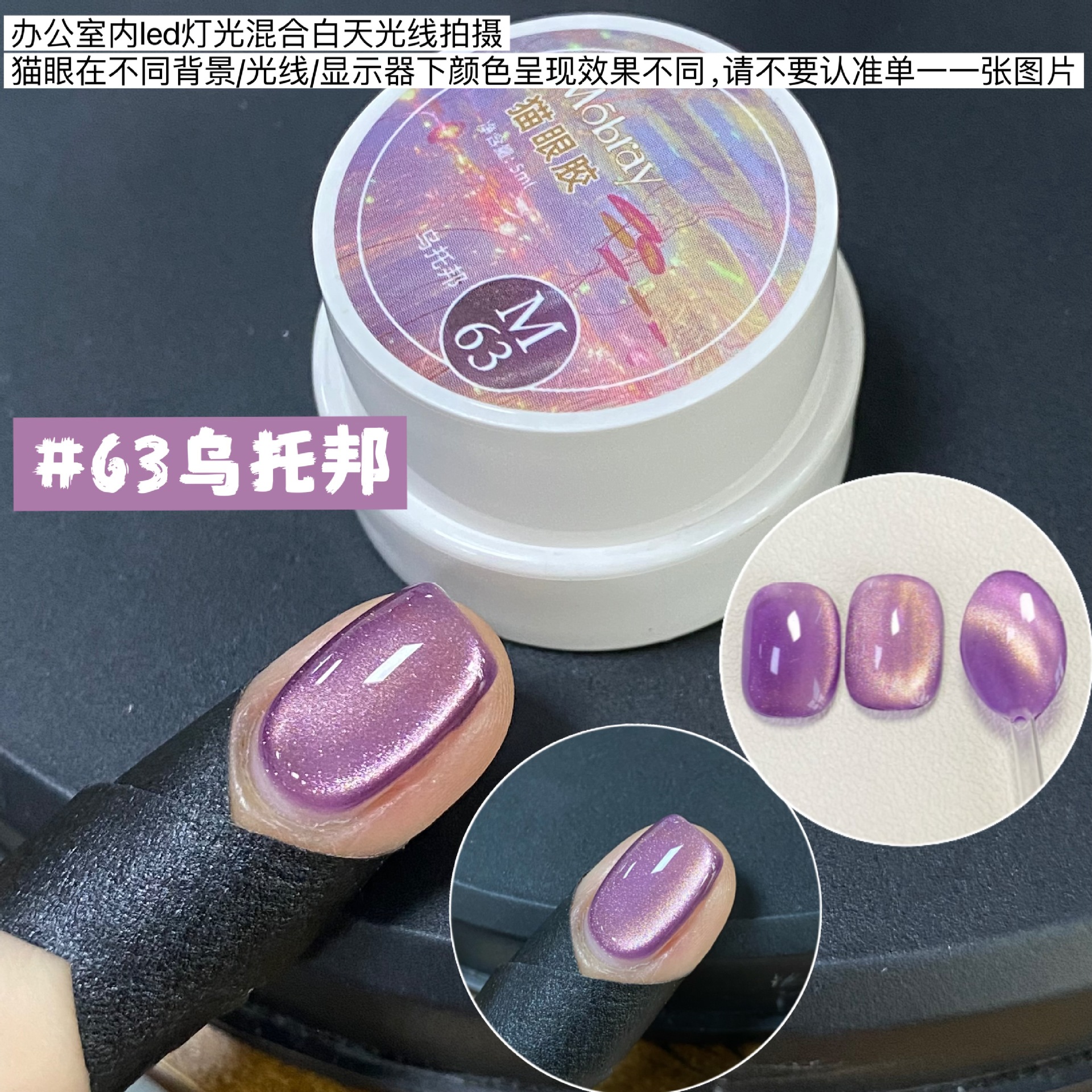 其中部分颜色M59桃夭、M73柔丽丝自带欧泊粉素材,仙气满满。M71日落限定是橙色偏光猫眼。M64无花果、M66焦茶、M67夜桂花、M68香槟为红茶棕色系猫眼,自带秋冬氛围感,磁粉不是单一的银色哦,跟市面上常规白光猫眼不一样,敬请品鉴。M60爱神之眼是很正的火龙果色猫眼,磁粉很细腻、M67野玫瑰、M62黛西磁粉粗细中等,搭配上亮片会很米。