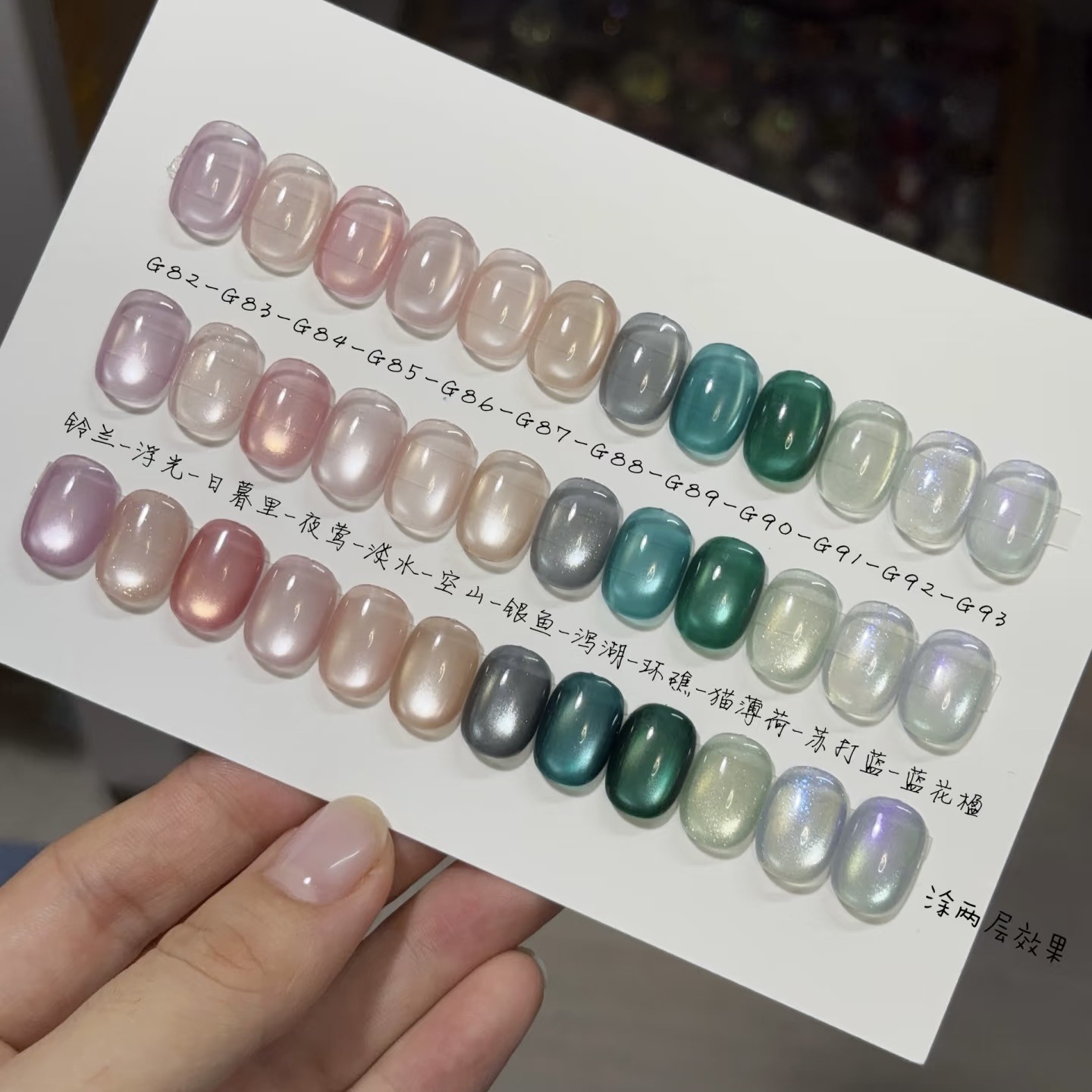 常规猫眼厚涂法:正常涂一层,吸猫光,照灯。再涂一层,吸猫光照灯。