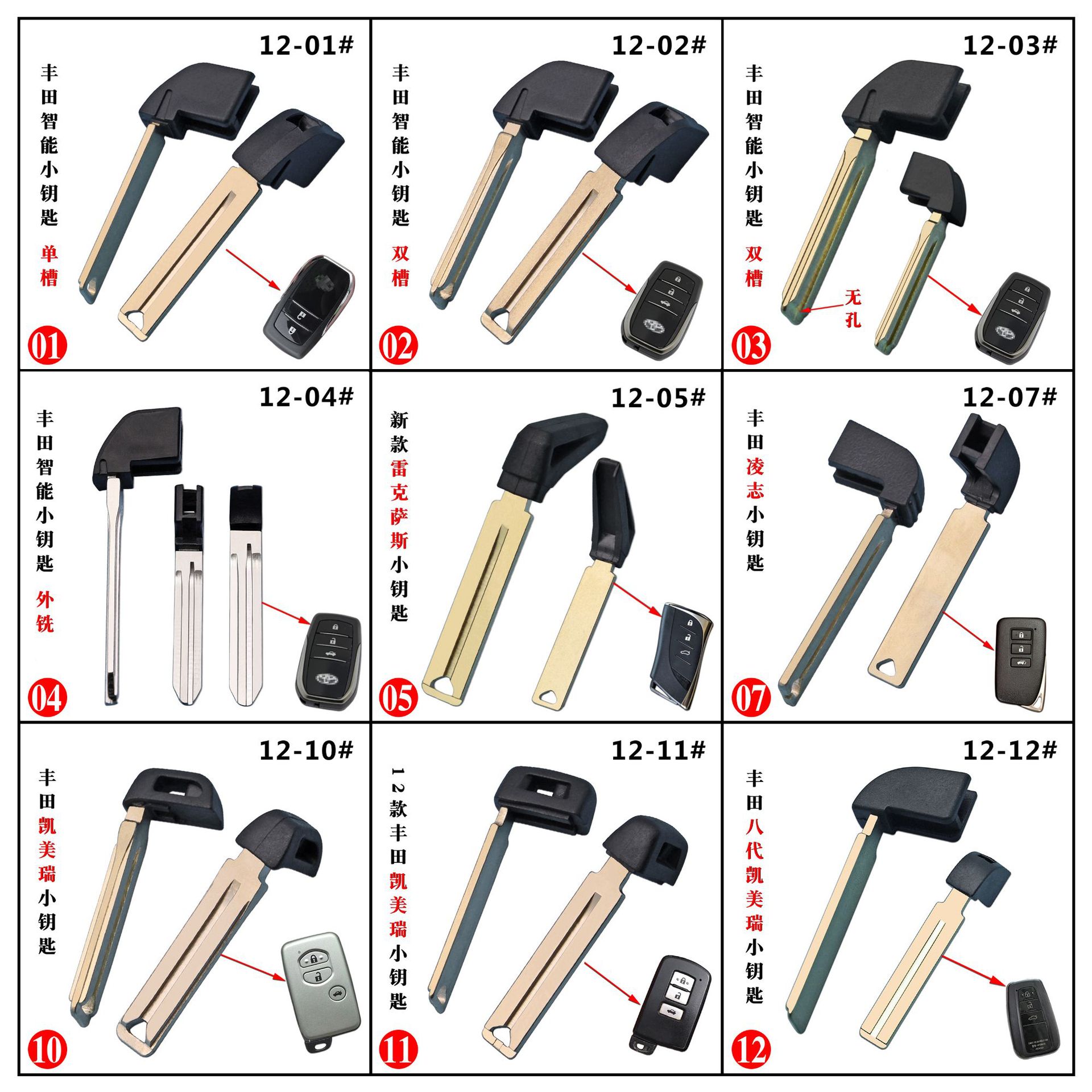 12-01#Смарт-карта Toyota, небольшой ключ, один слот; 12-02#Тойота смарт-карта, маленький ключ, двойной слот; 12-03#Тойота смарт-карта, маленький ключ, двойной слот без отверстий; 12-04#Внешнее фрезерование смарт-ключей Toyota; 12-05#Новый маленький ключ Lexus; 12-07#Тойота Линьши ключ; 12-10#Тойота Камри ключ; 12-11#12 ключей Toyota Camry; 12-12#Тойота восьми поколения Camry Key; 12-34 # Маленький ключ Toyota, с одним пазом, длина 22,2 мм