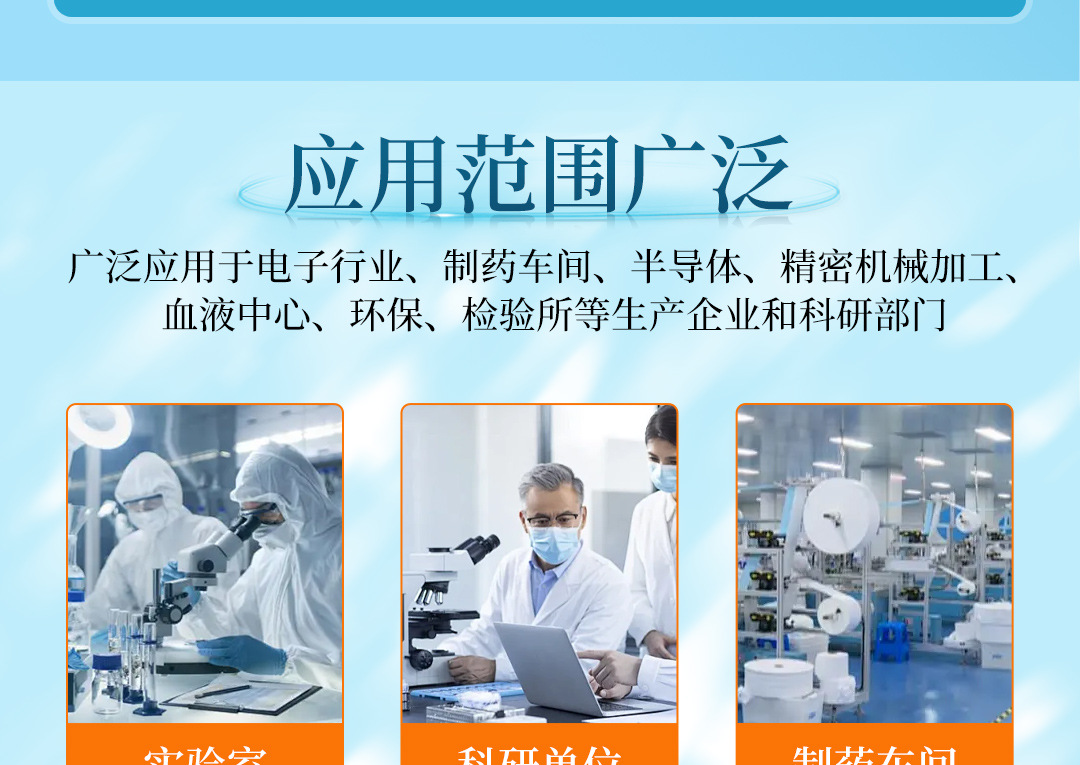 Подходит для применения в электронной промышленности, фармацевтических цехах, производстве полупроводников, прецизионной механической обработке, крови-банках, охране окружающей среды, испытательных лабораториях и других сферах, обеспечивая чистоту класса 100 000.