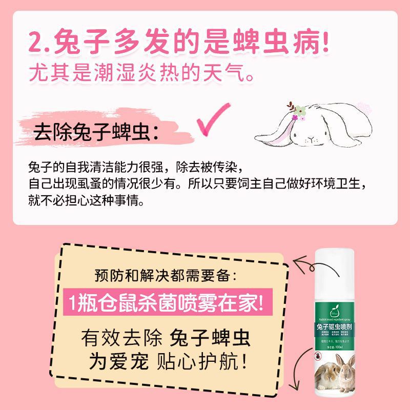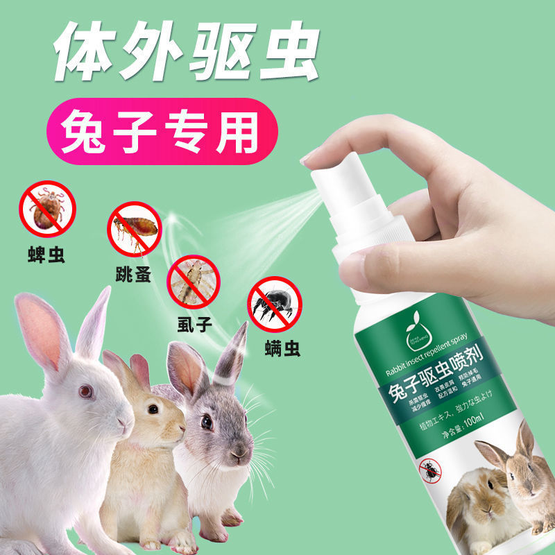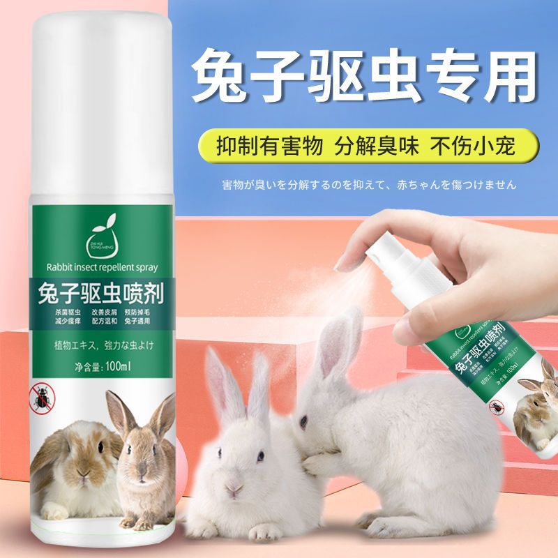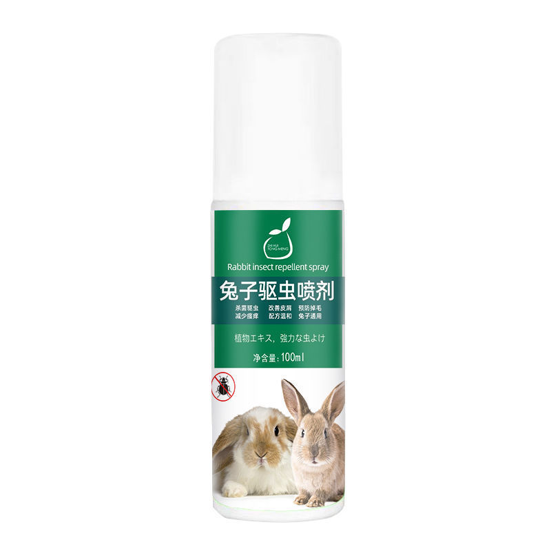 Комплект принадлежностей для кроликов: спрей для внешнего дегельминтизирования кроликов, специальная дезодорирующая неиспытывающая дезинфицирующая вода для удаления клещей у кроликов.