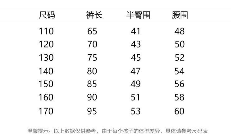 110cm; 120cm; 130cm; 140cm; 150cm; 160cm; 170cm
