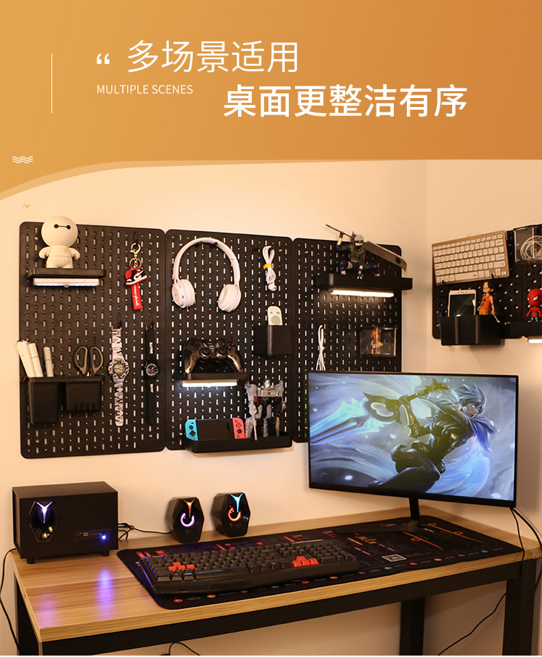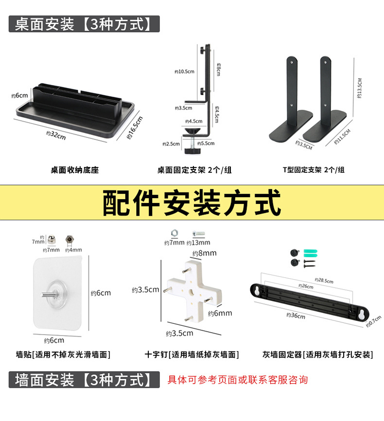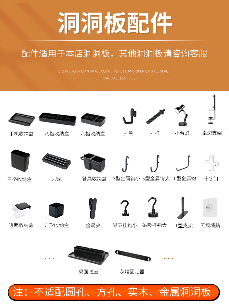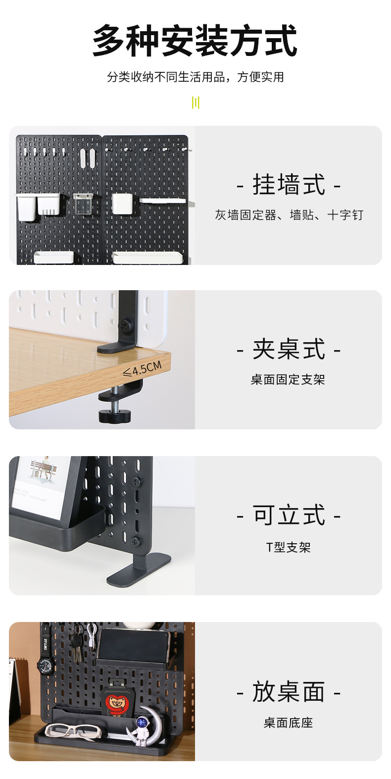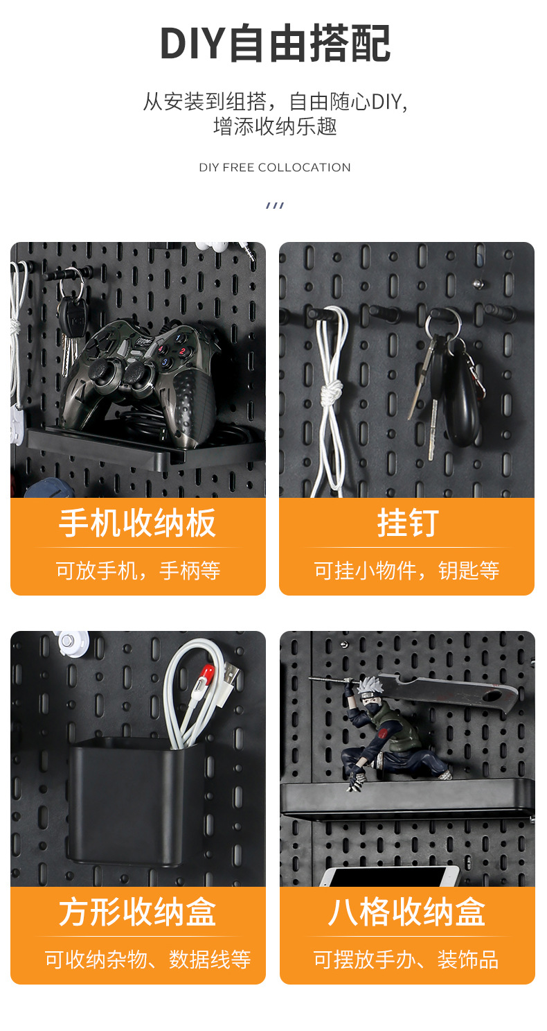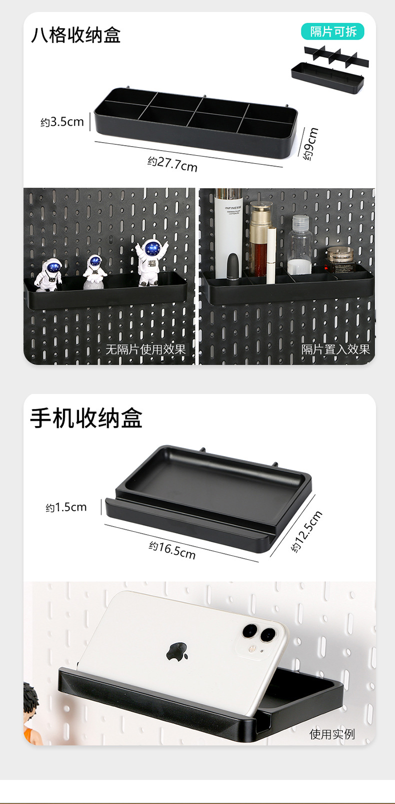 Увеличенная квадратная пластина утолщения-черная; Большая тарелка утолщенная-черная; Утолщенная горизонтальная пластина-черная; Утолщенная маленькая доска-черная; Большая тарелка утолщенная-хаки; Увеличенная квадратная пластина утолщение-хаки; Утолщенные горизонтальные панели-хаки; Настольный фиксированный кронштейн-2 шт. [монтаж на зажимной стол]; U-образный кронштейн для пластины с отверстиями — черный*2 шт. [адаптирован к круглым отверстиям/металлическим пластинам]; Т-образный кронштейн - 2 шт. [может стоять на рабочем столе]; Набор крючков-5 шт.; Набор подвесных гвоздей-5 шт.; Набор крючков L-образной формы - 2 шт.; Набор S-образных крючков-5 шт.; Набор крючков S-образной формы большого размера - 3 шт.; Комбинация клипс-2 шт.; Крючок длиной 9 см-черный-2 шт.; Полый кронштейн [сливная решетка]; коробка для салфеток; мыльница; Держатель для фена; Ручка-подставка черная; перегородка; Прозрачный ящик для хранения; Ящик для хранения с шестью отделениями; Ящик для хранения с восемью отделениями; Доска для хранения мобильного телефона; Квадратный ящик для хранения; Ящик для хранения с тремя отделениями; держатель бумажных полотенец; Корзина из металлической сетки - черная; Разделитель полок (может удерживать фигурки); Чашка-черная; Комбинация наклеек на стену — 4 шт. [Аксессуары для установки]; Комбинация крестообразных гвоздей-4 шт. [аксессуары для установки]; Фиксатор дырокола-4 шт. [аксессуары для установки]; Настольная база хранения [размещена на рабочем столе]; Винты с колпачками - 4 шт.