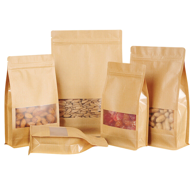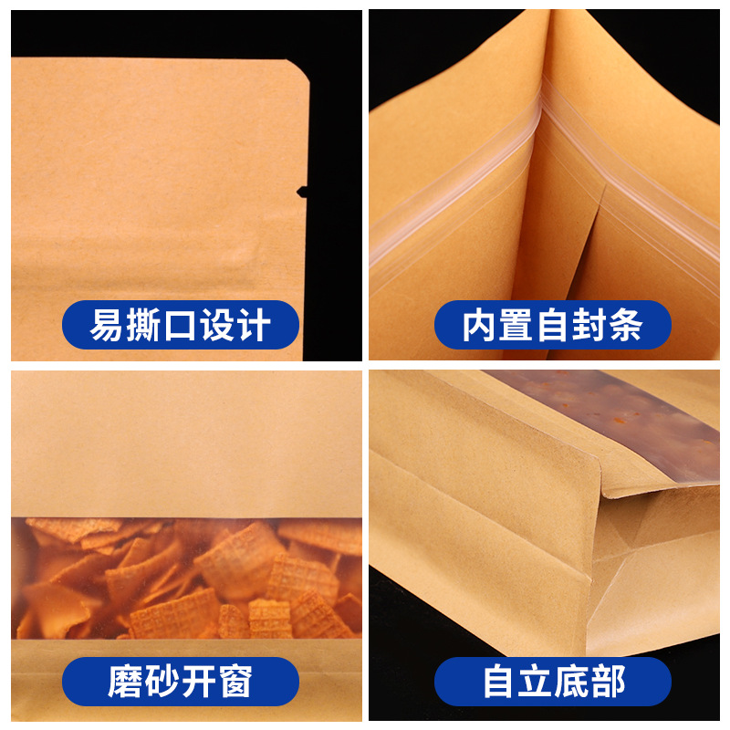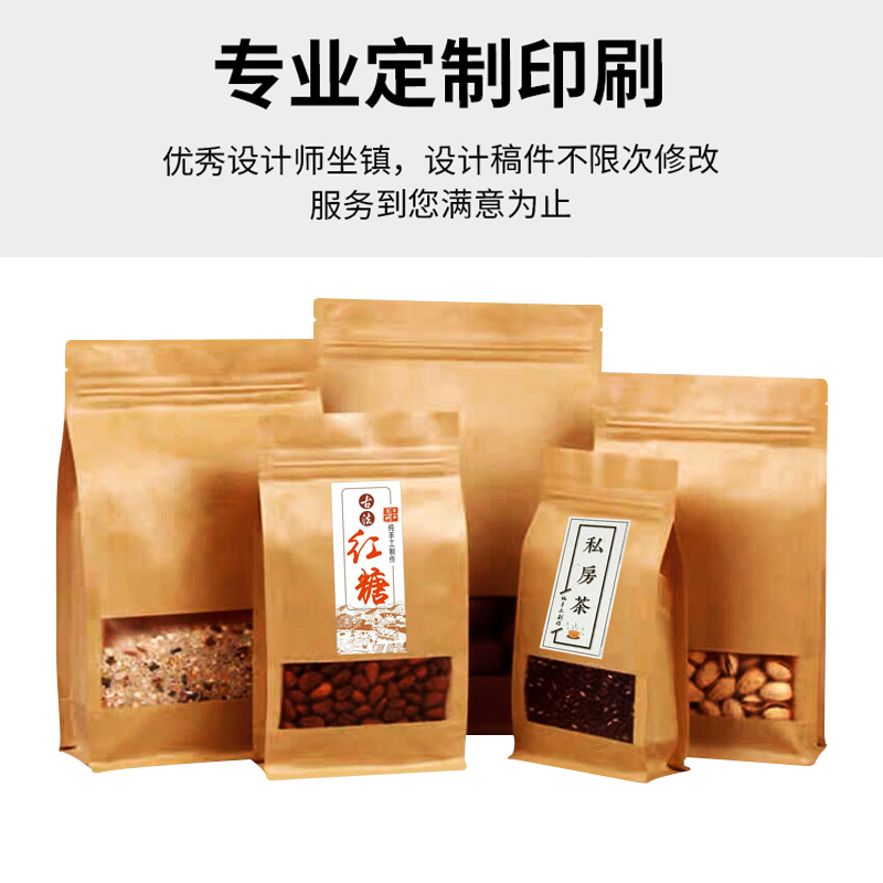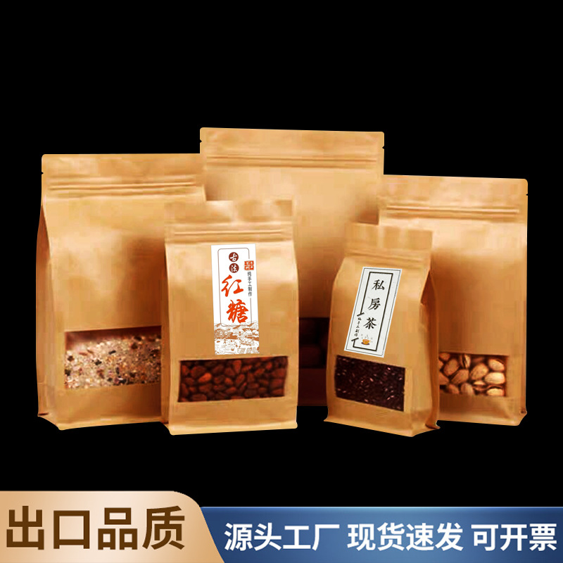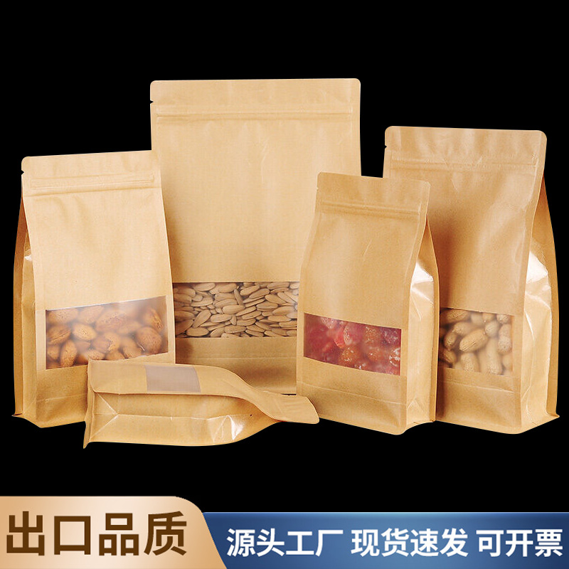 Пакеты-стойки из крафт-бумаги с окном, восьмигранные, светонепроницаемые, для снеков, орехов, чая, самозакрывающиеся, оптом.