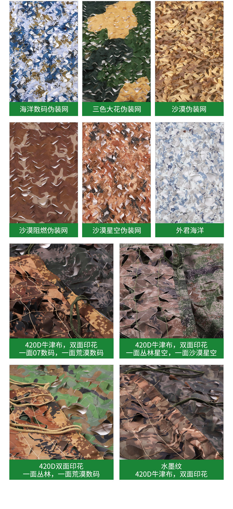 Камуфляж джунглей; Чистый зеленый; Океанский камуфляж; Пустынный камуфляж; Чистая белизна; Чистый черный; Чистый желтый; Пользовательские ткани