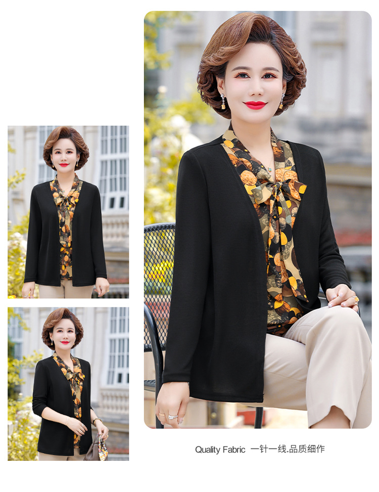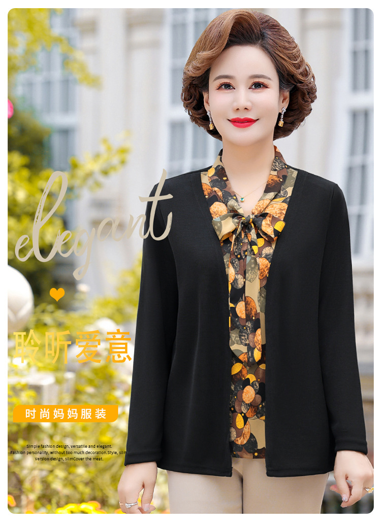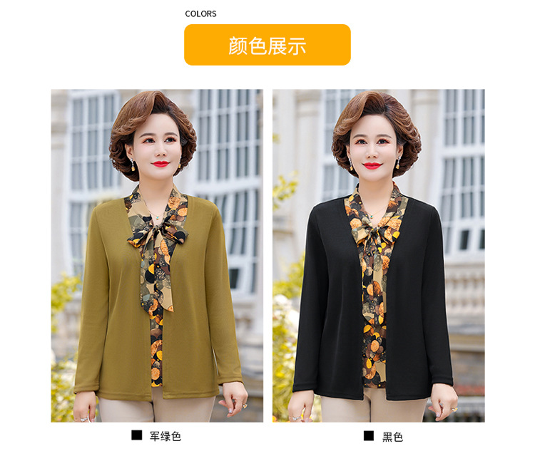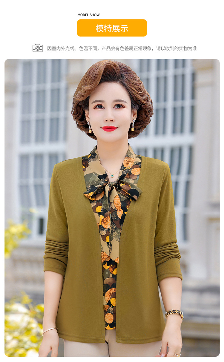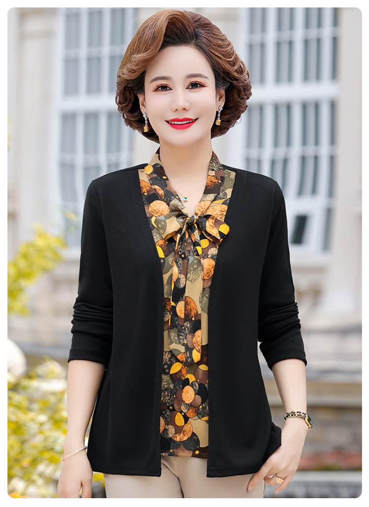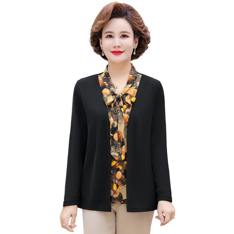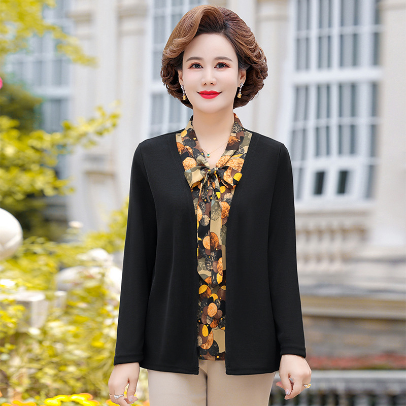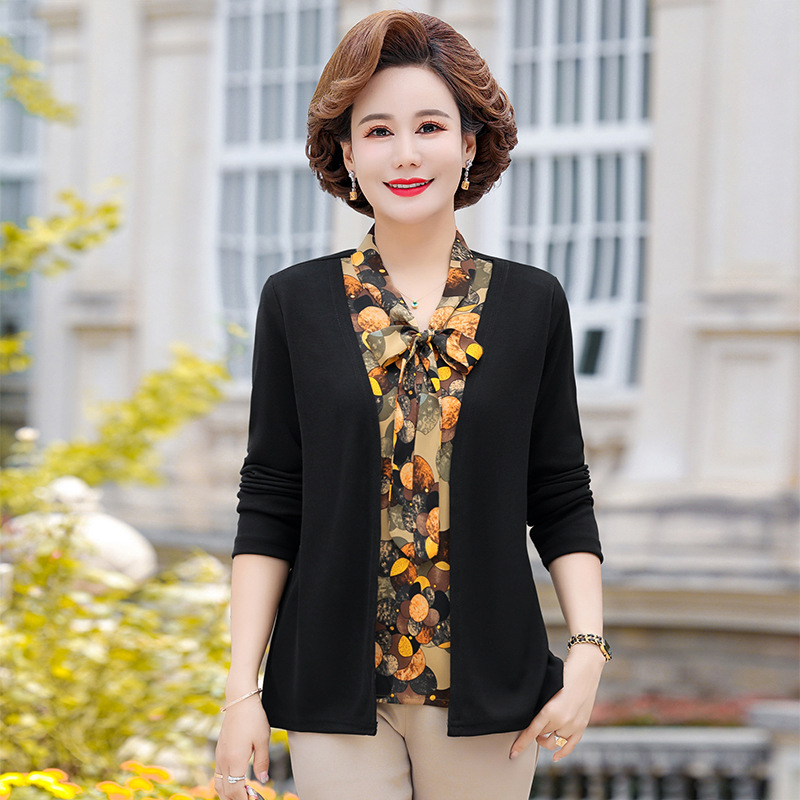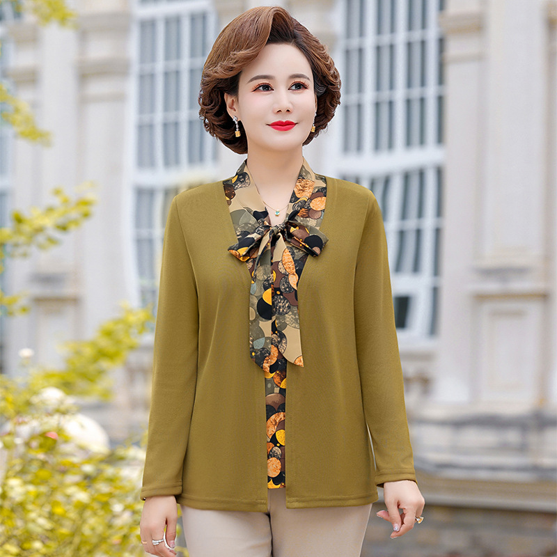 Весенняя футболка с длинными рукавами для мамы, трикотаж для женщин среднего и пожилого возраста, галстук-бабочка, искусственный верх из двух частей.