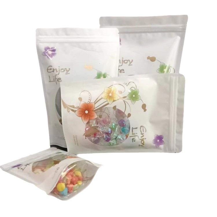 Белый пакет-стойка из пищевой алюминиевой фольги в форме цветка для конфет и фиников, с возможностью повторного запечатывания и печатью.
