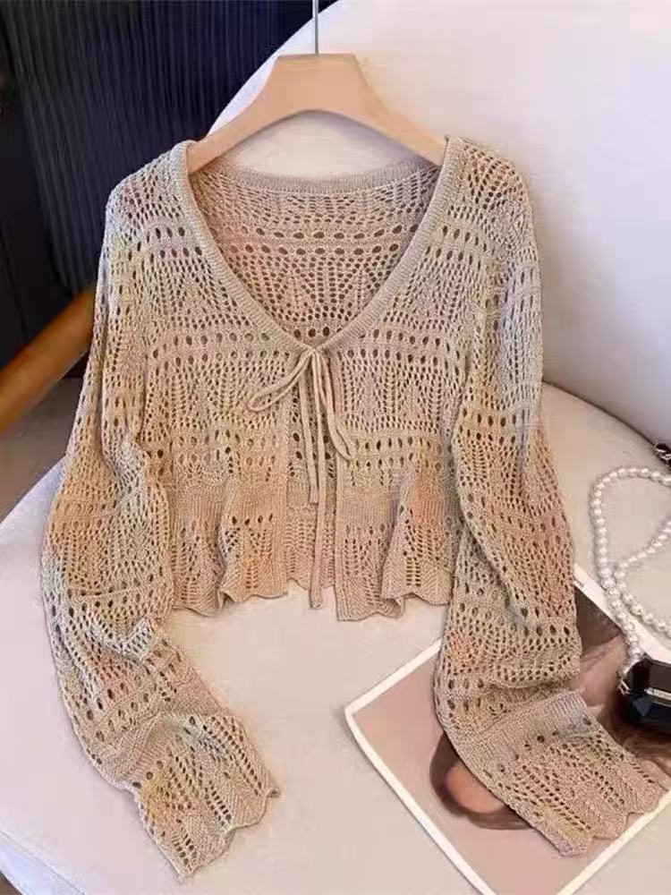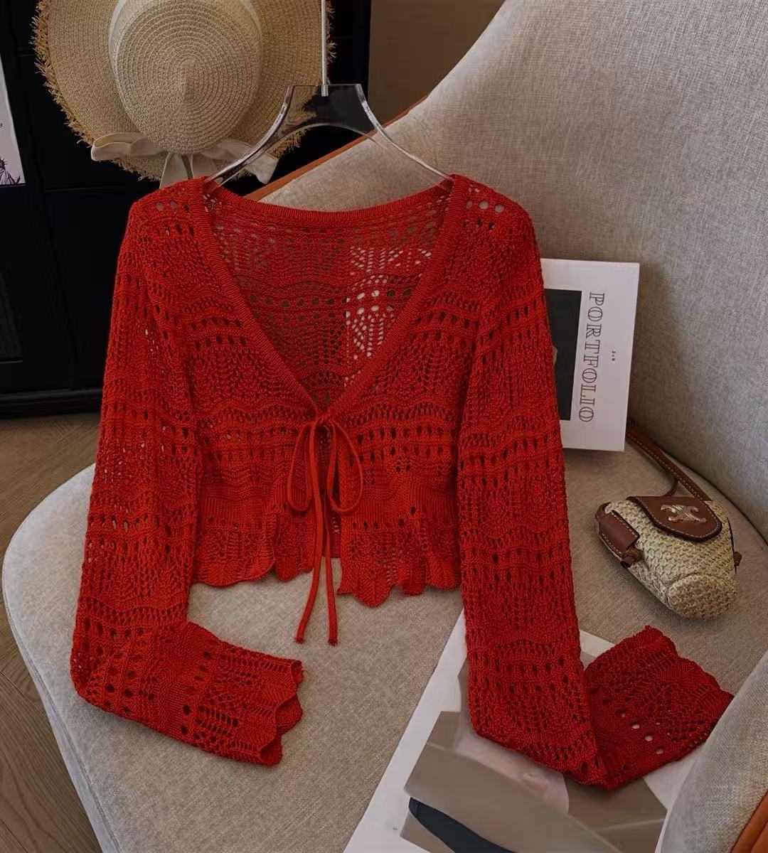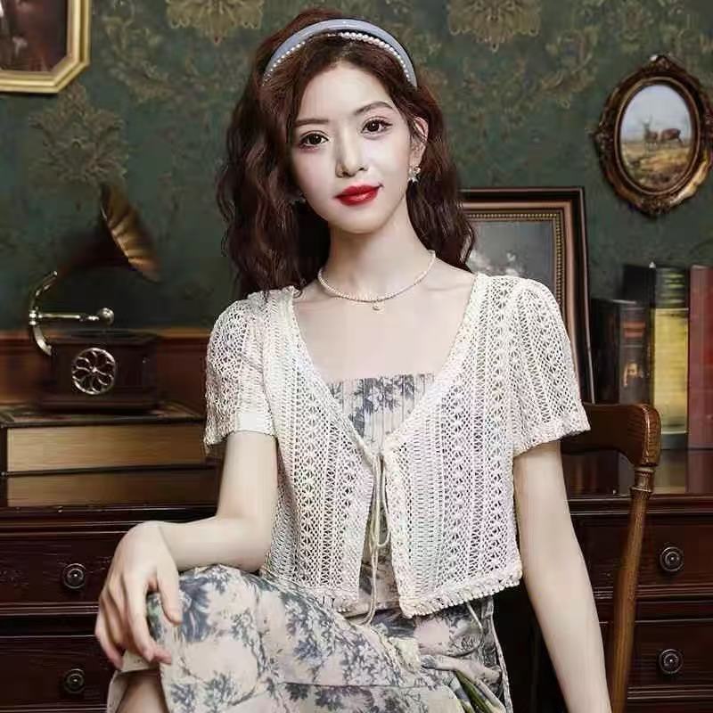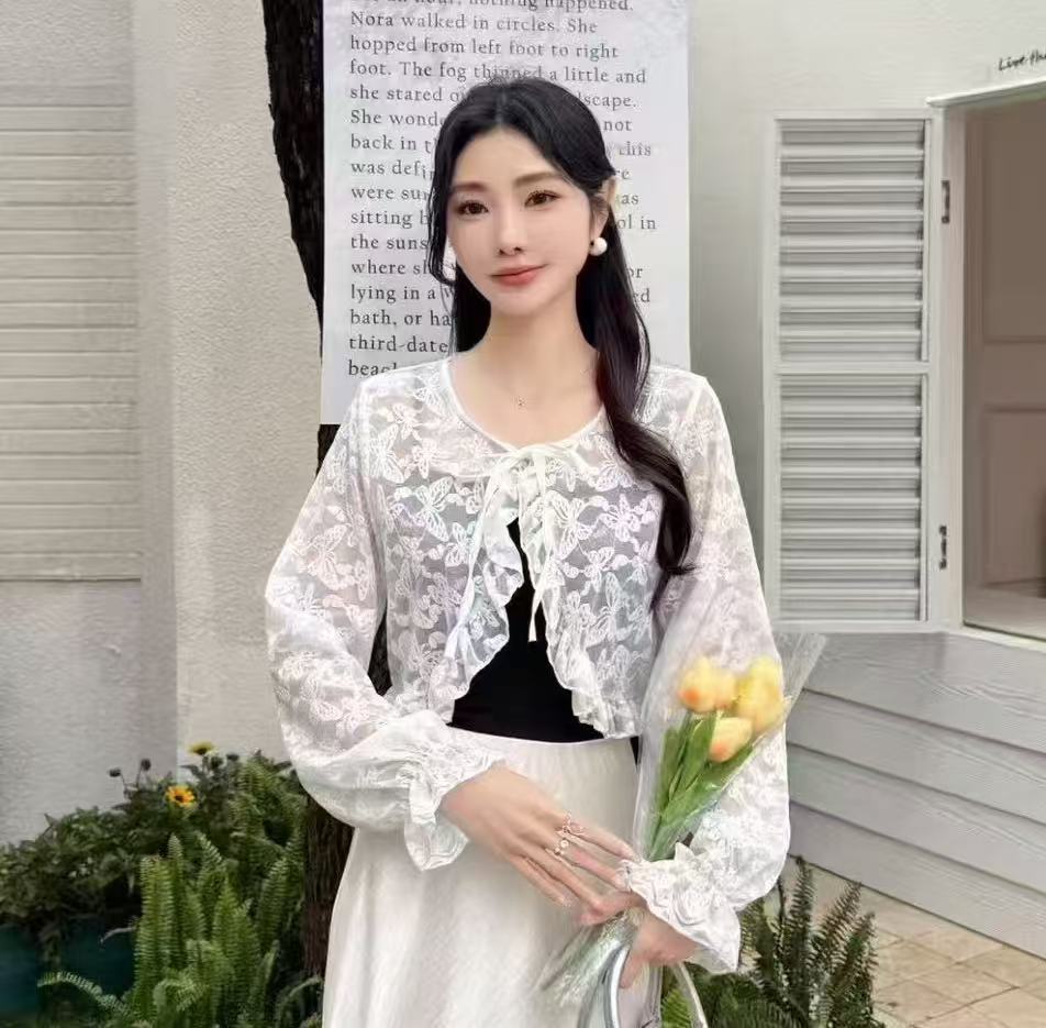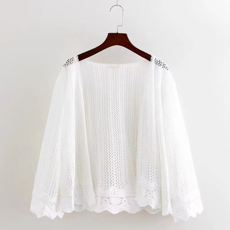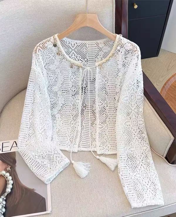 Платье миди в этническом стиле ретро, новинка на весну и лето, Повседневная вязаная крючком рубашка с длинными рукавами и пряжкой, женский топ с солнцезащитным кремом