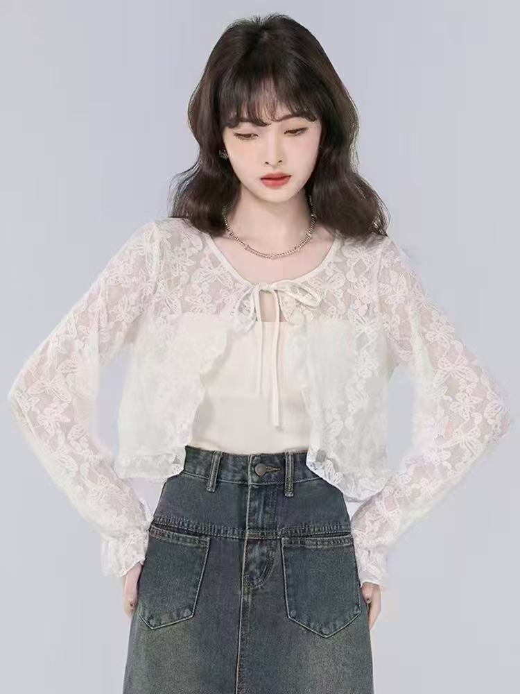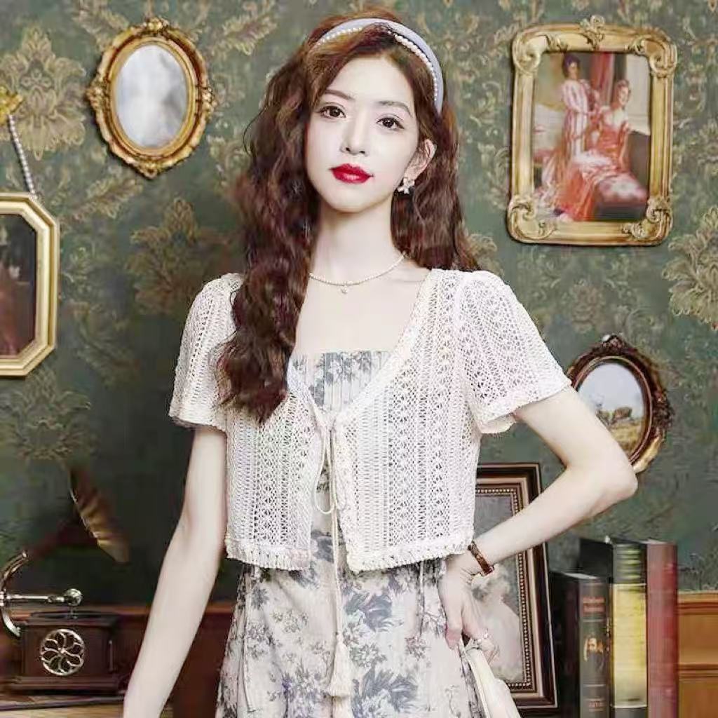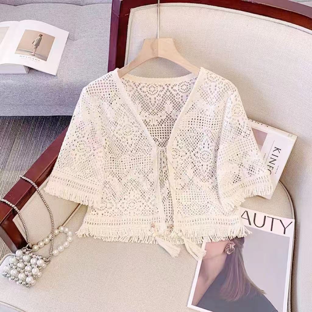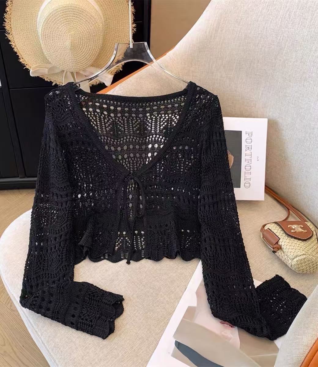 Платье миди в этническом стиле ретро, новинка на весну и лето, Повседневная вязаная крючком рубашка с длинными рукавами и пряжкой, женский топ с солнцезащитным кремом