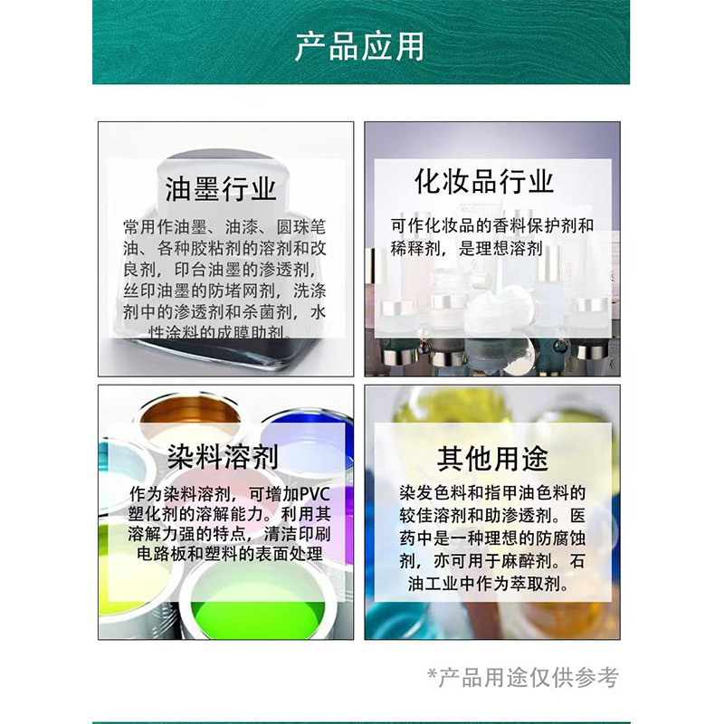 2 : 常用作油漆、油墨、圆珠笔油、各种胶粘剂的溶剂和改良剂,印台油墨的渗透剂,丝印油墨的防堵网剂;