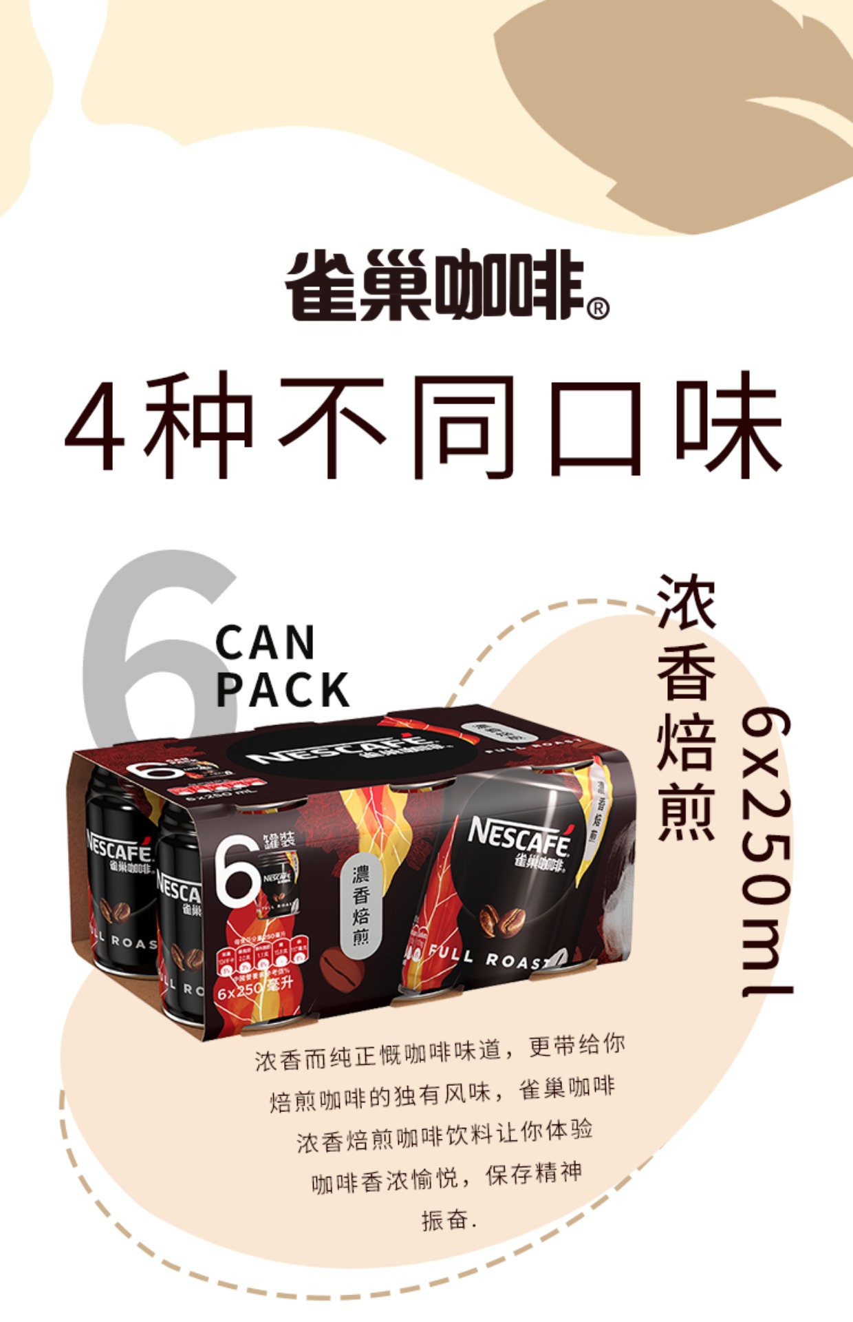 Кофе/гладкий напиток Nescafe 250мл (консервированный); Нескофе/напитки со вкусом кофе 250мл (консервированные); Nescafe/жареный напиток со сильным вкусом 250мл (консервированный); Нескофе/Континентальный молочный напиток 250мл (консервированный); Американский напиток из черного кофе 250мл; Экстра крепкий и гладкий кофейный напиток 250 мл.