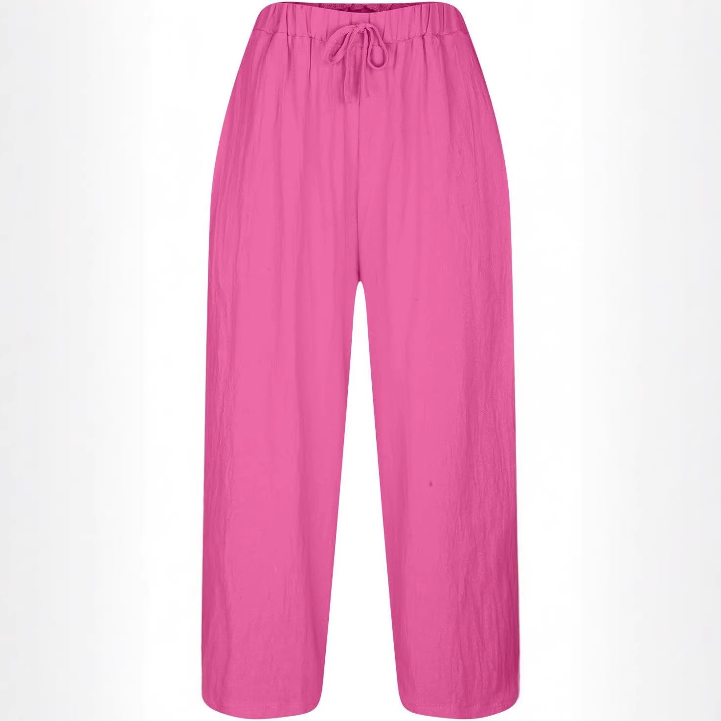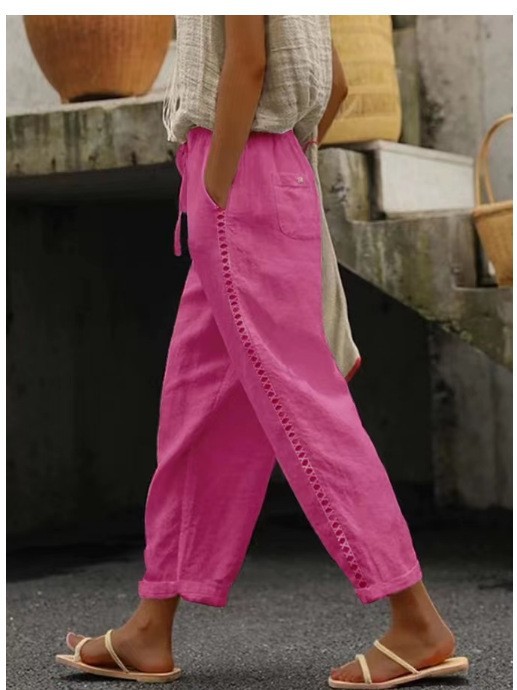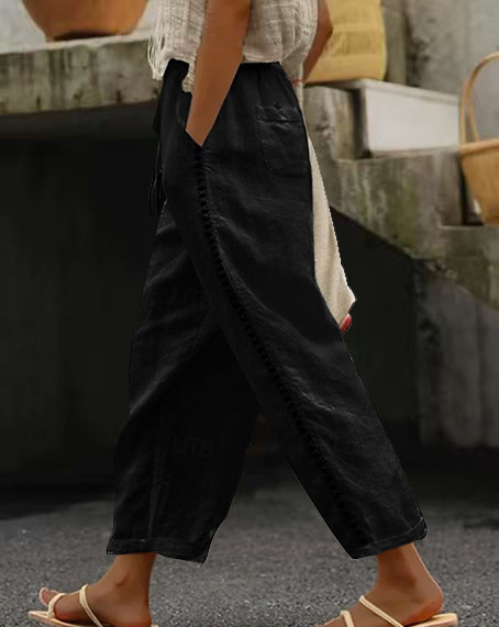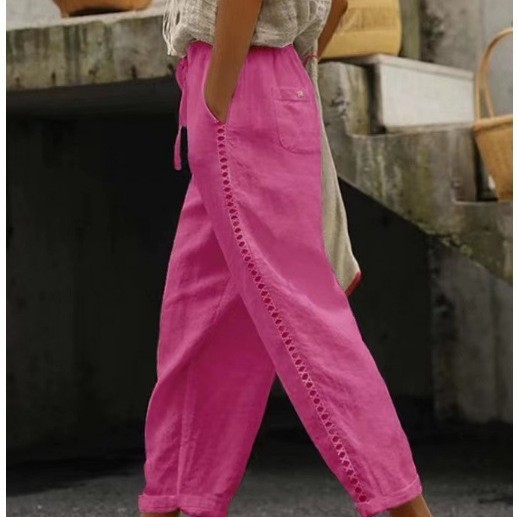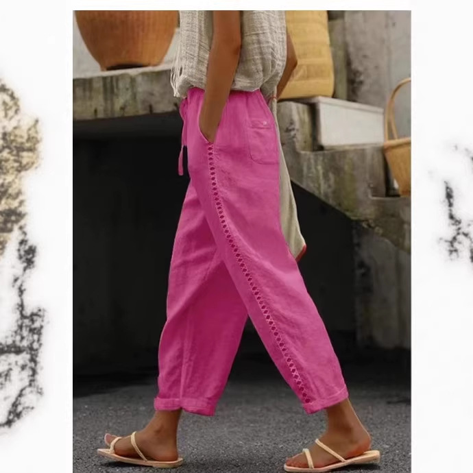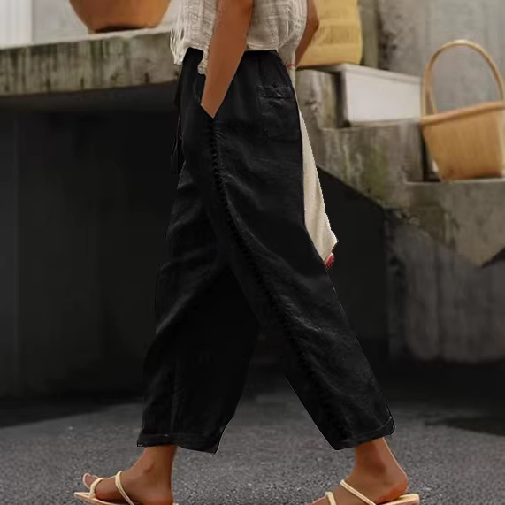 2023 Европейские и американские брюки из хлопка и льна Детские летние брюки до щиколотки Свободные брюки из хлопка и льна с широкой кружевной отделкой на талии