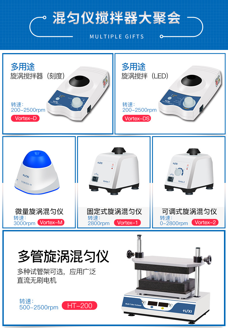 Мини миксер Vortex-M; Vortex-1 скорость фиксированного типа; Регулируемая скорость Vortex-2; VORTEX-D [включая стандартную головку]; VORTEX-D [включая полный набор аксессуаров]; VORTEX-DS [Светодиодный светильник со стандартной головкой]; VORTEX-DS [Светодиодные фонари включают полный набор аксессуаров]; HT-200 Вихревой смеситель с несколькими трубками; HTG-6 (роликовый смеситель); HTG-6D (цифровой ЖК-дисплей); HTG-10 (роликовый смеситель); HTG-10D (цифровой ЖК-дисплей); Вихрь-2