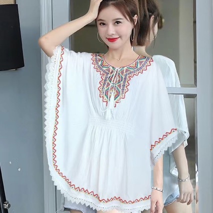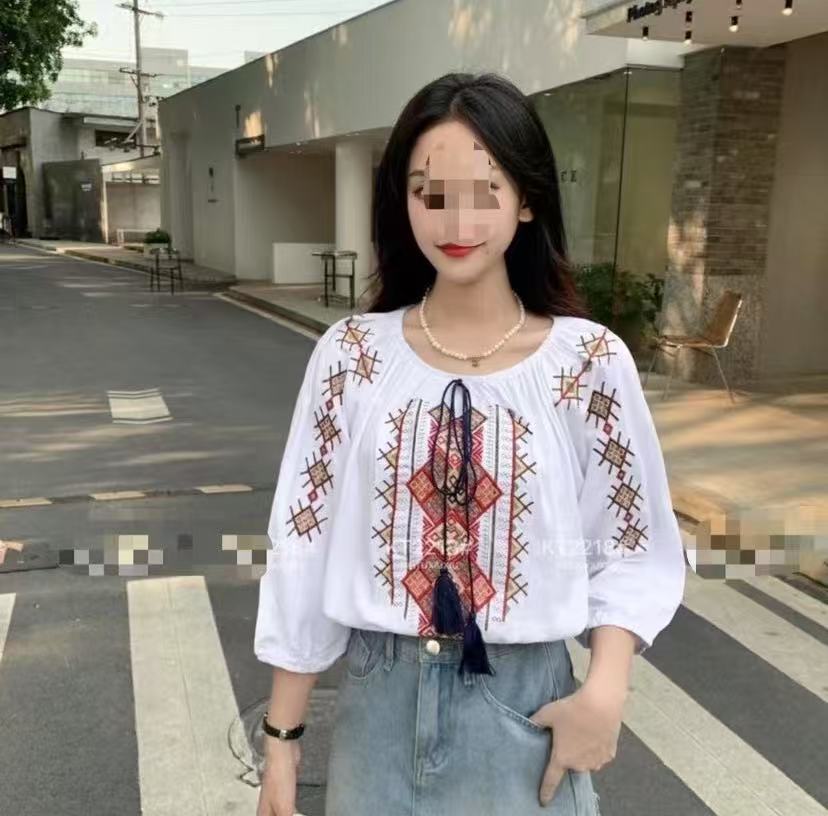 Летняя рубашка в этническом стиле с вышивкой в стиле ретро, летний Повседневный Топ с коротким рукавом и кисточками, тонкая женская оптовая продажа