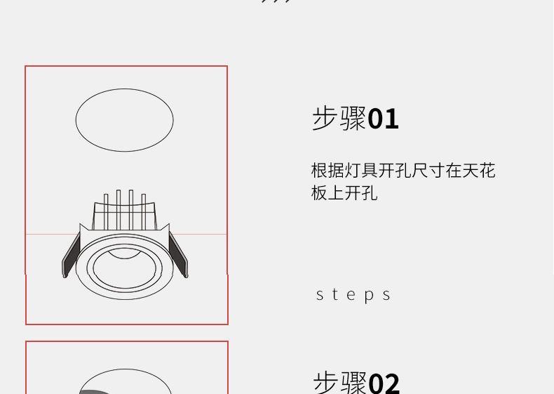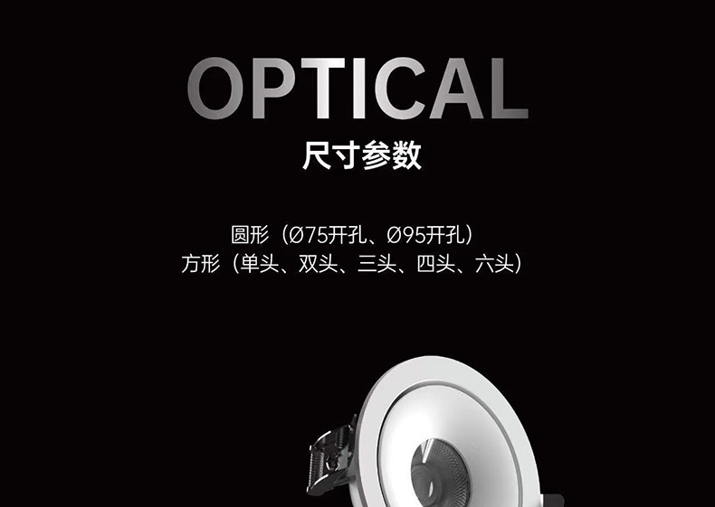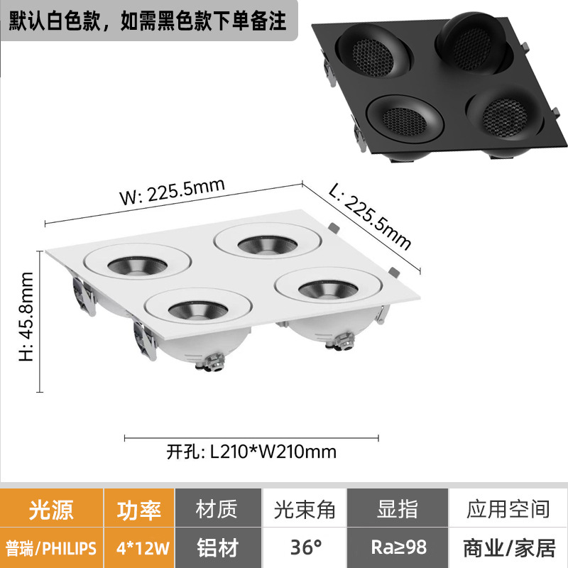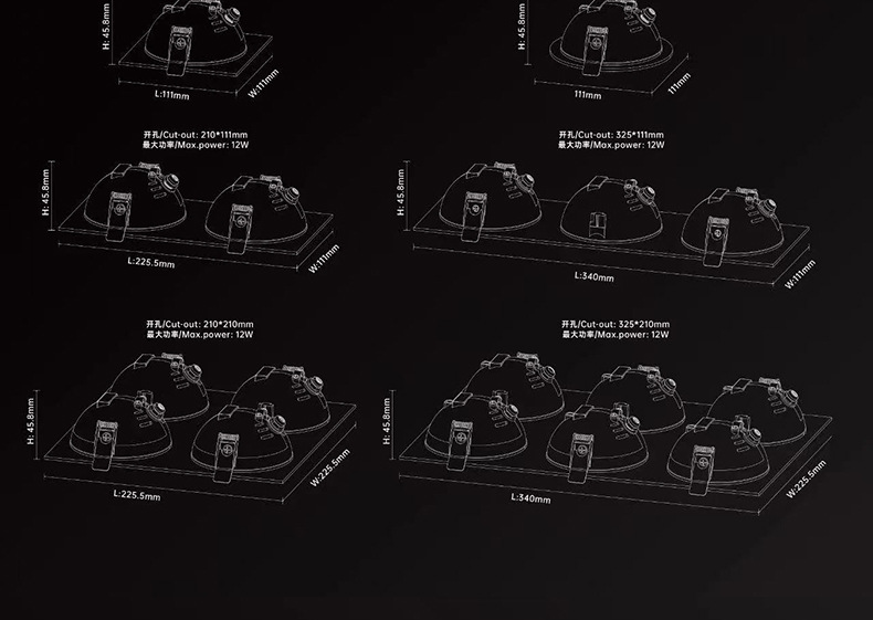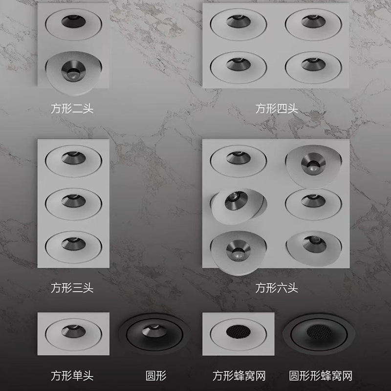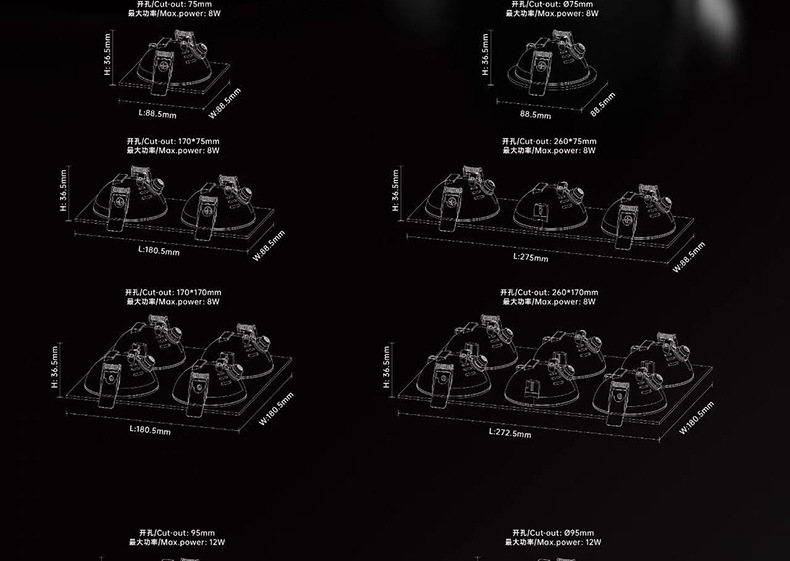 Круглый тип-08W [отверстие 75 мм]; Квадратный тип-08W [открытие 75*75мм]; Круглый тип-12 Вт [отверстие 95 мм]; Квадратный тип-12 Вт [открытие 95*95 мм]; Двухголовочный квадратный светильник типа 16W [монтажное отверстие 75*170 мм]; Двухголовочный квадратный светильник 24 Вт [монтажное отверстие 95*210 мм]; Трёхголовочный квадратный светильник типа 24W [монтажное отверстие 75*260 мм]; Трёхголовочный квадратный светильник, тип 36W [монтажное отверстие 95*325 мм]; Четырехголовочный квадратный светильник, тип 32W [монтажное отверстие 170*170 мм]; Четырехголовочный квадратный светильник, тип 48W [монтажное отверстие 210*210 мм]