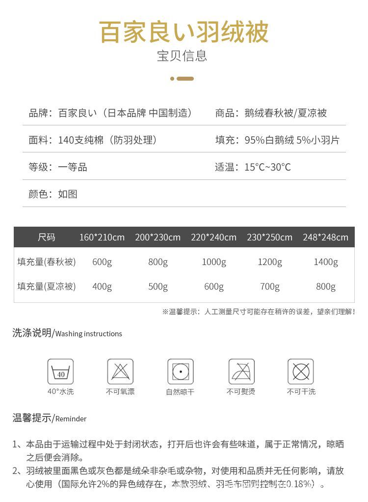 普及一下羽绒被的常规知识:那些几百元的被子顶多检验口一格是羽绒,里面都是飞丝,飞丝就是一些鸡毛鸭毛打成的丝,没有蓬松度而且有味道,他们的厚度是靠加大填充量,所以大家经常会看到宣传鹅绒被有8斤10斤的,这完全是一堆鸡丝鸭丝撑满了被子的厚度,虽然摸起来厚厚软软的,但是用起来会一坨一坨的,没有羽绒被的轻盈透气感,碰上阴雨天会泛味,如果外面的面料差一点,用一段时间还会跑丝,总之是麻烦一大堆,如果你们想买这种所谓的“羽绒被”,建议不如买100多元的化纤被,清仓只有几百元的,全是一种说辞罢了,看货真不真,首先要算一下真货的原材料加起来大约在什么价格范围,如果售价远低于原材料,不是你捡了便宜,而是你买了假货!