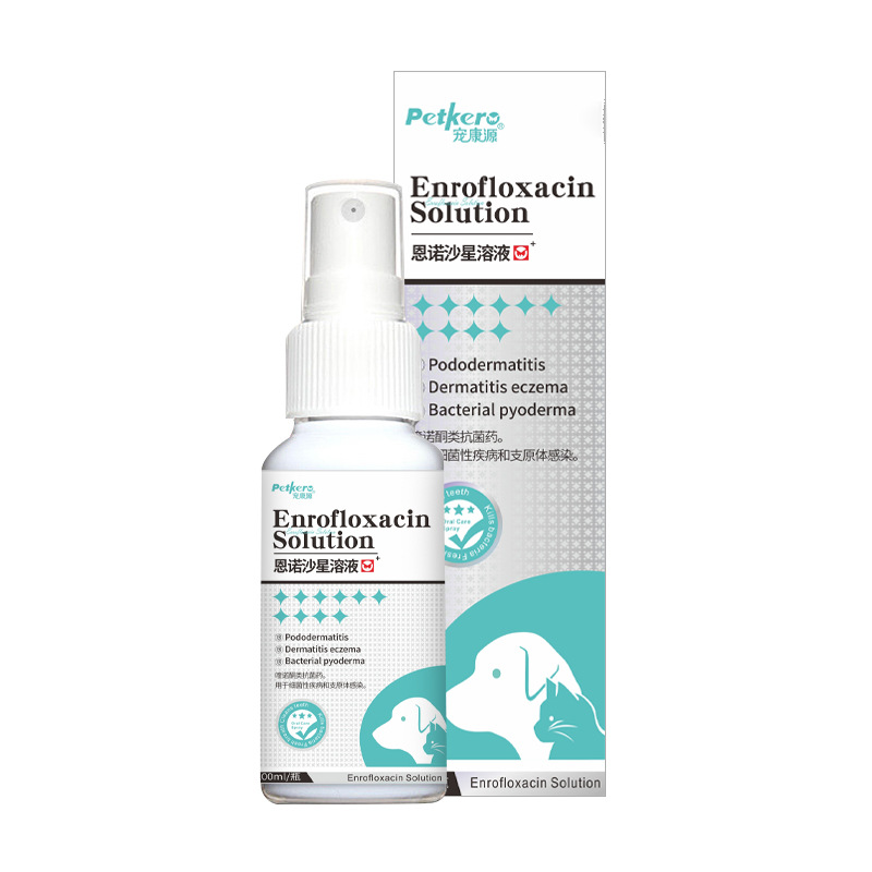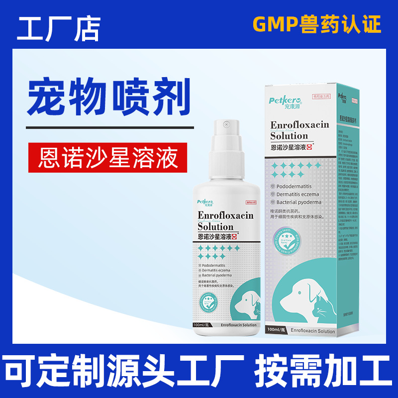 Спрей для дерматологии животных на основе энрофлоксацина для лечения кожных заболеваний, устранения дерматита, удаления экземы и лечения лишая.