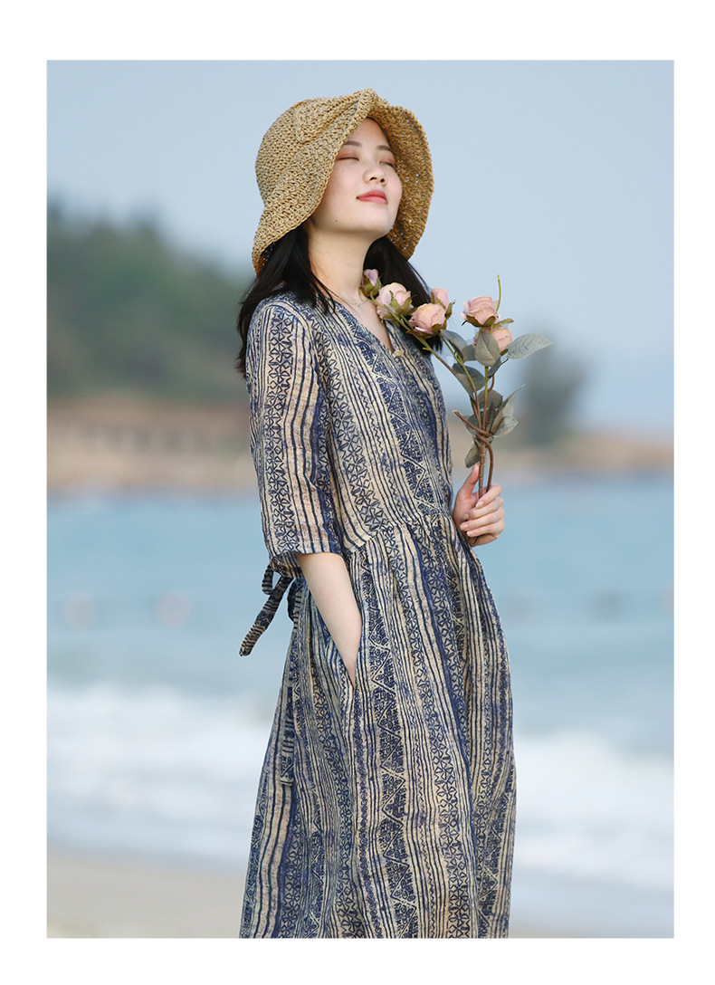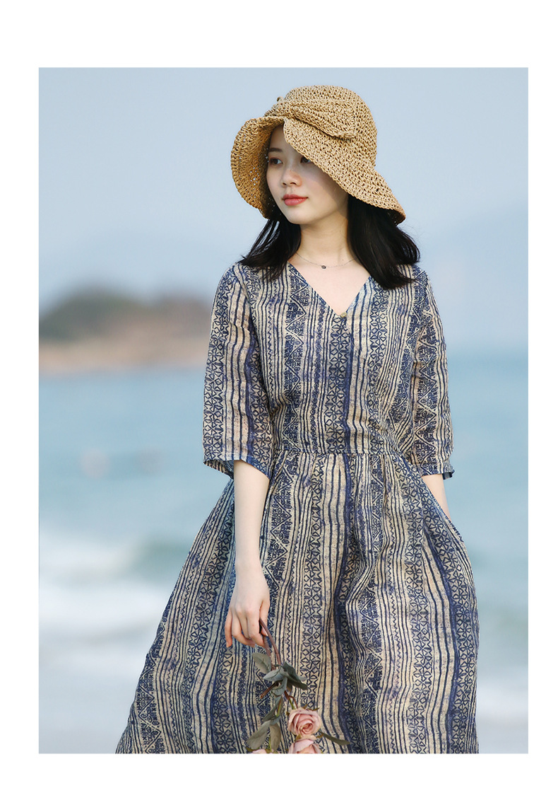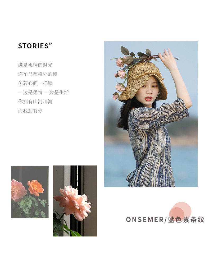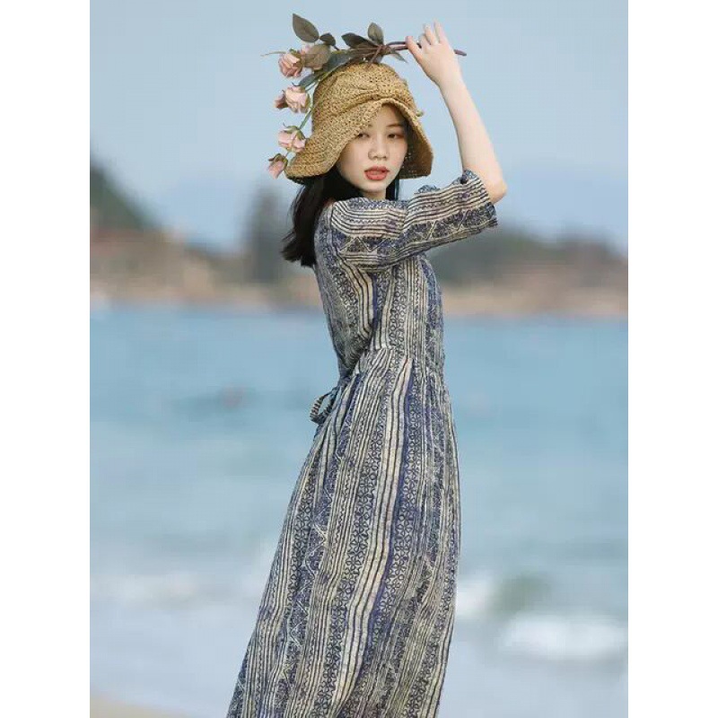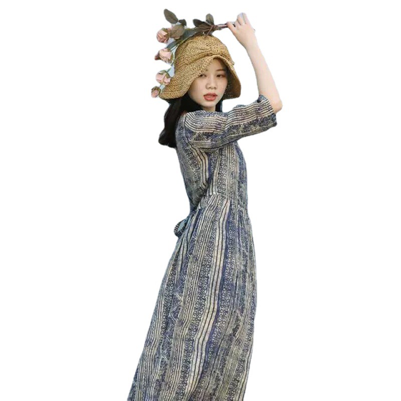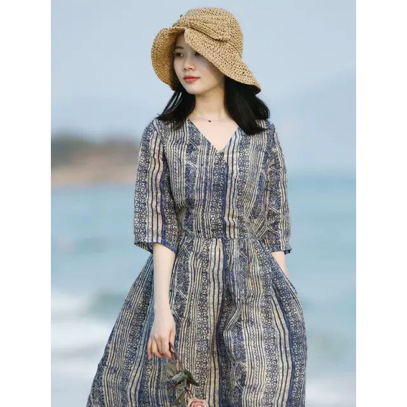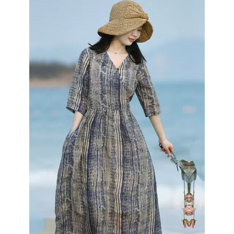 Весна/Лето 2026: Ретро-платье свободного кроя больших размеров для женщин, в стиле «lazy», с полосатым элегантным принтом, приталенное, длинное, из рами.