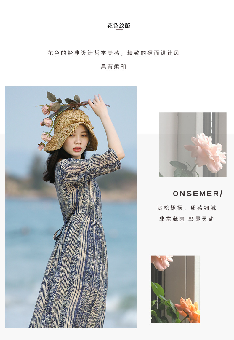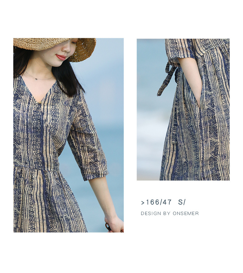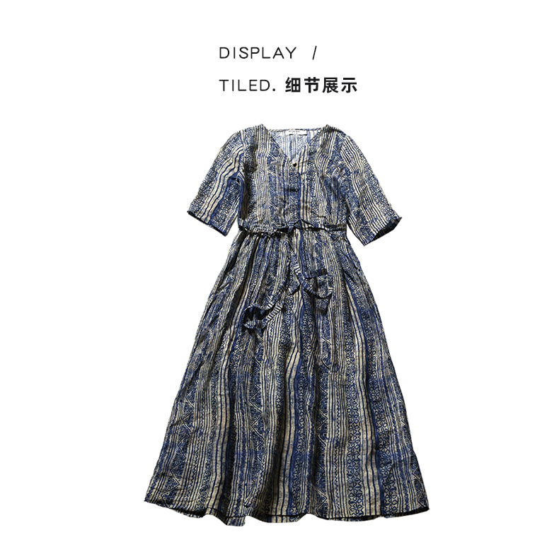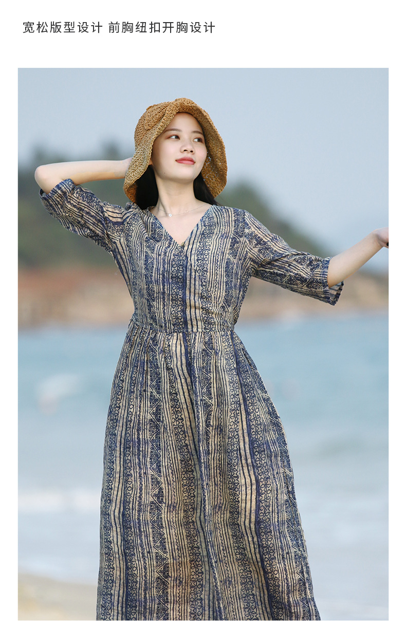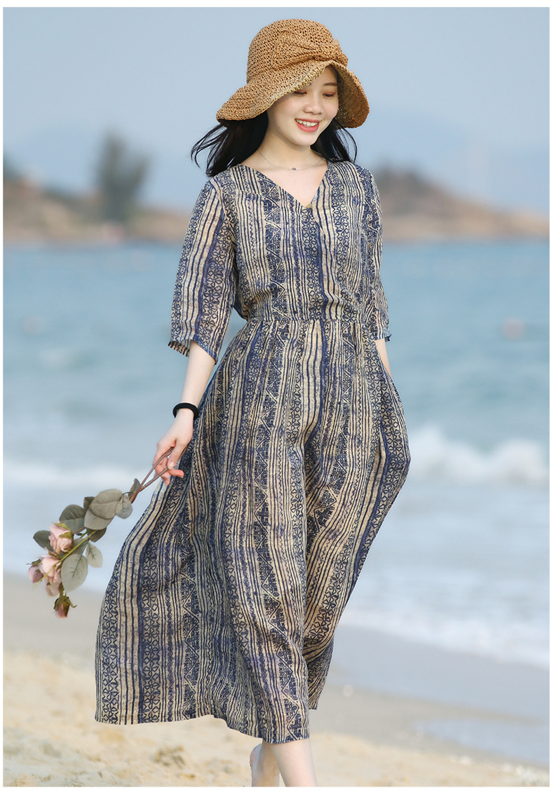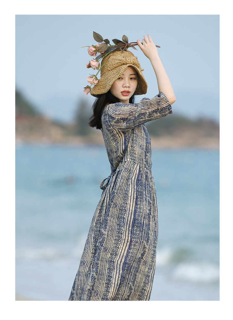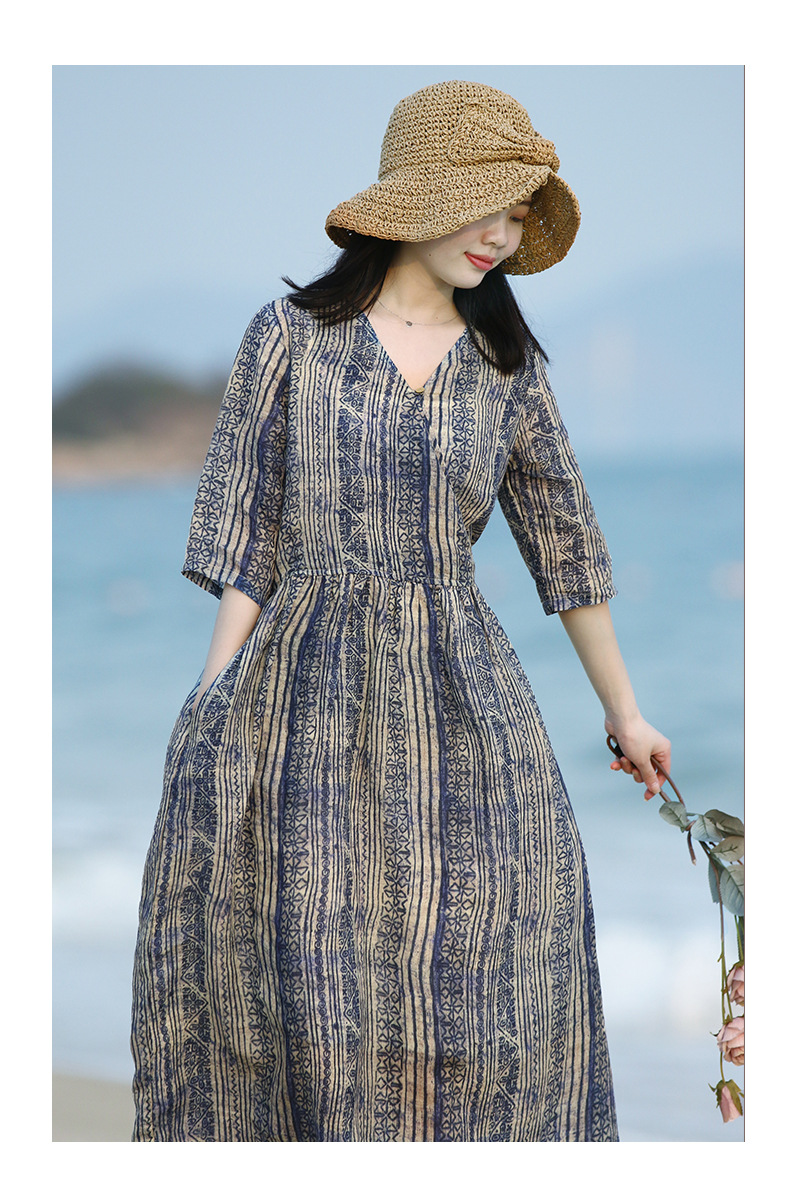 Весна/Лето 2026: Ретро-платье свободного кроя больших размеров для женщин, в стиле «lazy», с полосатым элегантным принтом, приталенное, длинное, из рами.