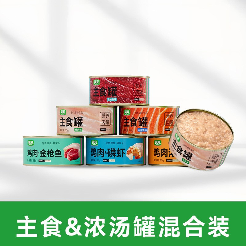 Тщательно отобранный основной продукт консервированный лосось 85г; Суп консервированный куриный 170г; Куриный суп в банке 85г.; Консервированный утиный суп, 85 г; Кремовая увлажняющая курица с криллом, банка 85 г; Насыщенный суп с курицей и тунцом, увлажняющий, банка 85 г; Консервированный лосось, основной продукт, 85 г; Основное блюдо: курица, 85 г; Основное блюдо: консервированный тунец, 85 г; Смешанная зерновая консервированная еда (ассорти); Смешанная банка с супом из измельченного мяса (более свежий вкус); Смешанный набор консервов с основными продуктами и супами (съешьте мясо и утолите жажду одновременно)