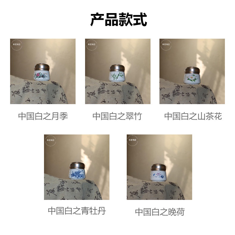 Китайский красный (золотой пион); Император Желтый (Золотой Пион); Китайский белый (розовый); Китайский белый (зеленый бамбук); Китайская белизна (Камелия); Китайский белый (синий и белый пион); Китайский белый (поздний голландский); Подарочная коробка One; Подарочная коробка двойка (двойные банки)