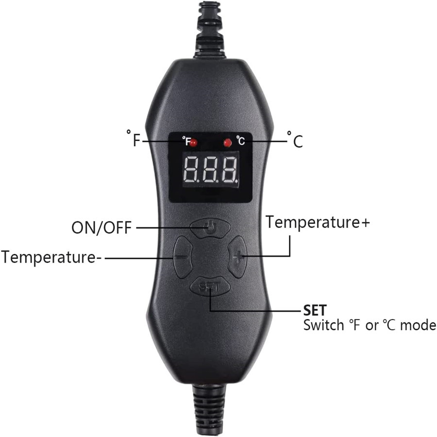 开机时,显示屏由显示OFF改为显示当前测量的温度且为华氏度模式,华氏度指示灯亮,如需切换聂氏度,按下SET键,可切换,显示屏默认显示的是感温线的实际温度,显示屏温度指数会根据你设定的温度以及环境温度变化,如需看设定的多少温度的话,需要快速双击SET键,进入调温度环节,显示屏显示的就是你设定的温度,如需看加热垫升温中温度指数过程的话,需把感温线的感温头放在加热垫上,显示屏上会有温度指数的变化,使用时,加热垫产品一定要平铺,