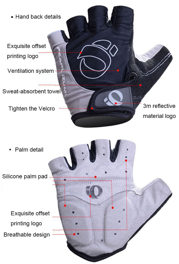 拇指部位采用毛巾布,可用于运动中擦汗,拇指和食指部位采用超纤维,贴皮双线多处压缝,使虎口部位更耐磨,手掌采用超纤耐磨、硅胶,令骑行时可以减震。适宜夏季运动骑行。