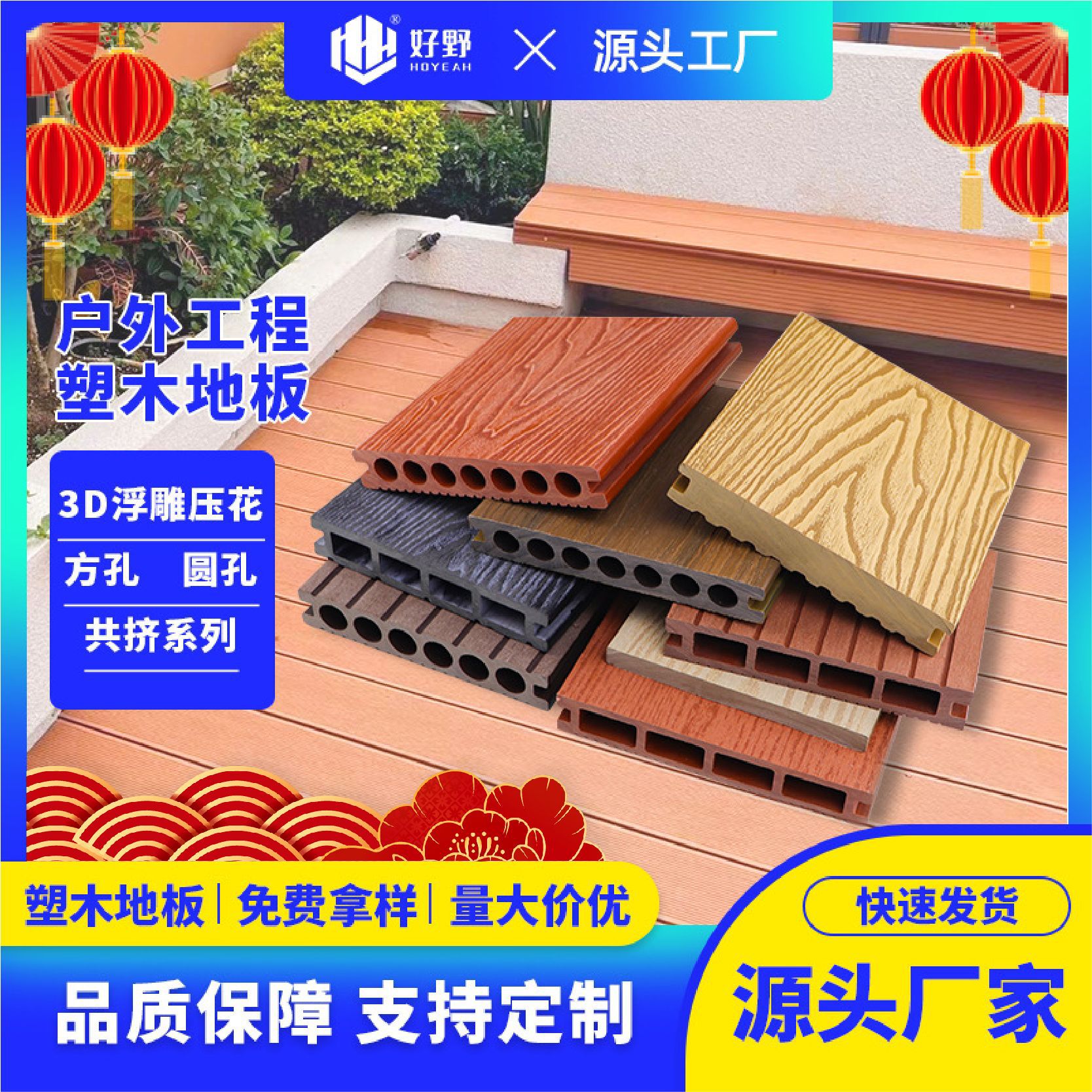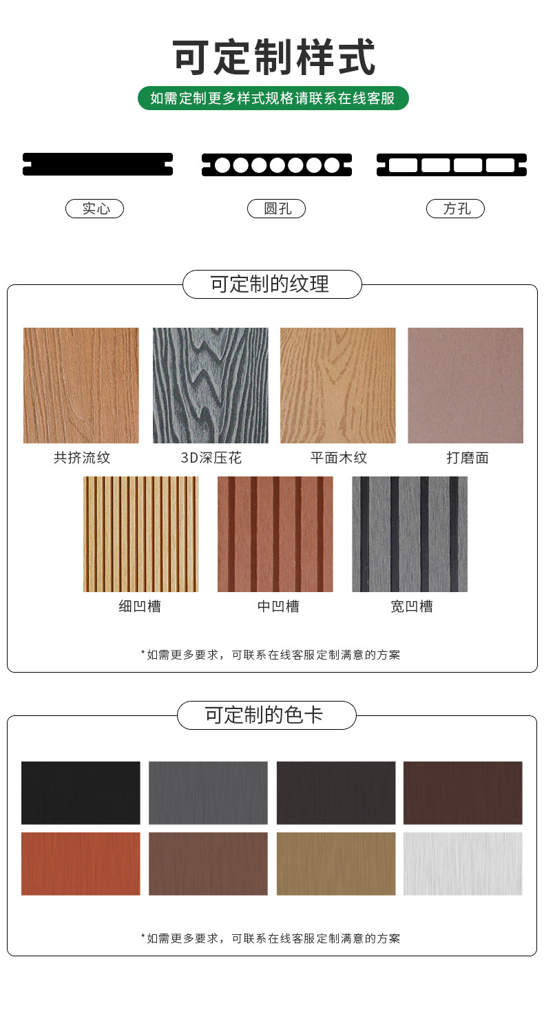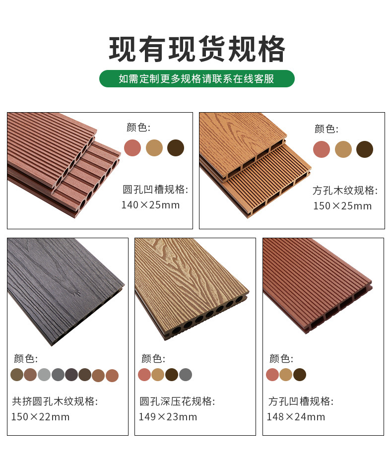 Квадратное отверстие канавка 148*24*3000 мм; Квадратное отверстие под дерево 150*25*3000 мм; Квадратное отверстие 3D рельефное деревянное зерно 150*23 мм; Круглая канавка 140*25*3000 мм; Круглое отверстие 3D рельефное деревянное зерно 149*23*3000 мм; Коэкструдированное круглое отверстие 150*22*3000 мм.