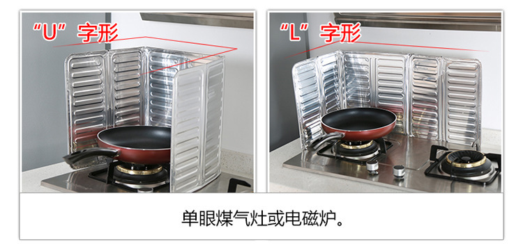 用于厨房内挡溅出来的油和隔热,防止灶台的墙壁沾满油污,周边的塑料调料罐等受热融化、变形。铝质材质,柔软易造型,清洗方便