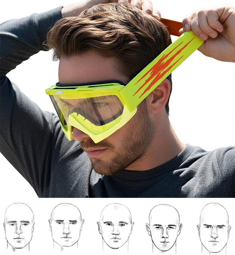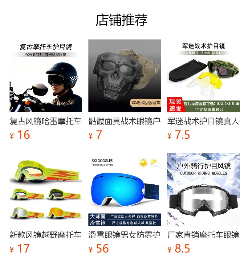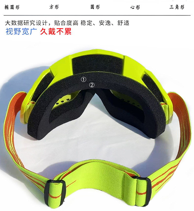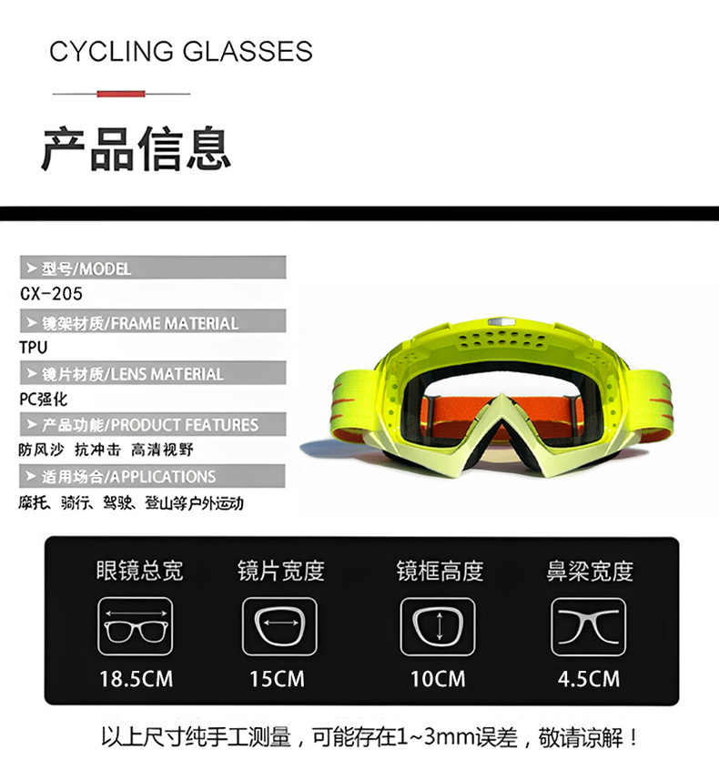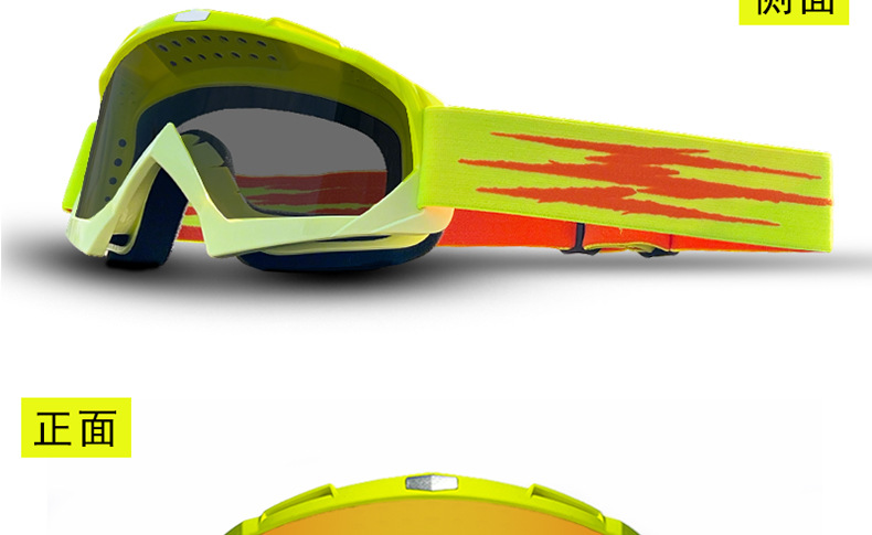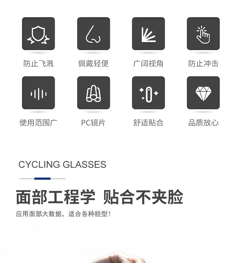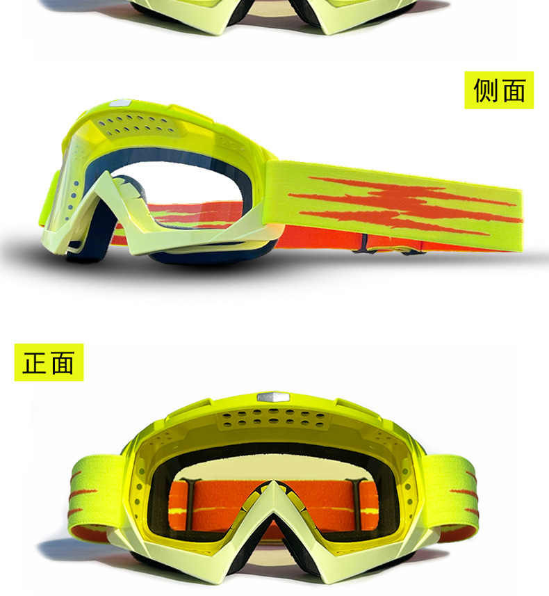 产品卖点:炫酷外观,高清大视野,内部可卡近视眼镜;可适应越野,骑行等场景;内置柔软海绵透气舒适;PC材质镜片更耐摩擦抗冲击,防风沙;
