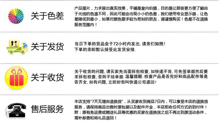 请顾客在签收的的时候一定要先验货再签收,如果快递公司不同意,可以在快递公司当面打开包装以验收物品有无缺损,漏发,褶皱,挤压。如果有问题请直接旺旺在线或电话联系我们协商。如果签收了,就表明货物的完好性,我们将不承担责任哦