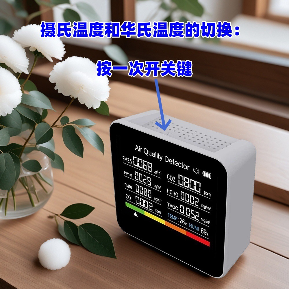 Детектор качества воздуха 9-в-1 2CO9: CO2 (углекислый газ), CO (углеродный оксид), PM2.5 (мелкодисперсные частицы), формальдегид, TVO (твёрдые газообразные частицы) для домашнего использования.