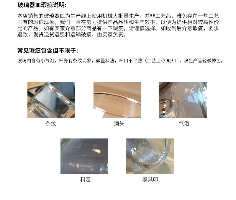 本公司产品只批发不零售,但是金额达到500元支持混批。由于批发数量多货物体积大所以只发物流自己提货,如果需要送货上门物流要另收送货费,(样板件除外)。红酒杯等易碎货物购买前建议支付10元一箱的木架费用,收到货物如有破损请在物流公司拆箱检验,把损坏货物放一起拍照给客服,(3%以外的破损由我们赔付给您)3%以内属于批发运输的正常破损。因为是玻璃易碎品,破损问题不可超过24小时以内,超过时间后果自负哦!!!运费建议客户提货付给物流,这样至少物流在没收到运费前态度会更好一些。我们支持无理由退货,运输过程的破损和运费需买家承担(加工过LOGO的产品除外)。手工产品会有少许的气泡和水纹属于正常现象,追求完美的亲们请谨慎购买!!!!